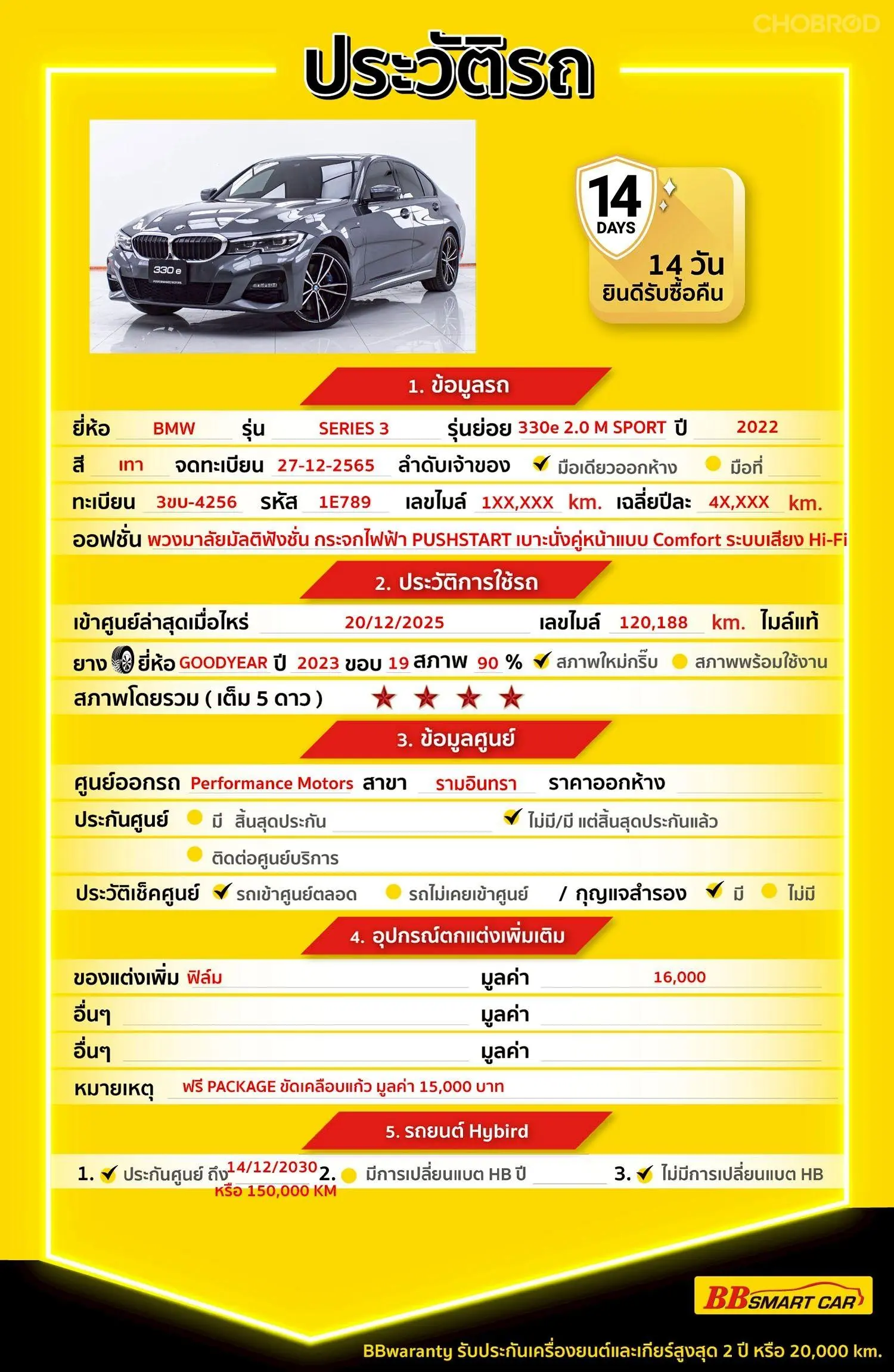 BMW SERIES 3 330E 2.0 M SPORT AT 2022 ออกรถ 0 บาท จัดได้ 989,000 บ . Line : ***********แสดงข้อมูล 🔥จอง 199 บาท ส่งบัตรประชาชน รู้ผลพิจารณาภายใน 30 นาที ไม่ผ่านคืนเงินจองทุกกรณี 🔥ซื้อรถกับ BB พร้อมให้คำปรึกษา แก้ทุกปัญหา ให้ทุกเรื่อง บริการ call center 24 ชม. 🔥BB Care Plus รับประกันหลังการขาย สูงสุด 2 ปี หรือ 20,000 km.. 🔥มีรถให้เลือกมากกว่า 1,800 คัน สาขา 1 สี่แยกมไหสวรรย์ ใกล้เดอะมอลล์ท่าพระ รหัสรถ 1E789 ราคา 969,000 บาท ผ่อนเพียง 16,390 บาท Brand. : BMW Year. : 2022 Model. : SERIES 3 Grade. : 330E 2.0 M SPORT Engine. : 2000 CC Type. : เบนซิน+ไฟฟ้าแบบเสียบปลั๊ก Gearbox : AT Color. : เทา Mileage. : 120,XXX KM. (ซื้อสด ราคานี้ยังไม่รวมค่าดำเนินการ 10,000 บ.) 🚩 Price. 969,000 บาท ยอดจัด : 979,000 บาท เงินดาวน์ : 0 บาท ประกันภัย : ฟรีประกันภัย 1 ปี ค่าดำเนินการ : 10,000 บาท รวมออกรถ : 0 บาท ผ่อน 36 งวด = 30,224 บาท ผ่อน 48 งวด = 22,949 บาท ผ่อน 60 งวด = 20,157 บาท ผ่อน 72 งวด = 18,032 บาท ผ่อน 84 งวด = 16,390 บาท เงื่อนไขเป็นไปตามที่ไฟแนนซ์กำหนด โปรโมชั่นพิเศษ สำหรับลูกค้าเครดิตดีลือกรับเรทดอกเบี้ยพิเศษ 📍36 งวด = 1.29 % 📍48 งวด = 1.99 % 📍60 งวด = 2.39 % 📍72 งวด = 3.59 % 🔥 เงื่อนไข โปรโมชั่น ดอกเบี้ยเริ่มต้น 1.29% ตลอดอายุสัญญา - ยอดจัดไฟแนนซ์ 300,000-600,000 บาท - ผ่อนสูงสุด 72 เดือน - เป็นลูกค้าประวัติดี พนักงานประจำเงินเดือน 20,000 ขึ้นไป - ค่าดำเนินการแคมเปญ 20,000 บาท (รวมในยอดจัดได้) 🎗Car Hightlight รถสวยๆ วันนี้ขอแนะนำ BMW SERIES 3 330E 2.0 M SPORT AT 2022 จุดเด่นออฟชั่น 1 : พวงมาลัยมัลติฟังชั่น 2 : กระจกไฟฟ้า 3 : PUSHSTART 🎗ภายใน ระบบ Comfort Access เบาะนั่งคู่หน้าแบบ Comfort พนักพิงศีรษะตอนหลังแบบปรับพับได้ ภายในห้องโดยสารตกแต่งด้วยลายไม้ Fineline Anthracite พร้อมแถบโครเมี่ยม ม่านบังแดดกระจกบังลมหลัง ปรับด้วยไฟฟ้า ม่านบังแดดประตูคู่หลัง พนักวางแขนกล่องคอนโซลกลาง แบบปรับเลื่อนได้ ปุ่มควบคุม iDrive พร้อมระบบสัมผัส Touch Controller ระบบแผนที่นำทาง Navigation รุ่น Professional ระบบเสียง Hi-Fi 🎗ภายนอก กระจกมองข้างสีเดียวกับตัวรถ มือเปิดประตูภายนอก สีเดียวกับตัวรถ กระจกมองข้างพร้อมไฟเลี้ยว (พับไฟฟ้า,พร้อมไฟส่องสว่างข้างตัวรถ) ไฟตัดหมอก ไฟหน้าส่องสว่างอัตโนมัติ (เปิด-ปิด อัตโนมัติ) ล้ออัลลอย ขนาด 18 นิ้ว ลาย Multi-Spoke ตัวรถสีเทา เรียบหรูดูแพง ไม่มีน้ำท่วม ไม่มีชนหนักแน่นอนค่ะ 🎗ความคุ้มค่า สำหรับคันนี้หากเปรียบเทียบราคากับคุณภาพ คันนี้ถือว่าคุ้มค่ามากค่ะ ผ่อนสบายๆก็มีรถขับได้ รถดีมีคุณภาพแบบนี้รีบตัดสินใจซื้อได้เลยราคานี้มาไวไปไวนะคะ ⭐️การรับประกันหลังการขาย BB Care Plus สูงสุด 2 ปี หรือ 20,000 km. ด้วยช่างที่ผ่านการอบรมจากศูนย์ชั้นนำของประเทศ 🎉Special offer เฉพาะ บีบีสมาร์ทคาร์ ที่นี่ที่เดียว ⭐ดอกเบี้ยเริ่มต้น 1.29% มีไฟแนนซ์รองรับหลายที่ค่ะ ⭐ฟรี!! แพคเก็จ ขัดเคลือบแก้ว มูลค่า 15,000 บาท ทุกคัน ⭐อนุมัติไว 30 นาที นำเอกสารมาให้ครบรับรถกลับบ้านทันทีค่ะ ⭐B