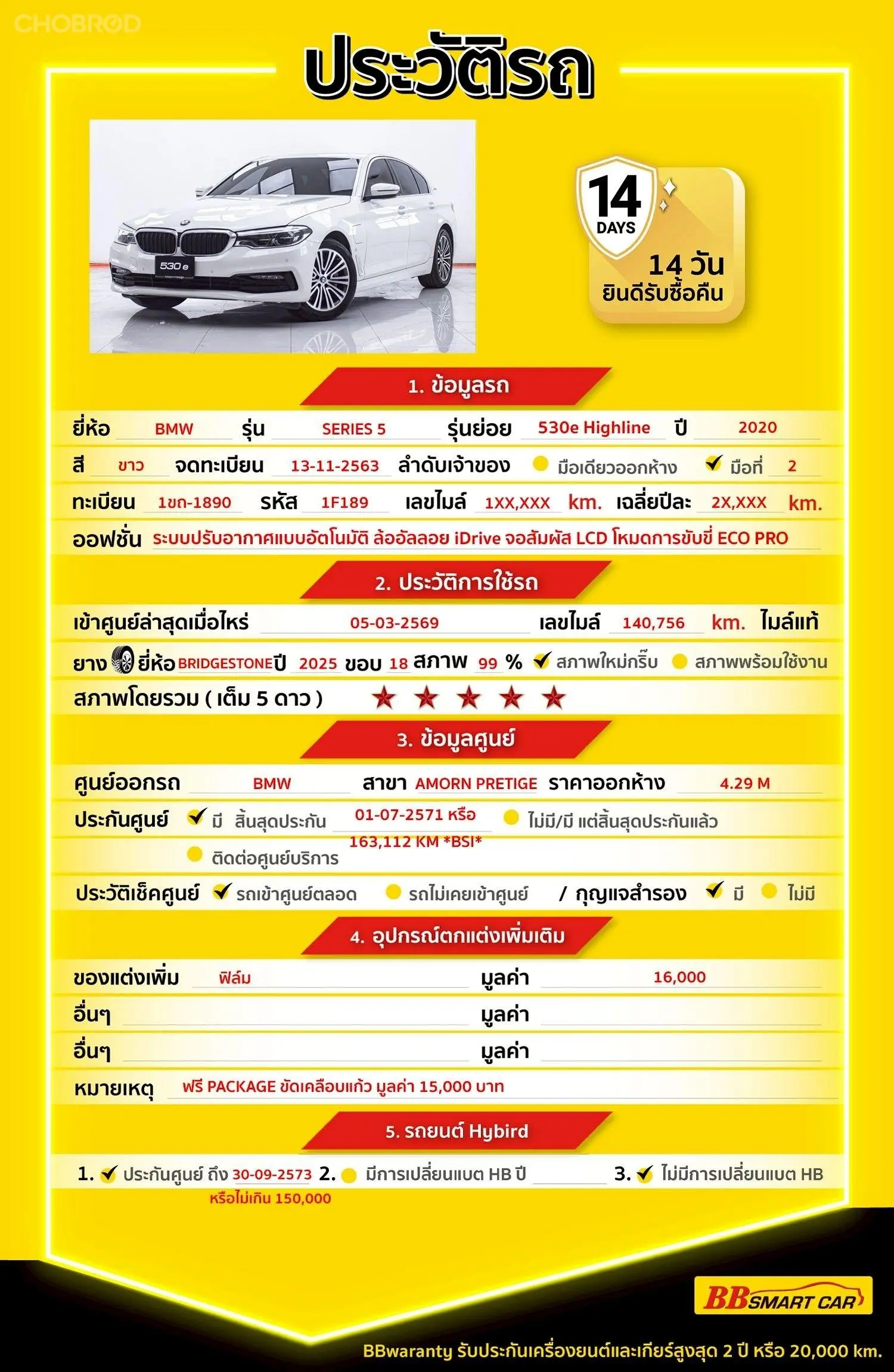 BMW SERIES 5 530E 2.0 HIGHLINE G30 AT 2020 ออกรถ 0 บาท จัดได้ ้ 819,000 บ. Line:@******แสดงข้อมูล 📍BBsmartcar สาขา 1 สี่แยกมไหสวรรย์ BMW SERIES 5 530E 2.0 HIGHLINE G30 AT 2020 💸price 799,000 บาท *** Highlight *** 530E HIGHLINE สีขาว ALPINE WHITE ปี 2018 จดทะเบียน 2020 รถซีดานหรูปลั๊กอินไฮบริด (PHEV) วิ่งเพียง 141,XXX KM. ยังเหลือ วารันBSI ถึง วันที่ 01-07-2571 หรือไม่เกิน 163,112 KM. ประกันแบต HB ถึง วันที่ 30-09-2573 หรือไม่เกิน 150,000 KM. จากศูนย์ AMORN PRETIGE ประวัติดี ไร้อุบัติเหตุ เจ้าของใช้น้อย สภาพป้ายแดงคุ้มมาก ประหยัดจากป้ายแดงได้ถึง 3.3 ล้านบาท 💎รับประกันไมล์แท้ 100% กรณีตรวจพบการกรอไมล์ ยินดีคืนเงินเต็มจำนวน 💎รับประกันโครงสร้างรถ ไม่เคยประสบอุบัติเหตุหนัก พลิกคว่ำ น้ำท่วม หรือไฟไหม้ โครงสร้างและแชสซีอยู่ในสภาพสมบูรณ์ สติกเกอร์และแผ่นเพลทครบถ้วน 💎BB Care Plus รับประกันหลังการขายสูงสุด 2 ปี หรือ 20,000 km. 💎ไม่พอใจ ยินดีคืนเงินภายใน 14 วัน 🔥คลิ๊กที่ลิงก์เพื่อดู วิดีโอคันนี้,ประวัติรถ,รูปภาพภายนอกและรูปภายใน https://www.bbsmartcar.com/web-php/index.php/site/cardetail/20260313435ED9B63A0A 🔥เรามีรถรุ่นนี้ให้เลือกชมอีก 6 คัน https://www.bbsmartcar.com/web-php/index.php/site/car?name_brand=BMW&modelCar=SERIES_5&search=one 🔥มีรถให้เลือกมากกว่า 1,800 คัน https://www.bbsmartcar.com/web-php/index.php/site/home NO. 1F189 Brand. : BMW Year. : 2020 Model. : SERIES 5 Grade. : 530E 2.0 HIGHLINE G30 Engine. : 2000 CC Type. : เบนซิน+ไฟฟ้า Gearbox : AT Color. : ขาว Mileage. : 141,XXX KM. (ซื้อสด ราคานี้ยังไม่รวมค่าดำเนินการ 10,000 บ.) เงินดาวน์ : 0 บาท ประกันภัย : ฟรีประกันภัย 1 ปี ค่าดำเนินการ : 10,000 บาท รวมออกรถ : 0 บาท ผ่อน 72 งวด = 14,901 บาท ผ่อน 84 งวด = 13,544 บาท จุดเด่นออฟชั่น 1 : เครื่องยนต์เบนซิน 4 สูบ 2.0 ลิตร 1,998 ซีซี. Twin Power Turbo กำลังสูงสุด 184 แรงม้า (PS) ที่ 5,000 – 6,500 รอบ/นาที แรงบิดสูงสุด 290 นิวตันเมตร ที่ 1,350 – 4,250 รอบ/นาที จับคู่กับเกียร์อัตโนมัติ 8 จังหวะ 2 : Steptronic ทำงานร่วมกับ มอเตอร์ไฟฟ้า synchronous electric motor ให้กำลังสูงสุด 113 แรงม้า (PS) ที่ 2,500 รอบ/นาที แรงบิด 250 นิวตันเมตร ที่ 0-2,500 รอบ/นาที รวมการทำงานของเครื่องยนต์และมอเตอร์ไฟฟ้า 3 : จะได้กำลังสูงสุด 252 แรงม้า แรงบิดสูงสุด 420 นิวตันเมตร มีฟังก์ชั่น electric boost ช่วยในด้านอัตราเร่งโดยมอเตอร์ไฟฟ้า ตั้งแต่ 100 ถึง 250 นิวตันเมตร 🎗ภายใน * ภายในห้องโดยสาร สีน้ำตาลอ่อน Cognac Exclusive Stitching / Piping in * เบาะนั่งหุ้มด้วยหนัง Dakota * เบาะนั่งคู่หน้าแบบสปอร์ต * เบาะนั่งคู่หน้า ปรับด้วยไฟฟ้า พร้อม Memory Seat ฝั่งคนขับ * พวงมาลัยหุ้มหนัง แบบ M Sport * แป้นเปลี่ยนเกียร์ที่พวงมาลัย Gearshift Paddles * มาตรวัดแบบดิจิตอล ขนาด 12.3 นิ้ว * ระบบปรับระดับพวงมาลัย ด้วยระบบไฟฟ้า * ระบบปรับอากาศแบบอัตโนมัติ แยกอิสระ 2 Zones * ชุดไฟส่องสว่าง ภายใน และ ภายนอก * ไฟสร้างบรรยากาศในห้องโดยสาร Ambient Light 6 สี * ม่านบังแดดที่ประตูคู่หลัง * ม่านบังแดดที่กระจกบังลมหลัง 🎗ภายนอก * ล้อ BRIDGESTONE ปี 25 ขอบ 18 * กระจกมองข้าง ปรับและพับด้วยไฟฟ้า พร้อมไฟเลี้ยวในตัว * เสาอากาศครีบฉลาม Shark Fin * มือเปิดประตู