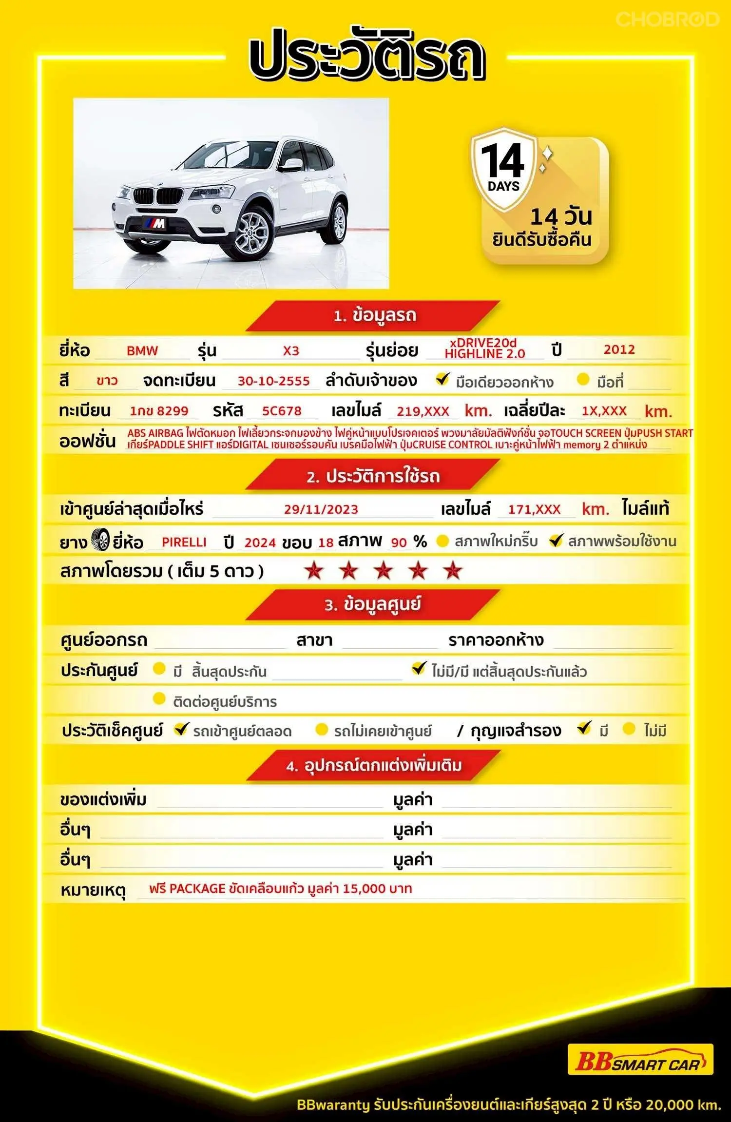 BBsmartcar สาขา 5 ถ.เศรษฐกิจ ใกล้โลตัสมหาชัย BMW X3 2.0d HIGHLINE F25 AT 2012 💸price 439,000 บาท *** Highlight *** X3 xDRIVE20d HIGHLINE ปี 2012 สี Alpine White (Alpinweiss 3) SUV ดีเซลพรีเมียม ขับเคลื่อน 4 ล้อ xDrive วิ่ง 219,xxx กม. รถศูนย์แท้ ประวัติดี ประหยัดจากราคาป้ายแดงได้ถึง 3,000,000 กว่าบาท 💎รับประกันโครงสร้างรถ ไม่เคยประสบอุบัติเหตุหนัก พลิกคว่ำ น้ำท่วม หรือไฟไหม้ โครงสร้างและแชสซีอยู่ในสภาพสมบูรณ์ 💎BB Care Plus รับประกันหลังการขายสูงสุด 2 ปี หรือ 20,000 km. 💎ไม่พอใจ ยินดีคืนเงินภายใน 14 วัน 🔥คลิ๊กที่ลิงก์เพื่อดู วิดีโอคันนี้,ประวัติรถ,รูปภาพภายนอกและรูปภายใน https://www.bbsmartcar.com/web-php/index.php/site/cardetail/2026031252B623B4502C 🔥เรามีรถรุ่นนี้ให้เลือกชมอีก 5 คัน https://www.bbsmartcar.com/web-php/index.php/site/car?name_brand=BMW&modelCar=X3&search=one 🔥มีรถให้เลือกมากกว่า 1,800 คัน https://www.bbsmartcar.com/web-php/index.php/site/home NO. 5C678 Brand. : BMW Year. : 2012 Model. : X3 Grade. : 2.0d HIGHLINE F25 2012 Engine. : 2000 CC Type. : ดีเซล Gearbox : AT Color. : สีขาว Mileage. : 219,XXX KM. (ซื้อสด ราคานี้ยังไม่รวมค่าดำเนินการ 10,000 บ.) เงินดาวน์ : 0 บาท ประกันภัย : ฟรีประกันภัย 1 ปี ค่าดำเนินการ : 10,000 บาท รวมออกรถ : 0 บาท ผ่อน 72 งวด = 9,275 บาท ผ่อน 84 งวด = 8,722 บาท จุดเด่นออฟชั่น BMW X3 2.0d HIGHLINE F25 ปี 2012 12.2.1 :ไฟหน้า Projector Bi-Xenon 12.2.2 : เบาะคู่หน้าไฟฟ้า memory 2 ตำแหน่ง 12.2.3 : พวงมาลัย multifunction-Cruise control -Push 🎗ภายใน ห้องโดยสาร & ความสะดวกสบาย วิทยุ - CD เกียร์ Paddle Shift จอ LCD เล่น DVD Navigator แอร์ AUTO เบรกมือไฟฟ้า Airbag เบรค ABS กระจกไฟฟ้า เบาะไฟฟ้าคู่หน้า เซ็นทรัลล๊อก เบาะหนัง พวงมาลัย Multifunction ไมล์ Digital Cruise Control 🎗ภายนอก ดีไซน์ภายนอกหรูหรา กระจกมองข้างปรับไฟฟ้า ไฟตัดหมอก ไฟเลี้ยวกระจกมองข้าง กระจกมองข้างพับไฟฟ้า แล็คหลังคา ไฟโปรเจคเตอร์ 🎗ความคุ้มค่า สำหรับคันนี้หากเปรียบเทียบราคากับคุณภาพ คันนี้ถือว่าคุ้มค่ามากค่ะ ผ่อนสบายๆก็มีรถขับได้ รถดีมีคุณภาพแบบนี้รีบตัดสินใจซื้อได้เลราคานี้มาไวไปไวนะคะ ⭐️การรับประกันหลังการขาย BB Care Plus สูงสุด 2 ปี หรือ 20,000 km. ด้วยช่างที่ผ่านการอบรมจากศูนย์ชั้นนำของประเทศ 🎉Special offer เฉพาะ บีบีสมาร์ทคาร์ ที่นี่ที่เดียว ⭐ดอกเบี้ยเริ่มต้น 1.29% มีไฟแนนซ์รองรับหลายที่ค่ะ ⭐ฟรี!! แพคเก็จ ขัดเคลือบแก้ว มูลค่า 15,000 บาท ทุกคัน ⭐อนุมัติไว 30 นาที นำเอกสารมาให้ครบรับรถกลับบ้านทันทีค่ะ ⭐มี 6 สาขา ในกรุงเทพและปริมณฑลใกล้บ้านท่าน ⭐รถทุกคันผ่านตรวจสอบ Inspection เรียบร้อยแล้วค่ะ ผ่าน 5 ดาวทุกคันค่ะ ⭐เซลล์ทุกท่านเป็นมืออาชีพพร้อมให้บริการทุกท่านแน่นอนค่ะ ⭐เงื่อนไขเป็นไปตามที่ไฟแนนซ์กำหนด