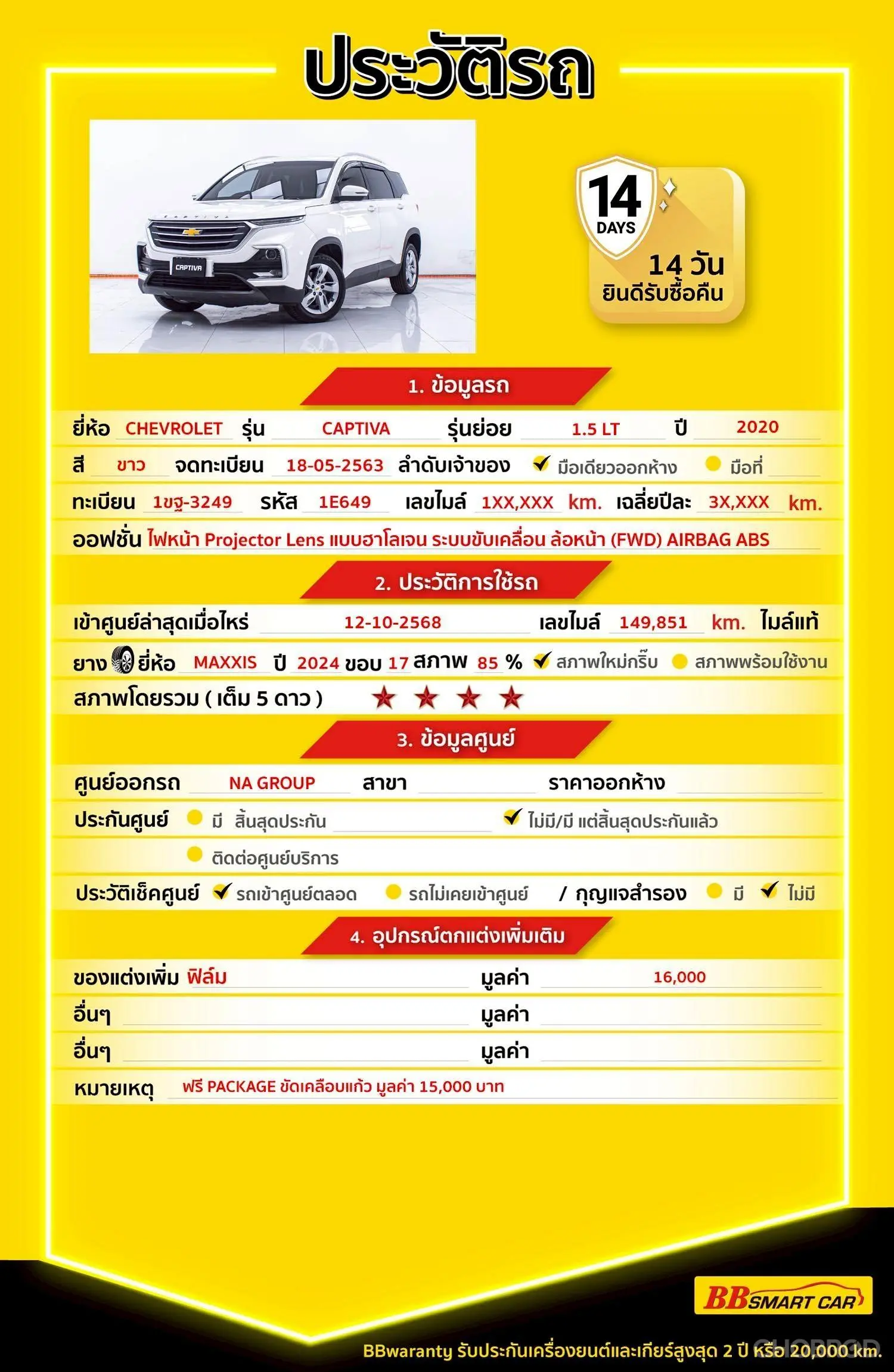 มีการรับประกันจากดีลเลอร์ (6 เดือน) มีบริการช่วยเหลือฉุกเฉินบนท้องถนน 24 ชม. จากดีลเลอร์