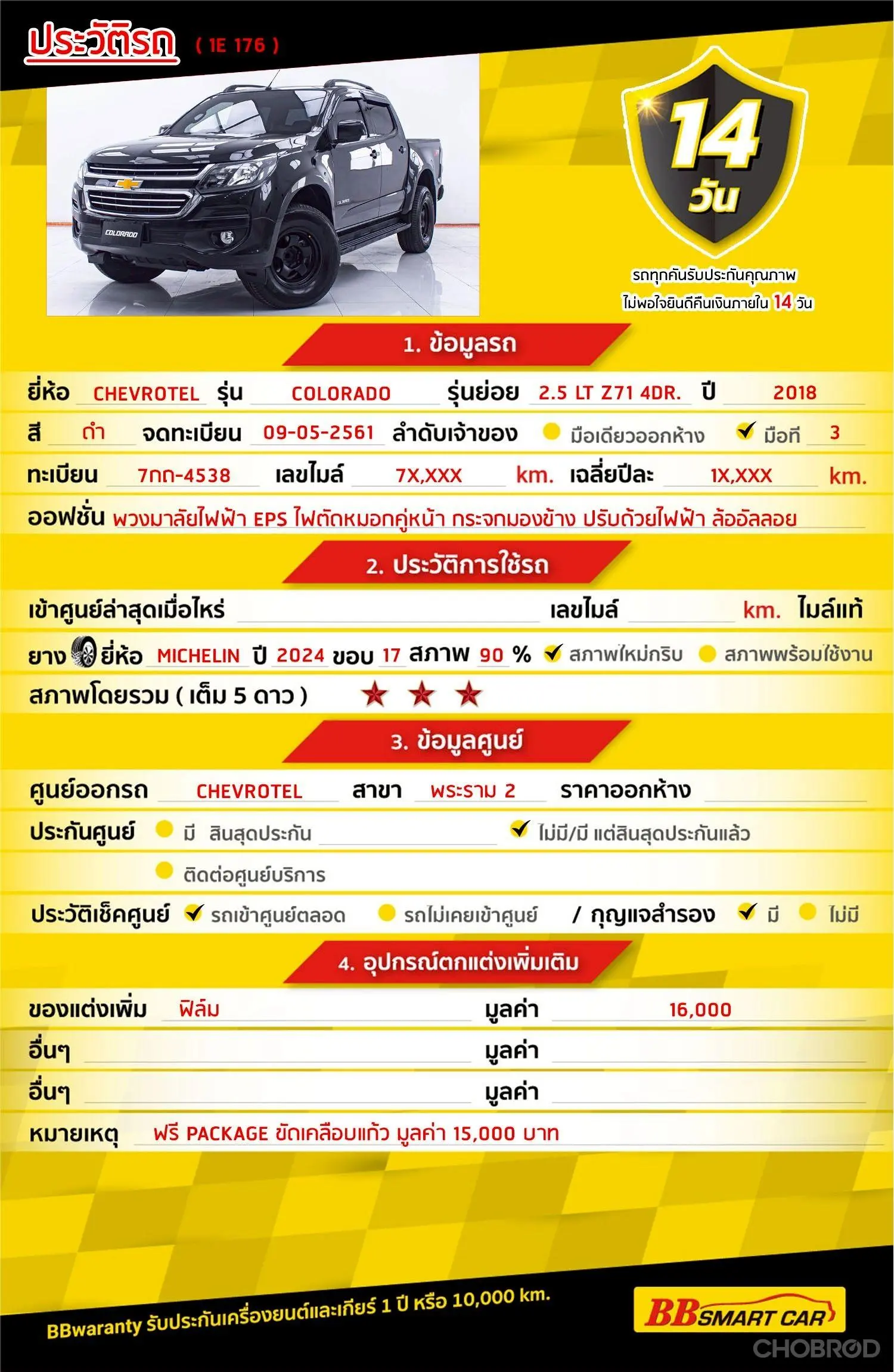 CHEVROLET COLORADO 2.5 LT Z71 4DR. AT 2018 ออกรถ 0 บาท จัดได้ 359,000 Line:@**********แสดงข้อมูล 🔥จอง 199 บาท ส่งบัตรประชาชน รู้ผลพิจารณาภายใน 30 นาที ไม่ผ่านคืนเงินจองทุกกรณี 🔥ซื้อรถกับ BB พร้อมให้คำปรึกษา แก้ทุกปัญหา ให้ทุกเรื่อง บริการ call center 24 ชม. 🔥BB Care Plus รับประกันหลังการขาย สูงสุด 2 ปี หรือ 20,000 km.. 🔥มีรถให้เลือกมากกว่า 1,600 คัน สาขา 1 สี่แยกมไหสวรรย์ ใกล้เดอะมอลล์ท่าพระ รหัสรถ 1E176 ราคา 339,000 บาท ผ่อนเพียง 5,843 บาท Brand. : CHEVROLET Year. : 2018 Model. : COLORADO Grade. : 2.5 LT Z71 4DR. Engine. : 2500 CC Type. : ดีเซล Gearbox : AT Color. : ดำ Mileage. : 72,XXX KM. (ซื้อสด ราคานี้ยังไม่รวมค่าดำเนินการ 10,000 บ.) 🚩 Price. 339,000 บาท ยอดจัด : 349,000 บาท เงินดาวน์ : 0 บาท ประกันภัย : ฟรีประกันภัย 1 ปี ค่าดำเนินการ : 10,000 บาท รวมออกรถ : 0 บาท ผ่อน 36 งวด = 10,775 บาท ผ่อน 48 งวด = 8,181 บาท ผ่อน 60 งวด = 7,185 บาท ผ่อน 72 งวด = 6,429 บาท ผ่อน 84 งวด = 5,843 บาท เงื่อนไขเป็นไปตามที่ไฟแนนซ์กำหนด โปรโมชั่นพิเศษ สำหรับลูกค้าเครดิตดีลือกรับเรทดอกเบี้ยพิเศษ 📍36 งวด = 1.29 % 📍48 งวด = 1.99 % 📍60 งวด = 2.39 % 📍72 งวด = 3.59 % 🔥 เงื่อนไข โปรโมชั่น ดอกเบี้ยเริ่มต้น 1.29% ตลอดอายุสัญญา - ยอดจัดไฟแนนซ์ 300,000-600,000 บาท - ผ่อนสูงสุด 72 เดือน - เป็นลูกค้าประวัติดี พนักงานประจำเงินเดือน 20,000 ขึ้นไป - ค่าดำเนินการแคมเปญ 20,000 บาท (รวมในยอดจัดได้) 🎗Car Hightlight รถสวยๆ วันนี้ขอแนะนำ CHEVROLET COLORADO 2.5 LT Z71 4DR. AT 2018 จุดเด่นออฟชั่น 1 : พวงมาลัยไฟฟ้า EPS 2 : ล้ออัลลอย ขนาด 16 นิ้ว 3 : กระจกมองข้าง ปรับด้วยไฟฟ้า 🎗ภายใน กุญแจ แบบพับเก็บได้ พร้อมรีโมทคอนโทรล ไฟหน้ามัลติรีเฟลเตอร์ ฮาโลเจน 🎗ภายนอก ไฟตัดหมอกคู่หน้า กระจกมองข้าง พร้อมไฟเลี้ยวในตัว กระจกมองข้าง ปรับด้วยไฟฟ้า กระจังหน้าคาดแถบสีเงิน กันชนหน้าสีเดียวกับตัวรถ กันชนหลังสีดำ มือเปิดประตูภายนอก สีเดียวกับตัวรถ มือเปิดฝากระบะท้ายสีดำ บันไดข้าง 🎗ความคุ้มค่า สำหรับคันนี้หากเปรียบเทียบราคากับคุณภาพ คันนี้ถือว่าคุ้มค่ามากค่ะ ผ่อนสบายๆก็มีรถขับได้ รถดีมีคุณภาพแบบนี้รีบตัดสินใจซื้อได้เลราคานี้มาไวไปไวนะคะ ⭐️การรับประกันหลังการขาย BB Care Plus สูงสุด 2 ปี หรือ 20,000 km. ด้วยช่างที่ผ่านการอบรมจากศูนย์ชั้นนำของประเทศ 🎉Special offer เฉพาะ บีบีสมาร์ทคาร์ ที่นี่ที่เดียว ⭐ดอกเบี้ยเริ่มต้น 1.29% มีไฟแนนซ์รองรับหลายที่ค่ะ ⭐ฟรี!! แพคเก็จ ขัดเคลือบแก้ว มูลค่า 15,000 บาท ทุกคัน ⭐อนุมัติไว 30 นาที นำเอกสารมาให้ครบรับรถกลับบ้านทันทีค่ะ ⭐BB Care Plus รับประกันหลังการขาย สูงสุด 2 ปี หรือ 20,000 km. ⭐มี 6 สาขา ในกรุงเทพและปริมณฑลใกล้บ้านท่าน ⭐รถทุกคันผ่านตรวจสอบ Inspection เรียบร้อยแล้วค่ะ ผ่าน 5 ดาวทุกคันค่ะ ⭐เซลล์ทุกท่านเป็นมืออาชีพพร้อมให้บริการทุกท่านแน่นอนค่ะ