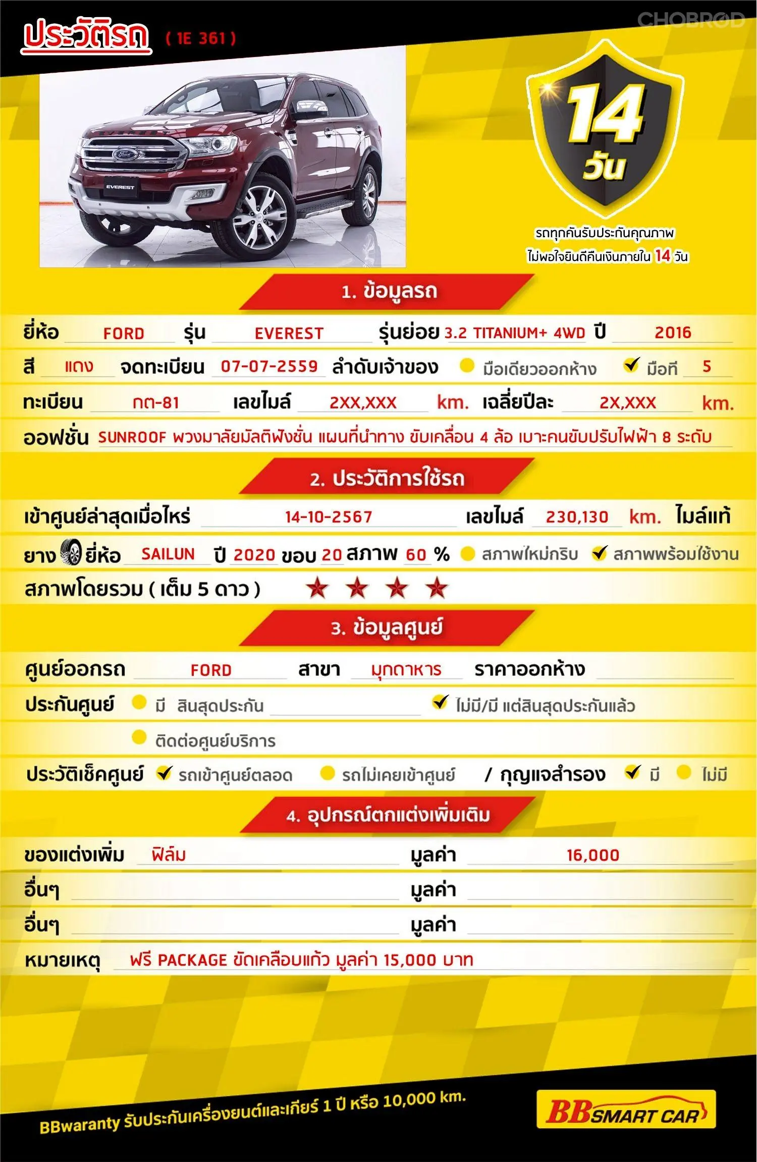 FORD EVEREST 3.2 TITANIUM+ 4WD AT 2016 ออกรถ 0 บาท จัดได้ 529,000 Line:@bbsmartcar 🔥จอง 199 บาท ส่งบัตรประชาชน รู้ผลพิจารณาภายใน 30 นาที ไม่ผ่านคืนเงินจองทุกกรณี 🔥ซื้อรถกับ BB พร้อมให้คำปรึกษา แก้ทุกปัญหา ให้ทุกเรื่อง บริการ call center 24 ชม. 🔥BB Care Plus รับประกันหลังการขาย สูงสุด 2 ปี หรือ 20,000 km.. 🔥มีรถให้เลือกมากกว่า 1,800 คัน สาขา 1 สี่แยกมไหสวรรย์ ใกล้เดอะมอลล์ท่าพระ รหัสรถ 1E361 ราคา 509,000 บาท ผ่อนเพียง 8,688 บาท Brand. : FORD Year. : 2016 Model. : EVEREST Grade. : 3.2 TITANIUM+ 4WD Engine. : 3200 CC Type. : ดีเซล Gearbox : AT Color. : แดง Mileage. : 240,XXX KM. (ซื้อสด ราคานี้ยังไม่รวมค่าดำเนินการ 10,000 บ.) 🚩 Price. 509,000 บาท ยอดจัด : 519,000 บาท เงินดาวน์ : 0 บาท ประกันภัย : ฟรีประกันภัย 1 ปี ค่าดำเนินการ : 10,000 บาท รวมออกรถ : 0 บาท ผ่อน 36 งวด = 16,023 บาท ผ่อน 48 งวด = 12,166 บาท ผ่อน 60 งวด = 10,685 บาท ผ่อน 72 งวด = 9,559 บาท ผ่อน 84 งวด = 8,688 บาท เงื่อนไขเป็นไปตามที่ไฟแนนซ์กำหนด โปรโมชั่นพิเศษ สำหรับลูกค้าเครดิตดีลือกรับเรทดอกเบี้ยพิเศษ 📍36 งวด = 1.29 % 📍48 งวด = 1.99 % 📍60 งวด = 2.39 % 📍72 งวด = 3.59 % 🔥 เงื่อนไข โปรโมชั่น ดอกเบี้ยเริ่มต้น 1.29% ตลอดอายุสัญญา - ยอดจัดไฟแนนซ์ 300,000-600,000 บาท - ผ่อนสูงสุด 72 เดือน - เป็นลูกค้าประวัติดี พนักงานประจำเงินเดือน 20,000 ขึ้นไป - ค่าดำเนินการแคมเปญ 20,000 บาท (รวมในยอดจัดได้) 🎗Car Hightlight รถสวยๆ วันนี้ขอแนะนำ FORD EVEREST 3.2 TITANIUM+ 4WD AT 2016 จุดเด่นออฟชั่น 1 : SUNROOF 2 : พวงมาลัยมัลติฟังชั่น 3 : แผนที่นำทาง Navigator แสดงผลบนหน้าจอสีอัจฉริยะสั่งงานด้วยระบบกดสัมผัสแบบ 4 : เบาะหนังแบบปรับไฟฟ้าอัตโนมัติ ด้วยปุ่มกดสั่งงาน รอบห้องโดยสาร 5 : ขับเคลื่อน 4 ล้อ 🎗ภายใน ประกอบไปด้วย เบาะคู่ 2 ที่นั่งด้านหน้า ปรับไฟฟ้า เบาะคนขับปรับไฟฟ้า 8 ระดับ เบาะแถวหลัง 2 ที่นั้งตอนสุดท้าย พับเก็บ เปิด / ปิด ด้วยระบบไฟฟ้า และฝาท้าย เปิด / ปิด อัตโนมัติ ด้วยปุ่มกดสั่งงาน ระบบไฟฟ้า :ระบบควบคุมความเร็วแบบรักษาระยะห่างอัตโนมัติ (Adaptive Cruise Control) - ระบบช่วยควบคุมรถให้อยู่ในช่องทาง (Lane Keeping System) - ระบบเตือนการชนด้านหน้า (Forward Collision Warning System) - ระบบแจ้งเตือนการขับขี่ (Driver Alert System) - ระบบเปิด-ปิดไฟสูงอัจฉริยะ (Auto High Beam Control) พวงมาลัยมัลติฟังก์ชั่น เบาะหนัง ABS Airbag 🎗ภายนอก กระจกมองข้าง ปรับและพับด้วยไฟฟ้า พร้อมไฟเลี้ยวในตัว ไฟ Daytime Running Light ไฟตัดหมอกหลัง ไฟท้ายแบบ LED ที่ปัดหมอกด้านหลัง ล้อแมกซ์ 20" 🎗ความคุ้มค่า สำหรับคันนี้หากเปรียบเทียบราคากับคุณภาพ คันนี้ถือว่าคุ้มค่ามากค่ะ ผ่อนสบายๆก็มีรถขับได้ รถดีมีคุณภาพแบบนี้รีบตัดสินใจซื้อได้เลราคานี้มาไวไปไวนะคะ ⭐️การรับประกันหลังการขาย BB Care Plus สูงสุด 2 ปี หรือ 20,000 km. ด้วยช่างที่ผ่านการอบรมจากศูนย์ชั้นนำของประเทศ 🎉Special offer เฉพาะ บีบีสมาร์ทคาร์ ที่นี่ที่เดียว ⭐ดอกเบี้ยเริ่มต้น 1.29% มีไฟแนนซ์รองรับหลายที่ค่ะ ⭐ฟรี!! แพคเก็จ ขัดเคลือบแก้ว มูล
