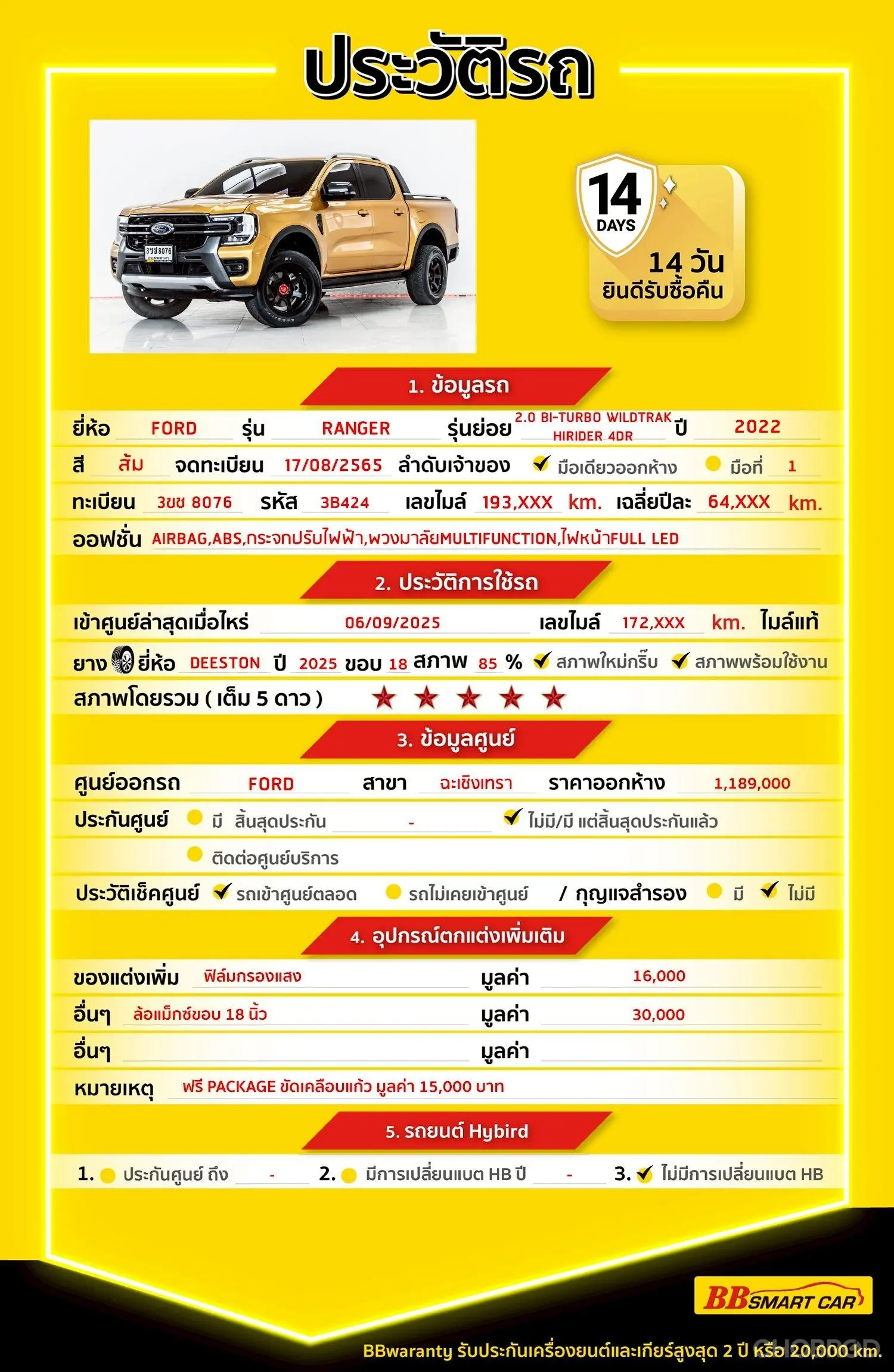 มีการรับประกันจากดีลเลอร์ (6 เดือน) มีบริการช่วยเหลือฉุกเฉินบนท้องถนน 24 ชม. จากดีลเลอร์