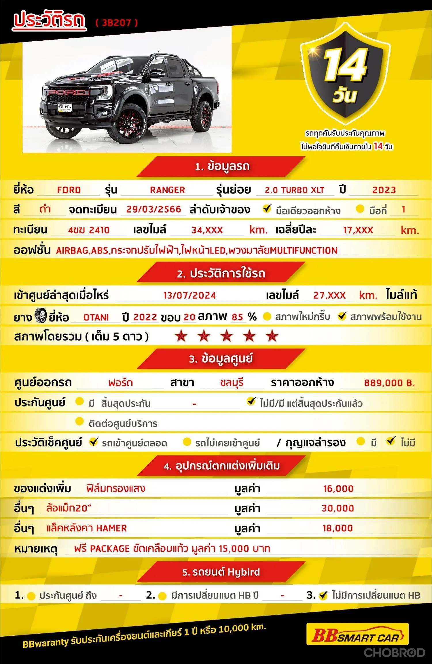 มีการรับประกันจากดีลเลอร์ (6 เดือน) มีบริการช่วยเหลือฉุกเฉินบนท้องถนน 24 ชม. จากดีลเลอร์