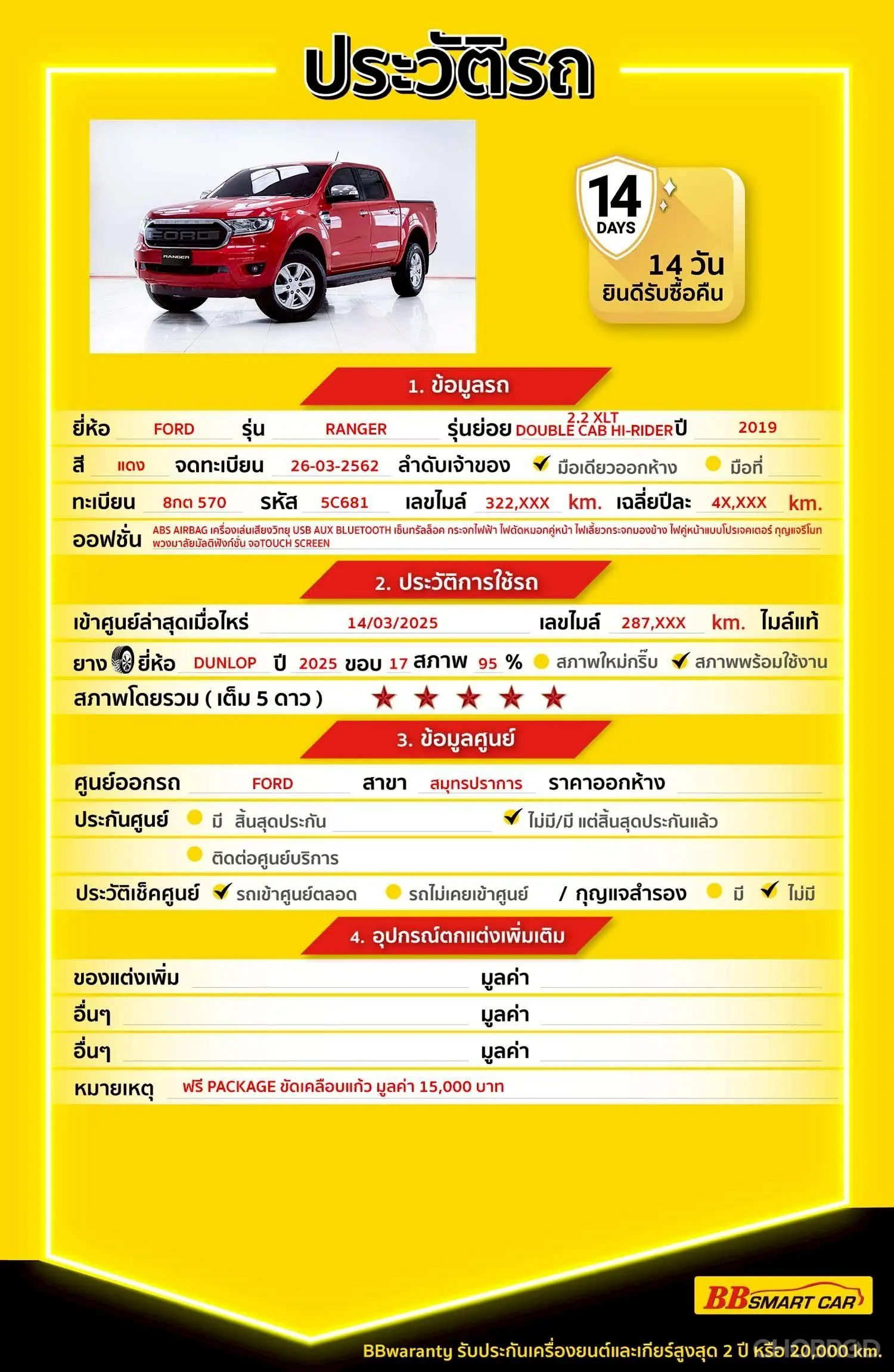 FORD RANGER 2.2 XLT HI-RIDER DOUBLE CAB AT 2019 ออกรถ 0 บาท รหัสรถ 5C681 Line: ID @*******แสดงข้อมูล คลิ๊กที่ลิงก์ เพื่อดู วิดีโอคันนี้,ประวัติรถ, รูปภาพภายนอกและรูปภายใน >>https://www.bbsmartcar.com/web-php/index.php/site/cardetail/202603109F539E763565 🔥มีรถให้เลือกมากกว่า 1,800 คัน 🔥รถทุกคันผ่านตรวจสอบ Inspection เรียบแล้วค่ะ ผ่าน 5 ดาวทุกคันค่ะ 🔥ซื้อรถกับ BB พร้อมให้คำปรึกษา แก้ทุกปัญหา ให้ทุกเรื่อง บริการ call center 24 ชม. 🔥BB Care Plus รับประกันหลังการขาย สูงสุด 2 ปี หรือ 20,000 km. 🔥ฟรี!! แพคเก็จ ขัดเคลือบแก้ว มูลค่า 15,000 บาท ทุกคัน 🔥มี 6 สาขา ในกรุงเทพและปริมณฑลใกล้บ้านท่าน สาขา5 ถ.เศรษฐกิจ ใกล้โลตัสมหาชัย รหัสรถ 5C681 ราคา 384,000 บ. ผ่อนเพียง 6,847 บ. Brand. :FORD Year. : 2019 Model. : RANGER Grade. : 2.2 XLT DOUBLE CAB HI-RIDER Engine. : 2200 CC Type. : ดีเซล Gearbox. : A/T Color. : แดง Mileage. : 322,xxx km. (ซื้อสด ราคานี้ยังไม่รวมค่าดำเนินการ 10,000 บ.) 🚩 Price 384,000 บาท ยอดจัด : 394,000 บาท เงินดาวน์. : 0 บาท ประกันภัย : ฟรีประกันภัย 1 ปี ค่าดำเนินการ : 10,000 บาท รวมออกรถ 0 บาท ผ่อน36 = 13,174 บาท ผ่อน48 = 10,135 บาท ผ่อน60 = 8,421 บาท ผ่อน72 = 7,533 บาท ผ่อน84 = 6,847 บาท เงื่อนไขเป็นไปตามที่ไฟแนนซ์กำหนด** โปรโมชั่นพิเศษ สำหรับลูกค้าเครดิตดี 🚩เลือกรับเรทดอกเบี้ยพิเศษ 📍36 งวด = 1.29 % 📍48 งวด = 1.99 % 📍60 งวด = 2.39 % 📍72 งวด = 3.59 % 🔥เงื่อนไข โปรโมชั่น ดอกเบี้ยเริ่มต้น 1.29% ตลอดอายุสัญญา - ยอดจัดไฟแนนซ์ 300,000-600,0000 บาท - ผ่อนสูงสุด 72 เดือน - เป็นลูกค้าประวัติดี พนักงานประจำเงินเดือน 20,000 ขึ้นไป - ค่าดำเนินการแคมเปญ 20,000 บาท (รวมในยอดจัดได้) 🎗Car Hightlight รถสวยๆ วันนี้ขอแนะนำ FORD RANGER 2.2 XLT DOUBLE CAB HI-RIDER AT 2019 ออฟชั่น 1.1 คิ้วกันสาด 1.2 เซนเซอร์รอบคัน เซนเซอร์ถอยหลัง 1.3 พวงมาลัย Multifunction 🎗ภายใน. จอ LCD เล่น DVD กุญแจรีโมท-สัญญานกันขโมย เบาะหนัง แอร์ Airbag พวงมาลัย Multifunction เบรค ABS เซ็นทรัลล๊อก กระจกมองข้างปรับไฟฟ้า กระจกไฟฟ้า วิทยุ - CD 🎗ภายนอก. ตัวรถสีแดง เซนเซอร์รอบคัน ไฟโปรเจคเตอร์ ไฟเลี้ยวกระจกมองข้าง กระจกข้างโครเมี่ยม กระจกมองข้างพับไฟฟ้า บันไดข้าง ไฟตัดหมอก คิ้วกันสาด เซนเซอร์ถอยหลัง 🎗ความคุ้มค่า สำหรับคันนี้หากเปรียบเทียบราคากับคุณภาพ ถือว่าคุ้มค่ามากครับ ผ่อนสบายๆก็มีรถขับได้ รถดีมีคุณภาพแบบนี้รีบตัดสินใจซื้อได้เลย ราคานี้มาไวไปไวนะคะ
