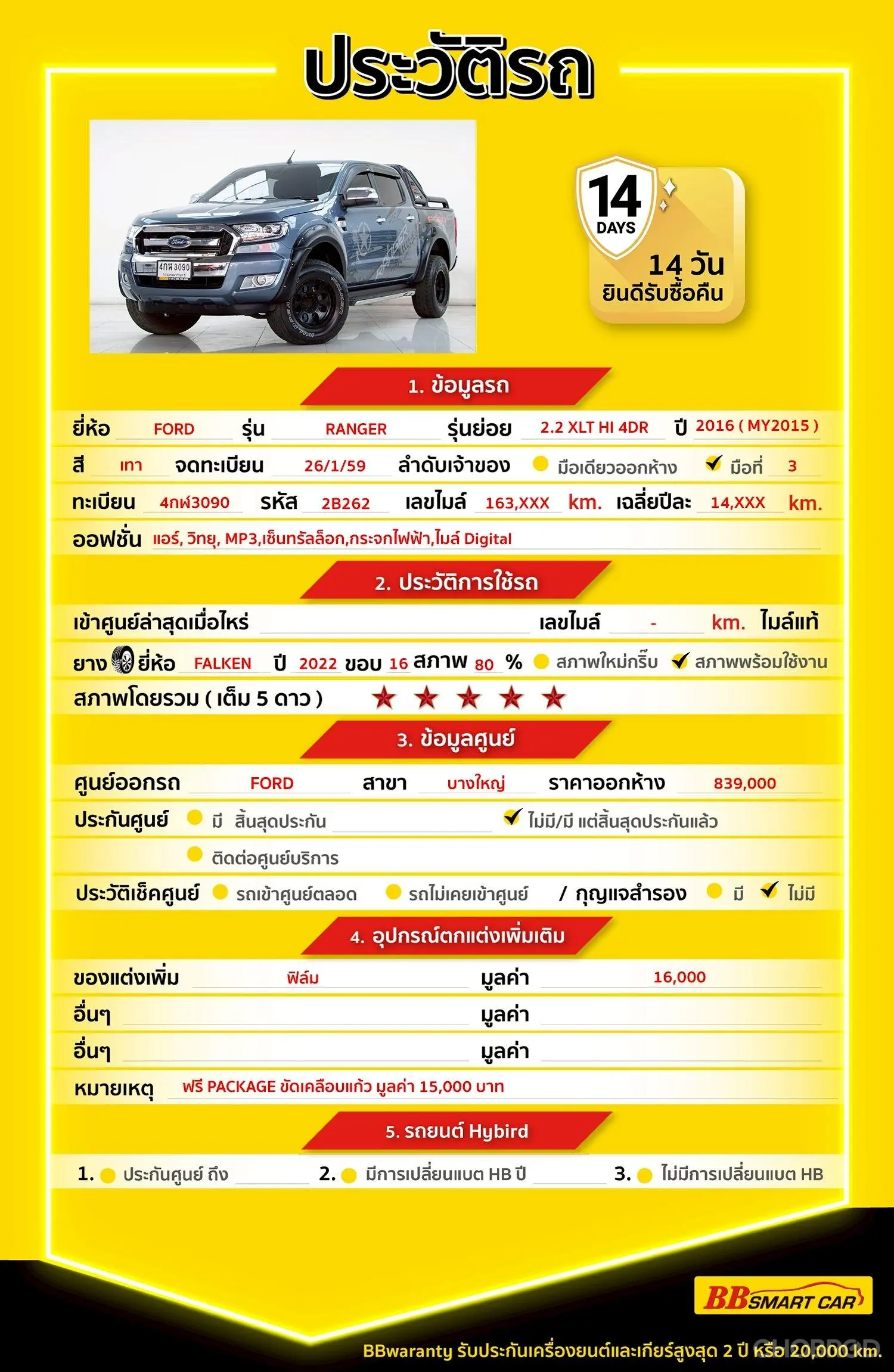 FORD RANGER 2.2 XLT HI-RIDER DBL CAB AT 2016 ออกรถ 0 บาท รหัสรถ 2B240 Line ID : @*******แสดงข้อมูล ***คลิ๊กที่ลิงค์เพื่อดู วิดีโอคันนี้,ประวัติรถ,รูปภาพภายนอกและภายใน https://www.bbsmartcar.com/web-php/index.php/site/cardetail/20260104C9C3EE83B816 เรามีรถรุ่นนี้ให้เลือกชมอีก 46 คัน รถไมล์แท้เช็คศูนย์ตลอด พิเศษดอกเบี้ยเริ่มต้น 1.29% จอง 199 บาท ส่งบัตรประชาชน รู้ผลพิจารณาภายใน 30 นาที ไม่ผ่านคืนเงินจองทุกกรณี รับประกันคุณภาพ ไม่พอใจยินดีคืนเงินภายใน 14 วัน ที่เดียวในประเทศ มีรถให้เลือกมากกว่า 1,800 คัน รถทุกคันผ่านตรวจสอบ Inspection เรียบแล้วค่ะ ผ่าน 5 ดาวทุกคันค่ะ ซื้อรถกับ BB พร้อมให้คำปรึกษา แก้ทุกปัญหา ให้ทุกเรื่อง บริการ call center 24 ชม. BB Care Plus รับประกันหลังการขาย สูงสุด 2 ปี หรือ 20,000 km. ฟรี!! แพคเก็จ ขัดเคลือบแก้ว มูลค่า 15,000 บาท ทุกคัน มี 6 สาขา ในกรุงเทพและปริมณฑลใกล้บ้านท่าน สาขา2 สี่แยกแครายใกล้เดอะมอลล์งามวงศ์วาน รหัสรถ 2B262 ราคา 419,000 บาท ผ่อนเพียง 6,818 บาท Brand. : FORD Year. : 2016 Model. : RANGER Grade. : 2.2 XLT DOUBLE CAB HI-RIDER Engine. : 2200 CC Type. : ดีเซล Gearbox : AT Color. : ฟ้า Mileage. : 163,300 KM. (ซื้อสด ราคานี้ยังไม่รวมค่าดำเนินการ 10,000 บ.) Price. 419,000 บาท ยอดจัด : 429,000 บาท เงินดาวน์ : 0 บาท ประกันภัย : ฟรีประกันภัย 1 ปี ค่าดำเนินการ : 10,000 บาท รวมออกรถ : 0 บาท ผ่อน 36 = 12,512 บาท ผ่อน 48 = 9,695 บาท ผ่อน 60 = 8,141 บาท ผ่อน 72 = 7,319 บาท ผ่อน 84 = 6,818 บาท โปรโมชั่นพิเศษ สำหรับลูกค้าเครดิตดีลือกรับเรทดอกเบี้ยพิเศษ 📍36 งวด = 1.29 % 📍48 งวด = 1.99 % 📍60 งวด = 2.39 % 📍72 งวด = 3.59 % 🔥 เงื่อนไข โปรโมชั่น ดอกเบี้ยเริ่มต้น 1.29% ตลอดอายุสัญญา - ยอดจัดไฟแนนซ์ 300,000-600,000 บาท - ผ่อนสูงสุด 72 เดือน - เป็นลูกค้าประวัติดี พนักงานประจำเงินเดือน 20,000 ขึ้นไป - ค่าดำเนินการแคมเปญ 20,000 บาท (รวมในยอดจัดได้) 🎗Car Hightlight รถสวยๆ วันนี้ขอแนะนำ FORD RANGER 2.2 XLT DOUBLE CAB HI-RIDER ดีเซล 1 : กระจังหน้าโครเมี่ยมคาดโลโก้ 2 : เบาะผ้าสะอาดใหม่ 3 : พวงมาลัยมัลติฟังก์ชั่น 🎗ภายใน Airbag เบรค ABS เซ็นทรัลล๊อก พวงมาลัยเพาเวอร์ เบาะหนังแท้ ไมล์ Digital พวงมาลัย Multifunction แอร์ Cruise Control กระจกมองข้างปรับไฟฟ้า กระจกไฟฟ้า วิทยุ - CD 🎗ภายนอก รถมาพร้อมกระจังหน้าโครเมี่ยมคาดโลโก้ 2 ชั้น มี ไฟเลี้ยวกระจกมองข้าง กระจกมองข้างพับไฟฟ้า ล้อแม็ก ไฟตัดหมอก 🎗ความคุ้มค่า สำหรับคันนี้หากเปรียบเทียบราคากับคุณภาพ คันนี้ถือว่าคุ้มค่ามากค่ะ ผ่อนสบายๆก็มีรถขับได้ รถดีมีคุณภาพแบบนี้รีบตัดสินใจซื้อได้เลราคานี้มาไวไปไวนะคะ