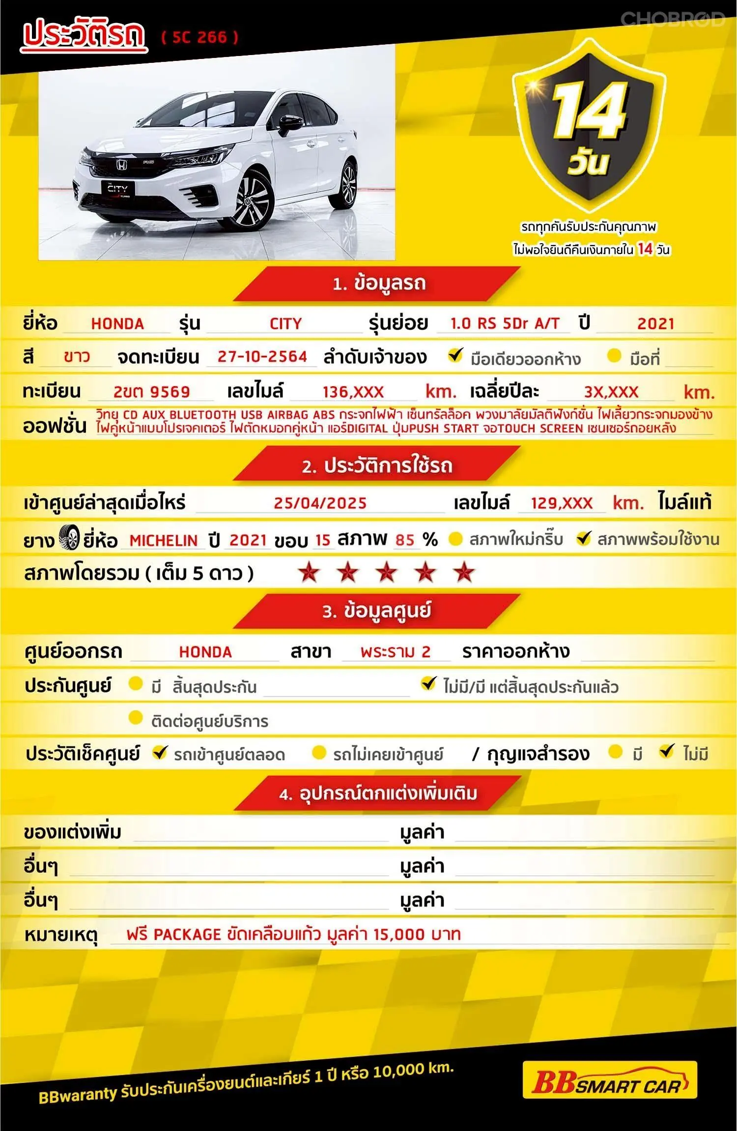 มีการรับประกันจากดีลเลอร์ (6 เดือน) มีบริการช่วยเหลือฉุกเฉินบนท้องถนน 24 ชม. จากดีลเลอร์