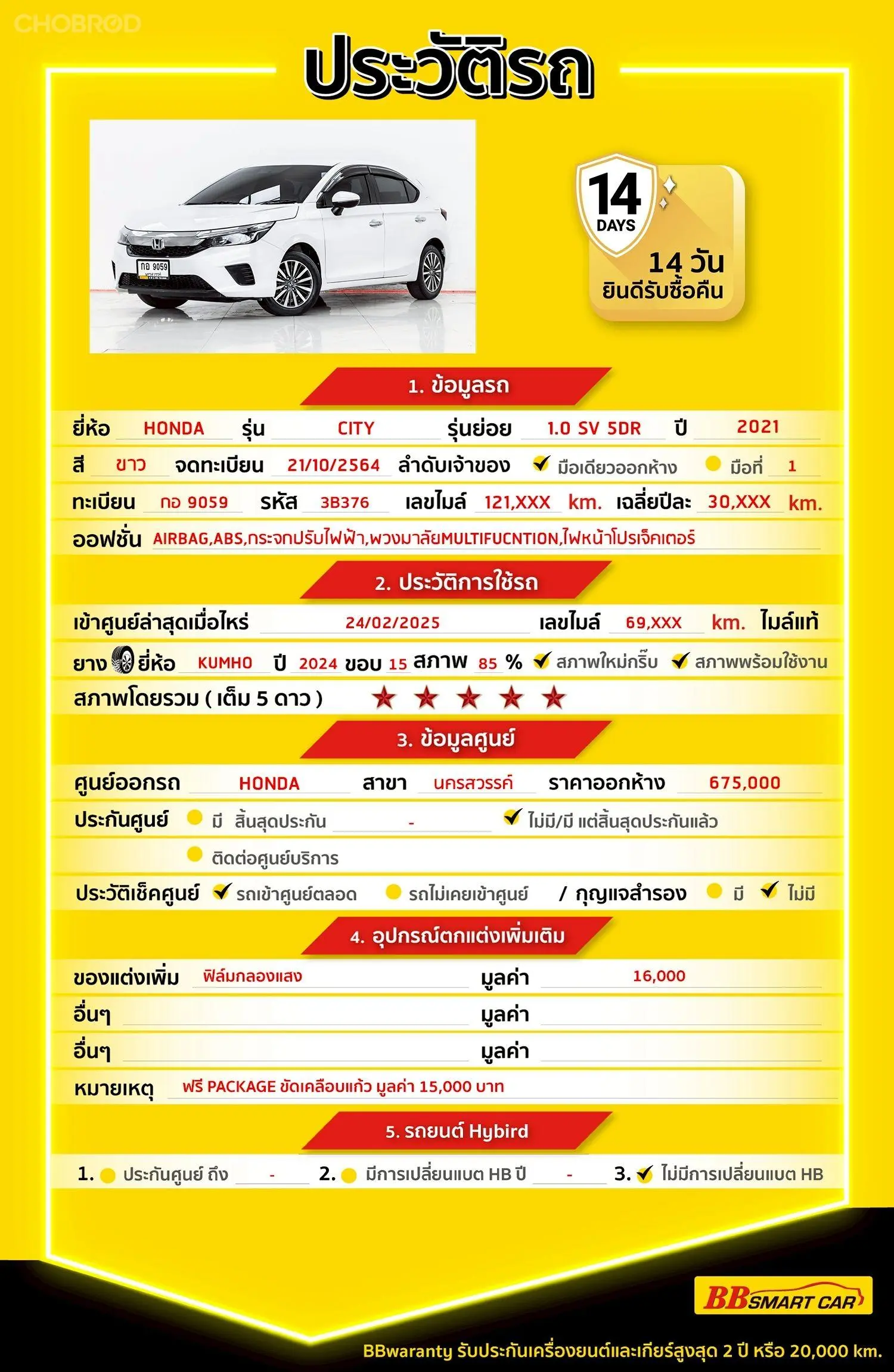 มีการรับประกันจากดีลเลอร์ (6 เดือน) มีบริการช่วยเหลือฉุกเฉินบนท้องถนน 24 ชม. จากดีลเลอร์