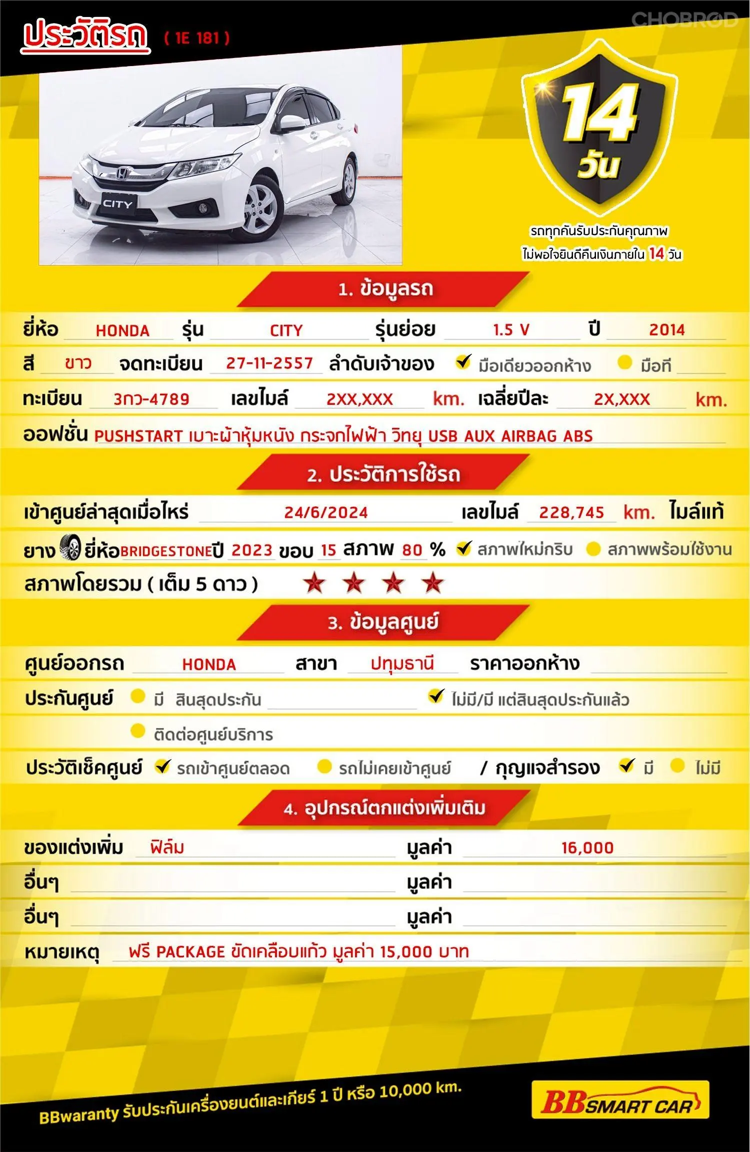 HONDA CITY 1.5 V AT 2014 ออกรถ 0 บาท จัดได้ 264,000 Line:@**********แสดงข้อมูล 🔥จอง 199 บาท ส่งบัตรประชาชน รู้ผลพิจารณาภายใน 30 นาที ไม่ผ่านคืนเงินจองทุกกรณี 🔥ซื้อรถกับ BB พร้อมให้คำปรึกษา แก้ทุกปัญหา ให้ทุกเรื่อง บริการ call center 24 ชม. 🔥BB Care Plus รับประกันหลังการขาย สูงสุด 2 ปี หรือ 20,000 km.. 🔥มีรถให้เลือกมากกว่า 1,800 คัน สาขา 1 สี่แยกมไหสวรรย์ ใกล้เดอะมอลล์ท่าพระ รหัสรถ 1E181 ราคา 244,000 บาท ผ่อนเพียง 4,820 บาท Brand. : HONDA Year. : 2014 Model. : CITY Grade. : 1.5 V Engine. : 1500 CC Type. : เบนซิน Gearbox : AT Color. : ขาว Mileage. : 255,XXX KM. (ซื้อสด ราคานี้ยังไม่รวมค่าดำเนินการ 10,000 บ.) 🚩 Price. 244,000 บาท ยอดจัด : 254,000 บาท เงินดาวน์ : 0 บาท ประกันภัย : ฟรีประกันภัย 1 ปี ค่าดำเนินการ : 10,000 บาท รวมออกรถ : 0 บาท ผ่อน 36 งวด = 8,455 บาท ผ่อน 48 งวด = 6,568 บาท ผ่อน 60 งวด = 5,776 บาท ผ่อน 72 งวด = 5,134 บาท ผ่อน 84 งวด = 4,820 บาท เงื่อนไขเป็นไปตามที่ไฟแนนซ์กำหนด โปรโมชั่นพิเศษ สำหรับลูกค้าเครดิตดีลือกรับเรทดอกเบี้ยพิเศษ 📍36 งวด = 1.29 % 📍48 งวด = 1.99 % 📍60 งวด = 2.39 % 📍72 งวด = 3.59 % 🔥 เงื่อนไข โปรโมชั่น ดอกเบี้ยเริ่มต้น 1.29% ตลอดอายุสัญญา - ยอดจัดไฟแนนซ์ 300,000-600,000 บาท - ผ่อนสูงสุด 72 เดือน - เป็นลูกค้าประวัติดี พนักงานประจำเงินเดือน 20,000 ขึ้นไป - ค่าดำเนินการแคมเปญ 20,000 บาท (รวมในยอดจัดได้) 🎗Car Hightlight รถสวยๆ วันนี้ขอแนะนำ HONDA CITY 1.5 V AT เบนซิน 2014 จุดเด่นออฟชั่น 1 : PUSHSTART 2 : เบาะผ้าหุ้มหนัง 3 : กระจกไฟฟ้า วิทยุ USB AUX 🎗ภายใน airbag abs 🎗ภายนอก ตัวรถสีขาวมาพร้อมล้อเดิมจากศูนย์รถสวยไม่มีชนหนักแน่นอนค่ะ 🎗ความคุ้มค่า สำหรับคันนี้หากเปรียบเทียบราคากับคุณภาพ คันนี้ถือว่าคุ้มค่ามากค่ะ ผ่อนสบายๆก็มีรถขับได้ รถดีมีคุณภาพแบบนี้รีบตัดสินใจซื้อได้เลราคานี้มาไวไปไวนะคะ ⭐️การรับประกันหลังการขาย BB Care Plus สูงสุด 2 ปี หรือ 20,000 km. ด้วยช่างที่ผ่านการอบรมจากศูนย์ชั้นนำของประเทศ 🎉Special offer เฉพาะ บีบีสมาร์ทคาร์ ที่นี่ที่เดียว ⭐ดอกเบี้ยเริ่มต้น 1.29% มีไฟแนนซ์รองรับหลายที่ค่ะ ⭐ฟรี!! แพคเก็จ ขัดเคลือบแก้ว มูลค่า 15,000 บาท ทุกคัน ⭐อนุมัติไว 30 นาที นำเอกสารมาให้ครบรับรถกลับบ้านทันทีค่ะ ⭐BB Care Plus รับประกันหลังการขาย สูงสุด 2 ปี หรือ 20,000 km. ⭐มี 6 สาขา ในกรุงเทพและปริมณฑลใกล้บ้านท่าน ⭐รถทุกคันผ่านตรวจสอบ Inspection เรียบร้อยแล้วค่ะ ผ่าน 5 ดาวทุกคันค่ะ ⭐เซลล์ทุกท่านเป็นมืออาชีพพร้อมให้บริการทุกท่านแน่นอนค่ะ