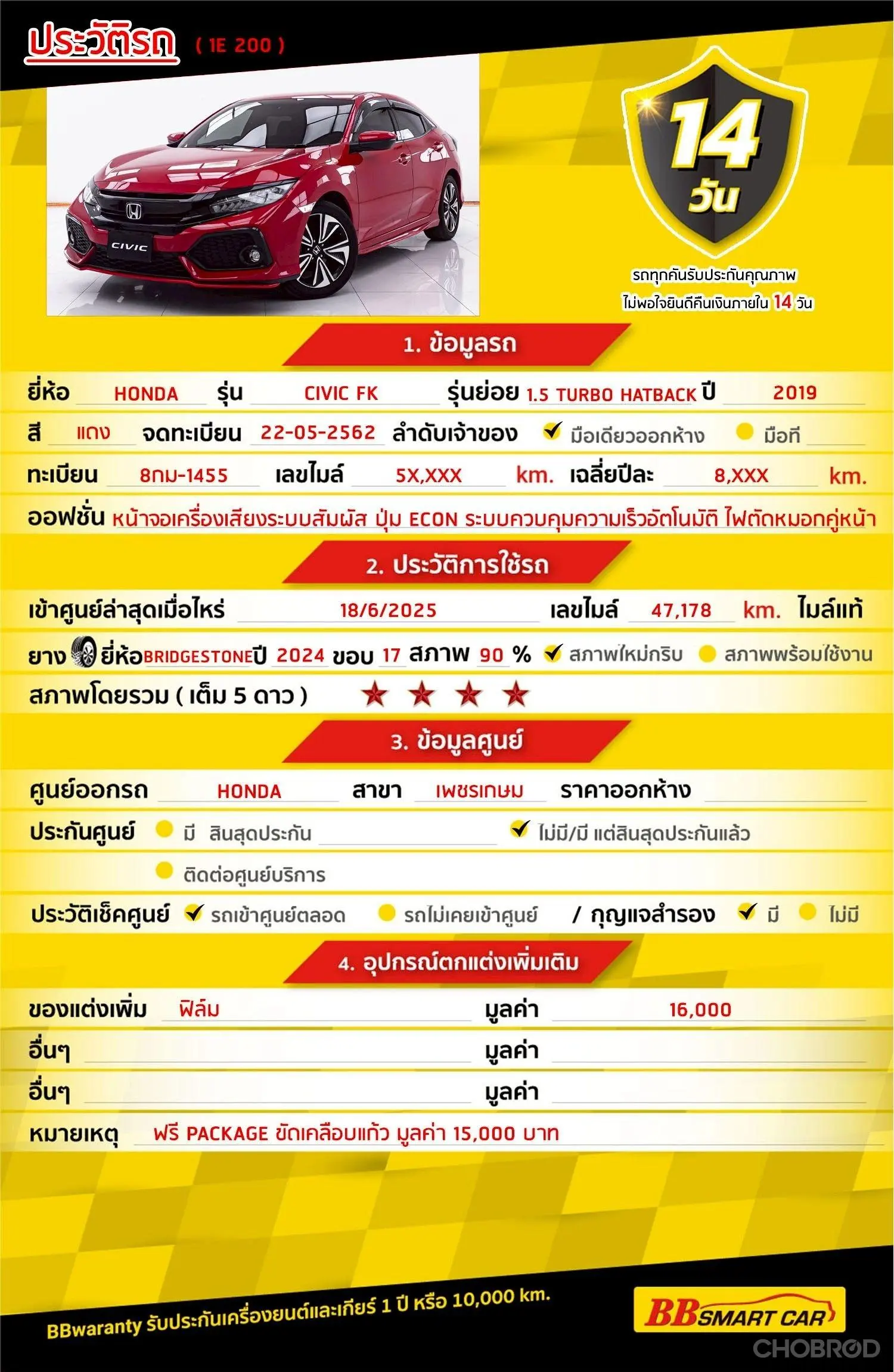 HONDA CIVIC FK 1.5 TURBO HATCHBACK AT 2019 ออกรถ 0 บาท จัดได้ 739,000 Line:@**********แสดงข้อมูล 🔥จอง 199 บาท ส่งบัตรประชาชน รู้ผลพิจารณาภายใน 30 นาที ไม่ผ่านคืนเงินจองทุกกรณี 🔥ซื้อรถกับ BB พร้อมให้คำปรึกษา แก้ทุกปัญหา ให้ทุกเรื่อง บริการ call center 24 ชม. 🔥BB Care Plus รับประกันหลังการขาย สูงสุด 2 ปี หรือ 20,000 km.. 🔥มีรถให้เลือกมากกว่า 1,800 คัน สาขา 1 สี่แยกมไหสวรรย์ ใกล้เดอะมอลล์ท่าพระ รหัสรถ 1E200 ราคา 719,000 บาท ผ่อนเพียง 12,204 บาท Brand. : HONDA Year. : 2019 Model. : CIVIC Grade. : FK 1.5 TURBO HATCHBACK Engine. : 1500 CC Type. : เบนซิน Gearbox : AT Color. : แดง Mileage. : 50,XXX KM. (ซื้อสด ราคานี้ยังไม่รวมค่าดำเนินการ 10,000 บ.) 🚩 Price. 719,000 บาท ยอดจัด : 729,000 บาท เงินดาวน์ : 0 บาท ประกันภัย : ฟรีประกันภัย 1 ปี ค่าดำเนินการ : 10,000 บาท รวมออกรถ : 0 บาท ผ่อน 36 งวด = 22,506 บาท ผ่อน 48 งวด = 17,089 บาท ผ่อน 60 งวด = 15,009 บาท ผ่อน 72 งวด = 13,427 บาท ผ่อน 84 งวด = 12,204 บาท เงื่อนไขเป็นไปตามที่ไฟแนนซ์กำหนด โปรโมชั่นพิเศษ สำหรับลูกค้าเครดิตดีลือกรับเรทดอกเบี้ยพิเศษ 📍36 งวด = 1.29 % 📍48 งวด = 1.99 % 📍60 งวด = 2.39 % 📍72 งวด = 3.59 % 🔥 เงื่อนไข โปรโมชั่น ดอกเบี้ยเริ่มต้น 1.29% ตลอดอายุสัญญา - ยอดจัดไฟแนนซ์ 300,000-600,000 บาท - ผ่อนสูงสุด 72 เดือน - เป็นลูกค้าประวัติดี พนักงานประจำเงินเดือน 20,000 ขึ้นไป - ค่าดำเนินการแคมเปญ 20,000 บาท (รวมในยอดจัดได้) 🎗Car Hightlight รถสวยๆ วันนี้ขอแนะนำ HONDA CIVIC FK 1.5 TURBO HATCHBACK AT 2019 จุดเด่นออฟชั่น 1 : หน้าจอเครื่องเสียงระบบสัมผัส Touchscreen ขนาด 7 นิ้ว 2 : รองรับระบบ Apple Car Play / Android Auto ระบบ Honda CONNECT 3 : รองรับการสั่งงานด้วยเสียง SIRIช่องเชื่อมต่อ USB 2 ช่อง 🎗ภายใน ระบบเปิด-ปิด ไฟหน้าอัตโนมัติ ระบบปิดไฟหน้าอัตโนมัติ เมื่อดับเครื่องยนต์ ระบบปัดน้ำฝนแบบอัตโนมัติ Rain Sensor ภายในห้องโดยสาร โทนสีดำ เบาะนั่งหุ้มด้วยหนัง เดินตะเข็บด้ายสีแดง เบาะนั่งด้านคนขับ ปรับด้วยไฟฟ้า 8 ทิศทาง เบาะนั่งผู้โดยสารตอนหน้า ปรับด้วยไฟฟ้า 4 ทิศทาง เบาะนั่งด้านหลัง แยกพับอิสระ 60 : 40 แผงกั้นสัมภาระด้านท้าย แป้นคันเร่ง – เบรก แบบสปอร์ต พวงมาลัยปรับได้ 4 ทิศทาง (ขึ้น-ลง-เข้า-ออก) พวงมาลัยหุ้มด้วยหนัง วัสดุตกแต่งภายในห้องโดยสาร สีดำ Piano Black กระจกหน้าต่างไฟฟ้าคู่หน้า ปรับขึ้น-ลงอัตโนมัติ ปุ่ม ECON ชุดมาตรวัด และ จอแสดงข้อมูลการขับขี่ เป็น TFT สีแดง ระบบปรับอากาศแบบอัตโนมัติ Dual Zone แยกซ้าย-ขวา ระบบควบคุมการเปลี่ยนเกียร์ที่พวงมาลัย Paddle Shift ระบบควบคุมความเร็วอัตโนมัติ Cruise Control ระบบกุญแจ Honda Smart Key System ปุ่มสตาร์ทเครื่องยนต์ Push Start Button ระบบสตาร์ทเครื่องยนต์ด้วยรีโมท Engine Remote Start 🎗ภายนอก Exterior ภายนอก ล้ออัลลอย ขนาด 17 นิ้ว พร้อมยาง 215/50 R17 ไฟหน้าแบบ Full LED ไฟ Daytime Running Lights แบบ LED ไฟตัดหมอกคู่หน้า แบบ LED ไฟท้าย แบบไฟหรี่ LED กันชนหน้าสไตล์สปอร์ต กระจังหน้าสีดำสไตล์สปอร์ต มือเปิดประตูภายนอก สีรมดำ คิ้วขอบประตู สีดำเงา Gloss Black กระจกมอ