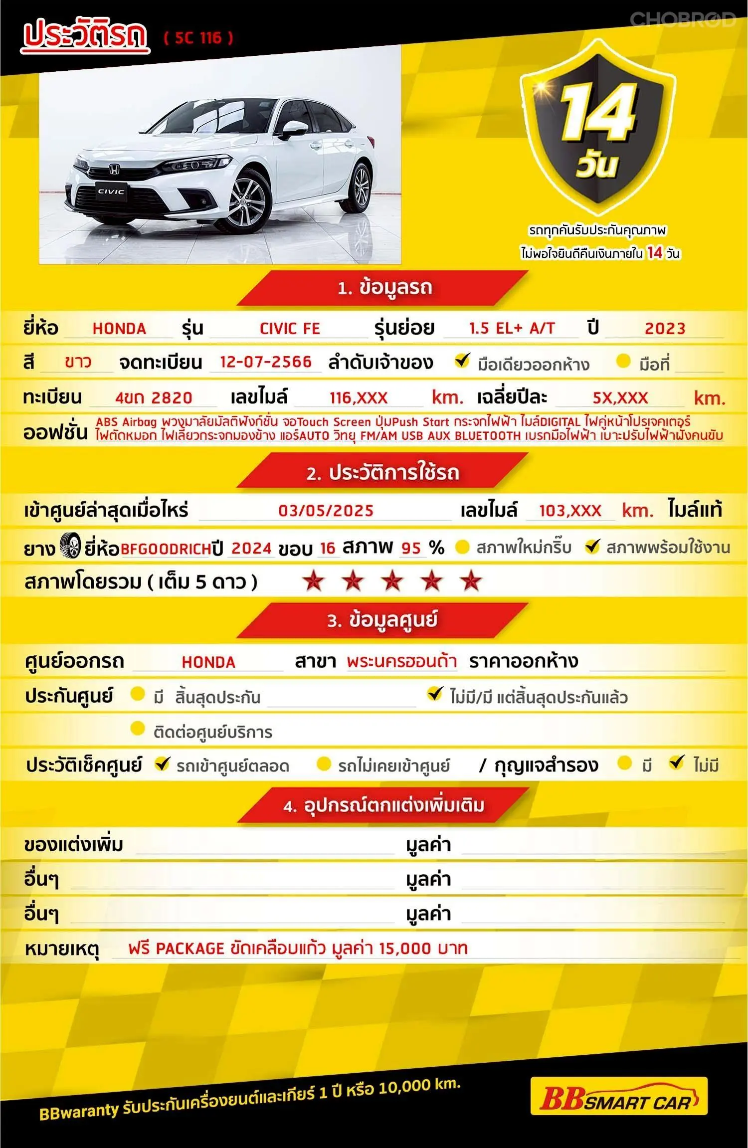 HONDA CIVIC FE 1.5 EL+ AT 2023 ออกรถ 0 บาท จัดได้ 754,000 บ. Line:@*******แสดงข้อมูล 🔥จอง 199 บาท ส่งบัตรประชาชน รู้ผลพิจารณาภายใน 30 นาที ไม่ผ่านคืนเงินจองทุกกรณี 🔥ซื้อรถกับ BB พร้อมให้คำปรึกษา แก้ทุกปัญหา ให้ทุกเรื่อง บริการ call center 24 ชม. 🔥BB Care Plus รับประกันหลังการขาย สูงสุด 2 ปี หรือ 20,000 km. 🔥มีรถให้เลือกมากกว่า 1,600 คัน สาขา5 ถ.เศรษฐกิจ ใกล้โลตัสมหาชัย รหัสรถ 5C116 ราคา 734,000 บาท ผ่อนเพียง 12,539 บาท Brand. : HONDA Year. : 2023 Model. : CIVIC Grade. : 1.5 EL+ Engine. : 1500 CC Type. : เบนซิน Gearbox : A/T Color. : ขาว Mileage. : 116,XXX KM (ซื้อสด ราคานี้ยังไม่รวมค่าดำเนินการ 10,000 บ.) 🚩 Price. 734,000 บาท ยอดจัด : 744,000 บาท เงินดาวน์ : 0 บาท ประกันภัย : ฟรีประกันภัย 1 ปี ค่าดำเนินการ : 10,000 บาท รวมออกรถ : 0 บาท ผ่อน 36 งวด = 24,125 บาท ผ่อน 48 งวด = 18,560 บาท ผ่อน 60 งวด = 15,421 บาท ผ่อน 72 งวด = 13,796 บาท ผ่อน 84 งวด = 12,539 บาท เงื่อนไขเป็นไปตามที่ไฟแนนซ์กำหนด** โปรโมชั่นพิเศษ สำหรับลูกค้าเครดิตดี 🚩เลือกรับเรทดอกเบี้ยพิเศษ 📍36 งวด = 1.29 % 📍48 งวด = 1.99 % 📍60 งวด = 2.39 % 📍72 งวด = 3.59 % 🔥เงื่อนไข โปรโมชั่น ดอกเบี้ยเริ่มต้น 1.29% ตลอดอายุสัญญา - ยอดจัดไฟแนนซ์ 300,000-600,0000 บาท - ผ่อนสูงสุด 72 เดือน - เป็นลูกค้าประวัติดี พนักงานประจำเงินเดือน 20,000 ขึ้นไป - ค่าดำเนินการแคมเปญ 20,000 บาท (รวมในยอดจัดได้) 🎗Car Hightlight รถสวยๆ วันนี้ขอแนะนำ HONDA CIVIC 1.5 EL+ FE เบนซิน 1 : เบาะไฟฟ้าคนขับ 2 : พวงมาลัย Multifunction 3 : จอ LCD เล่น DVD 🎗ภายใน เบรค ABS ไมล์ Digital จอ LCD เล่น DVD เบาะไฟฟ้าคนขับ แอร์ AUTO พวงมาลัย Multifunction เบรกมือไฟฟ้า กระจกมองข้างปรับไฟฟ้า Airbag เบาะหนัง เซ็นทรัลล๊อก กระจกไฟฟ้า วิทยุ - CD 🎗ภายนอก ไฟเลี้ยวกระจกมองข้าง ไฟโปรเจคเตอร์ ไฟตัดหมอก กระจกมองข้างพับไฟฟ้า 🎗ความคุ้มค่า สำหรับคันนี้หากเปรียบเทียบราคากับคุณภาพ คันนี้ถือว่าคุ้มค่ามากค่ะ ผ่อนสบายๆก็มีรถขับได้ รถดีมีคุณภาพแบบนี้รีบตัดสินใจซื้อได้เลราคานี้มาไวไปไวนะคะ ⭐️การรับประกันหลังการขาย BB Care Plus สูงสุด 2 ปี หรือ 20,000 km. ด้วยช่างที่ผ่านการอบรมจากศูนย์ชั้นนำของประเทศ 🎉Special offer เฉพาะ บีบีสมาร์ทคาร์ ที่นี่ที่เดียว ⭐ดอกเบี้ยเริ่มต้น 1.29% มีไฟแนนซ์รองรับหลายที่ค่ะ ⭐ฟรี!! แพคเก็จ ขัดเคลือบแก้ว มูลค่า 15,000 บาท ทุกคัน ⭐อนุมัติไว 30 นาที นำเอกสารมาให้ครบรับรถกลับบ้านทันทีค่ะ ⭐BB Care Plus รับประกันหลังการขาย สูงสุด 2 ปี หรือ 20,000 km. ⭐มี 6 สาขา ในกรุงเทพและปริมณฑลใกล้บ้านท่าน ⭐รถทุกคันผ่านตรวจสอบ Inspection เรียบแล้วค่ะ ผ่าน 5 ดาวทุกคันค่ะ ⭐เซลล์ทุกท่านเป็นมืออาชีพพร้อมให้บริการทุกท่านแน่นอนค่ะ