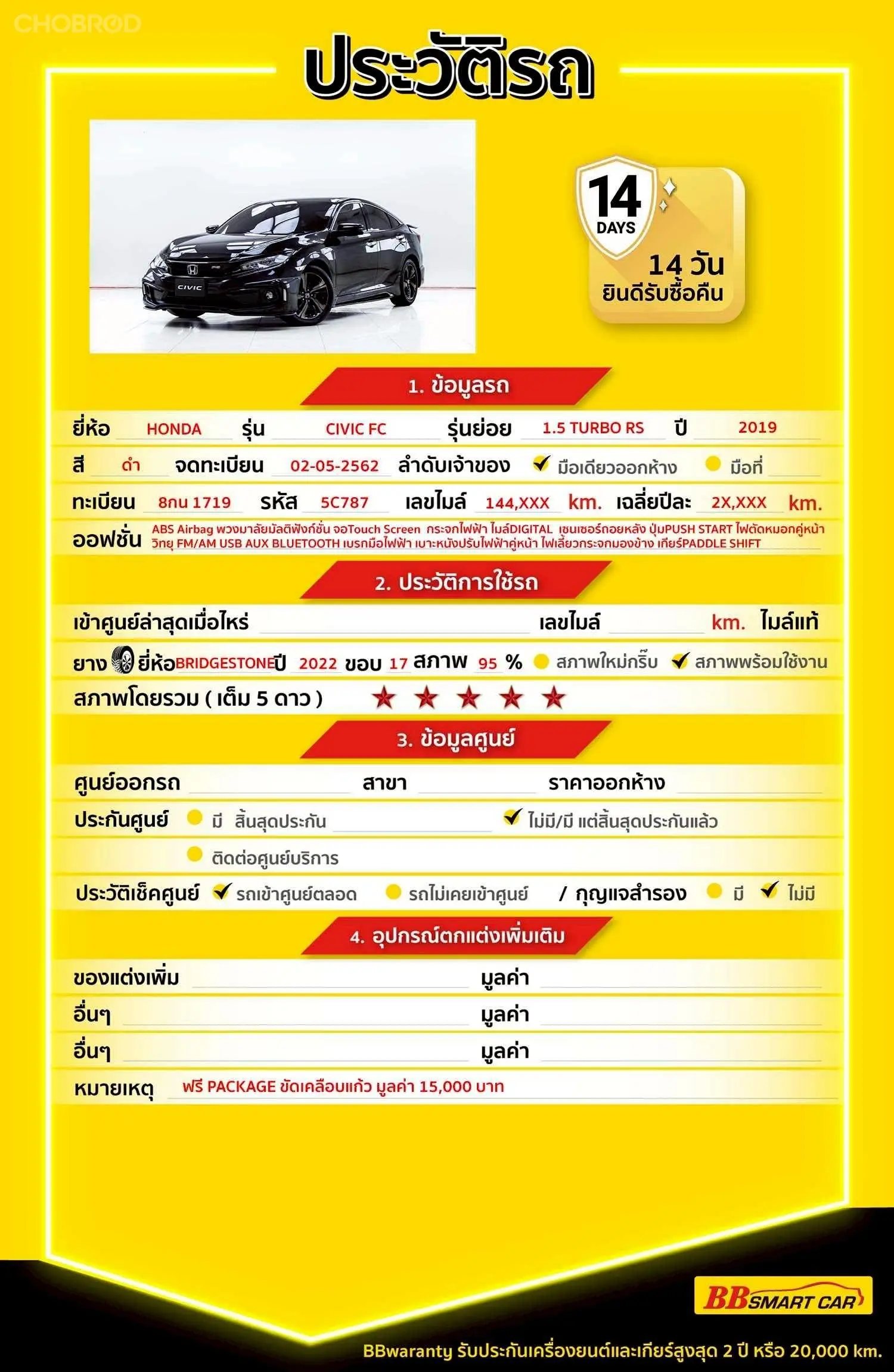 HONDA CIVIC 1.5 TURBO RS FC AT 2019 ออกรถ 0 บาท รหัสรถ 5C787 Line: ID @BBCAR05 คลิ๊กที่ลิงก์ เพื่อดู วิดีโอคันนี้,ประวัติรถ, รูปภาพภายนอกและรูปภายใน >> https://www.bbsmartcar.com/web-php/index.php/site/cardetail/202604066CCD86A077B6 🔥มีรถให้เลือกมากกว่า 1,800 คัน 🔥รถทุกคันผ่านตรวจสอบ Inspection เรียบแล้วค่ะ ผ่าน 5 ดาวทุกคันค่ะ 🔥ซื้อรถกับ BB พร้อมให้คำปรึกษา แก้ทุกปัญหา ให้ทุกเรื่อง บริการ call center 24 ชม. 🔥BB Care Plus รับประกันหลังการขาย สูงสุด 2 ปี หรือ 20,000 km. 🔥ฟรี!! แพคเก็จ ขัดเคลือบแก้ว มูลค่า 15,000 บาท ทุกคัน 🔥มี 6 สาขา ในกรุงเทพและปริมณฑลใกล้บ้านท่าน สาขา 5 ถ.เศรษฐกิจ ใกล้โลตัสมหาชัย รหัสรถ 5C787 ราคา 599,000 บาท ผ่อนเพียง 10,196 บาท Brand. : HONDA Year. : 2019 Model. : CIVIC FC Grade. : 1.5 TURBO RS Engine. : 1500 CC Type. : เบนซิน Gearbox : AT Color. : ดำ Mileage. : 144,XXX KM (ซื้อสด ราคานี้ยังไม่รวมค่าดำเนินการ 10,000 บ.) 🚩 Price. 599,000 บาท ยอดจัด : 609,000 บาท เงินดาวน์ : 0 บาท ประกันภัย : ฟรีประกันภัย 1 ปี ค่าดำเนินการ : 10,000 บาท รวมออกรถ : 0 บาท ผ่อน 36 งวด = 19,616 บาท ผ่อน 48 งวด = 15,090 บาท ผ่อน 60 งวด = 12,538 บาท ผ่อน 72 งวด = 11,217 บาท ผ่อน 84 งวด = 10,196 บาท เงื่อนไขเป็นไปตามที่ไฟแนนซ์กำหนด** โปรโมชั่นพิเศษ สำหรับลูกค้าเครดิตดี 🚩เลือกรับเรทดอกเบี้ยพิเศษ 📍36 งวด = 1.29 % 📍48 งวด = 1.99 % 📍60 งวด = 2.39 % 📍72 งวด = 3.59 % 🔥 เงื่อนไข โปรโมชั่น ดอกเบี้ยเริ่มต้น 1.29% ตลอดอายุสัญญา - ยอดจัดไฟแนนซ์ 300,000-600,0000 บาท - ผ่อนสูงสุด 72 เดือน - เป็นลูกค้าประวัติดี พนักงานประจำเงินเดือน 20,000 ขึ้นไป - ค่าดำเนินการแคมเปญ 20,000 บาท (รวมในยอดจัดได้) 🎗Car Hightlight รถสวยๆ วันนี้ขอแนะนำ HONDA CIVIC 1.5 TURBO RS FC 2019 1 : จอ LCD เล่น DVD 2 : กล้องส่องหลัง 3 : เบาะไฟฟ้าคนขับ 🎗ภายใน เซ็นทรัลล๊อก Airbag ไมล์ Digital วิทยุ - CD เบรค ABS จอ LCD เล่น DVD เบรกมือไฟฟ้า เบาะไฟฟ้าคนขับ กระจกไฟฟ้า พวงมาลัย Multifunction แอร์ AUTO เบาะหนัง 🎗ภายนอก ไฟตัดหมอก สปอยเลอร์หลัง กระจกมองข้างพับไฟฟ้า กล้องส่องหลัง ไฟเลี้ยวกระจกมองข้าง กระจกมองข้างปรับไฟฟ้า 🎗ความคุ้มค่า สำหรับคันนี้หากเปรียบเทียบราคากับคุณภาพ คันนี้ถือว่าคุ้มค่ามากค่ะ ผ่อนสบายๆก็มีรถขับได้ รถดีมีคุณภาพแบบนี้รีบตัดสินใจซื้อได้เลราคานี้มาไวไปไวนะคะ