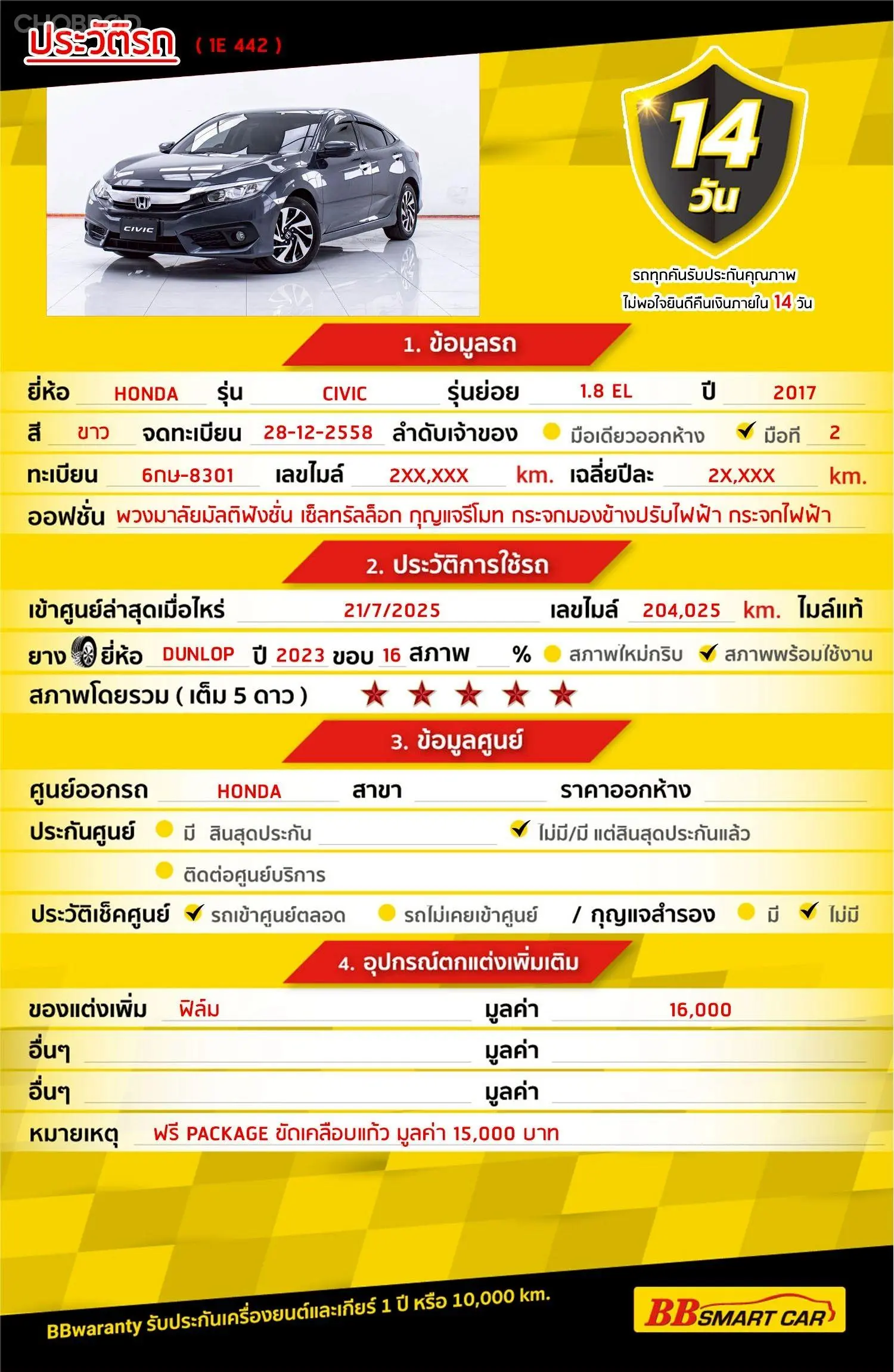 มีการรับประกันจากดีลเลอร์ (6 เดือน) มีบริการช่วยเหลือฉุกเฉินบนท้องถนน 24 ชม. จากดีลเลอร์