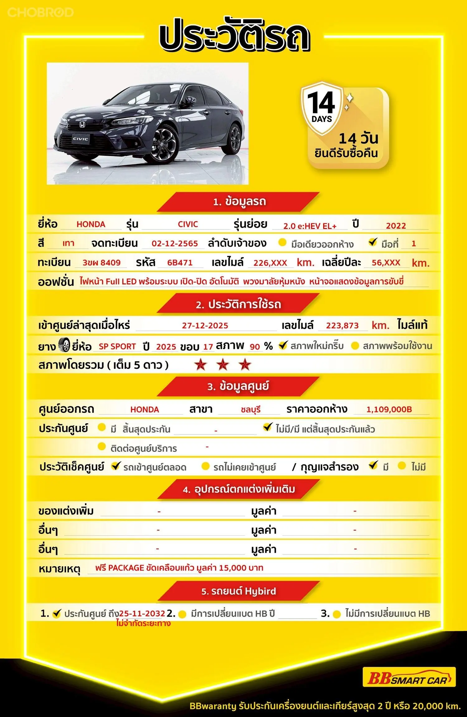 HONDA CIVIC 2.0 E:HEV EL+ AT 2022 ออกรถ 0 บาท รหัส 6B471 Line: ID @bbcar06 🔥มีรถให้เลือกมากกว่า 1,800 คัน 🔥รถทุกคันผ่านตรวจสอบ Inspection เรียบแล้วค่ะ ผ่าน 5 ดาวทุกคันค่ะ 🔥ซื้อรถกับ BB พร้อมให้คำปรึกษา แก้ทุกปัญหา ให้ทุกเรื่อง บริการ call center 24 ชม. 🔥BB Care Plus รับประกันหลังการขาย สูงสุด 2 ปี หรือ 20,000 km. 🔥ฟรี!! แพคเก็จ ขัดเคลือบแก้ว มูลค่า 15,000 บาท ทุกคัน 🔥มี 6 สาขา ในกรุงเทพและปริมณฑลใกล้บ้านท่าน สาขา 6 ศูนย์รวมรถยนต์ไอคาร์สยาม กาญจนาภิเษก รหัสรถ 6B471 ราคา 699,000 บาท ผ่อนเพียง 12,754 บาท Brand. : HONDA Year. : 2022 Model. : CIVIC Grade. : 2.0 E:HEV EL+ Engine. : 2,000 CC Type. : เบนซิน,ระบบไฟฟ้า Gearbox : AT Color. : เทา Mileage. : 226,XXX KM. (ซื้อสด ราคานี้ยังไม่รวมค่าดำเนินการ 10,000 บ.) 🚩 Price. 699,000 บาท ยอดจัด : 709,000 บาท เงินดาวน์ : 0 บาท ประกันภัย : ฟรีประกันภัย 1 ปี ค่าดำเนินการ : 10,000 บาท รวมออกรถ : 0 บาท ผ่อน 36 งวด = 23,533 บาท ผ่อน 48 งวด = 18,264 บาท ผ่อน 60 งวด = 15,229 บาท ผ่อน 72 งวด = 13,691 บาท ผ่อน 84 งวด = 12,754 บาท เงื่อนไขเป็นไปตามที่ไฟแนนซ์กำหนด โปรโมชั่นพิเศษ สำหรับลูกค้าเครดิตดีลือกรับเรทดอกเบี้ยพิเศษ 📍36 งวด = 1.29 % 📍48 งวด = 1.99 % 📍60 งวด = 2.39 % 📍72 งวด = 3.59 % 🔥 เงื่อนไข โปรโมชั่น ดอกเบี้ยเริ่มต้น 1.29% ตลอดอายุสัญญา - ยอดจัดไฟแนนซ์ 300,000-600,000 บาท - ผ่อนสูงสุด 72 เดือน - เป็นลูกค้าประวัติดี พนักงานประจำเงินเดือน 20,000 ขึ้นไป - ค่าดำเนินการแคมเปญ 20,000 บาท (รวมในยอดจัดได้) 🎗Car Hightlight รถสวยๆ วันนี้ขอแนะนำ HONDA CIVIC 2.0 E:HEV EL+ AT 2022 จุดเด่นออฟชั่น 12.2.1 : ABS / EBD 12.2.2 : ระบบล็อค/ปลดล็อคอัตโนมัติ และสัญญาณกันขโมย 12.2.3 : ไฟหน้า/ท้าย LED เต็มระบบ 🎗ภายใน - เบรค ABS จอ LCD เล่น DVD กระจกไฟฟ้า แอร์ AUTO พวงมาลัยเพาเวอร์ เบาะหนัง พวงมาลัย Multifunction กระจกมองข้างปรับไฟฟ้า Airbag กุญแจรีโมท-สัญญานกันขโมย เบาะไฟฟ้าคนขับ 🎗ภายนอก - ไฟตัดหมอก ล้อแม็ก กระจกมองข้างพับไฟฟ้า 🎗ความคุ้มค่า สำหรับคันนี้หากเปรียบเทียบราคากับคุณภาพ คันนี้ถือว่าคุ้มค่ามากค่ะ ผ่อนสบายๆก็มีรถขับได้ รถดีมีคุณภาพแบบนี้รีบตัดสินใจซื้อได้เลราคานี้มาไวไปไวนะคะ