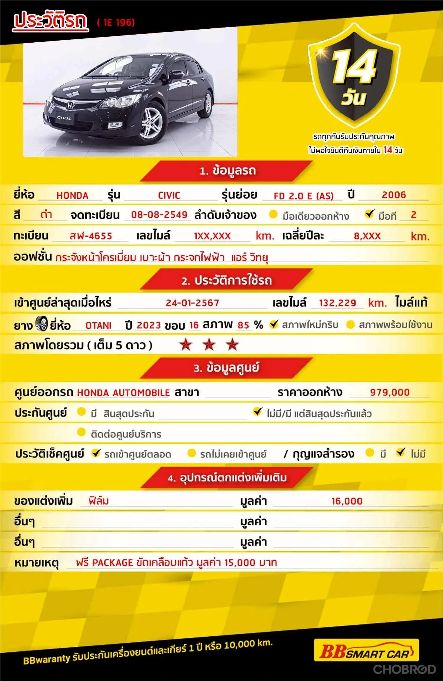 HONDA CIVIC FD 2.0 E (AS) AT 2006 (ขายสดเท่านั้น) Line:@**********แสดงข้อมูล 🔥BB Care Plus รับประกันหลังการขาย สูงสุด 2 ปี หรือ 20,000 km.. 🔥มีรถให้เลือกมากกว่า 1,800 คัน 1E196 สาขา 1 สี่แยกมไหวรรย์ ใกล้เดอะมอลล์ท่าพระ ราคา 169,000 บ. (ขายสดเท่านั้น) เรารอตอบคำถามสำหรับลูกค้าที่น่ารักทุกท่านคะ ติดต่อได้ที่ 📲 : 062-***แสดงข้อมูล-9999 คุณแก้ม แอดไลน์ ทันที https://line.me/ti/p/qtuHXuxzt9 BBsmartcar 1 Promotion sale for today (ซื้อสดราคานี้ยังไม่รวมค่าดำเนินการ 10,000 บาท) Brand. : HONDA Year. : 2006 Model. : CIVIC Grade. : FD 2.0 E (AS) Engine. : 2000 CC Type. : เบนซิน Gearbox : AT Color. : ดำ Mileage. : 156,XXX KM. Accessories : HONDA CIVIC FD 2.0 E (AS) AT 2006 1 : กระจังหน้าโครเมี่ยม 2 : เบาะผ้า 3 : กระจกไฟฟ้า ประวัติข้อมูลรถ : เป็นรถใช้แล้ว ตัวรถไม่มีอุบัติเหตุหรือน้ำท่วม BBsmartcar service : ฟรีค่าแรงซ่อมบำรุง 3 เดือน หรือ 5,000 Km. BBsmartcar The Best Quality Used Car ที่สุดแห่งคุณภาพรถยนต์มือสอง รับชมรถคุณภาพดีมากกว่า 1,800 คัน ได้บนมือถือของคุณได้แล้ว >> http\://www.**********แสดงข้อมูล.com/ ลิ้ง Line: https\://line.me/ti/p/1LW23pbPFI รวมคำถาม+คำตอบ ครบๆ แอด line มานะคะ - ติดแบล็คลิสต์ - ติดล่าช้า ติดค้ำ ปล่อยยึด/คืน - ช่องทางการติดต่อเซล์ - คำถามยอดฮิต - แผ่นที่มาโชว์รูม - ต้องการดูรูปรถ - เว็บไซต์/เว็บเพจ - เอกสาร การจัดไฟแนนซ์ ****************************************