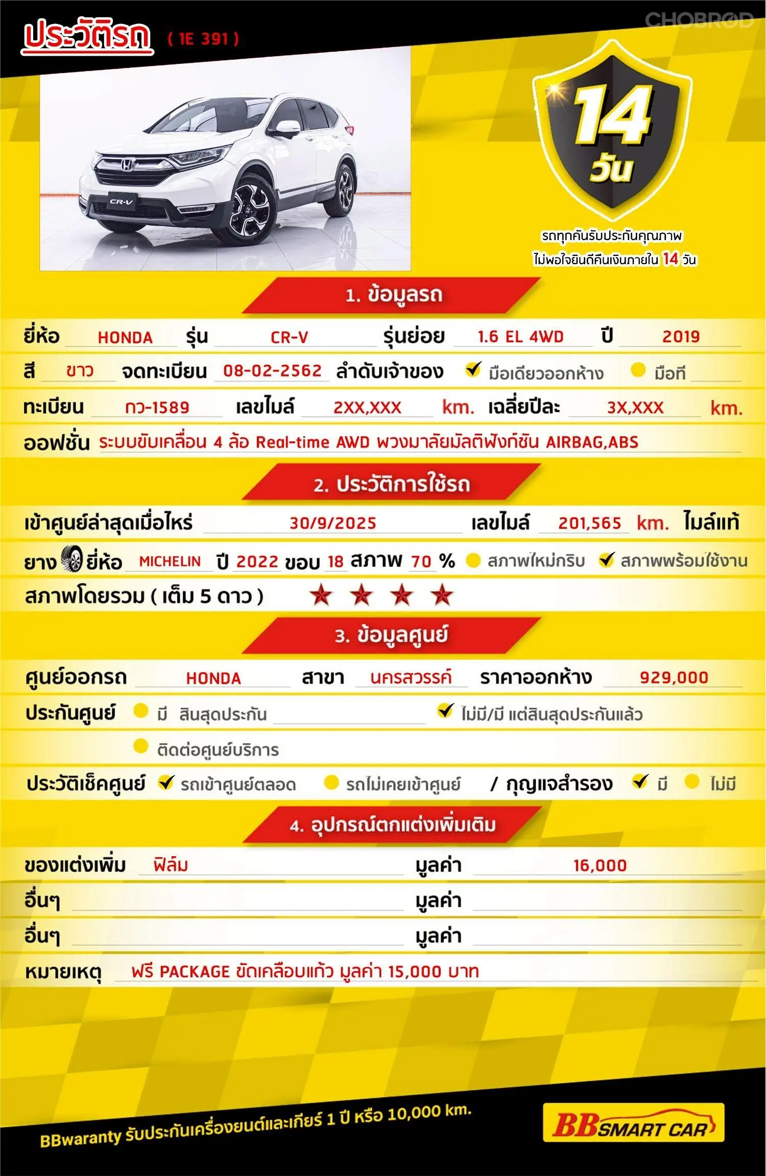 มีการรับประกันจากดีลเลอร์ (6 เดือน) มีบริการช่วยเหลือฉุกเฉินบนท้องถนน 24 ชม. จากดีลเลอร์
