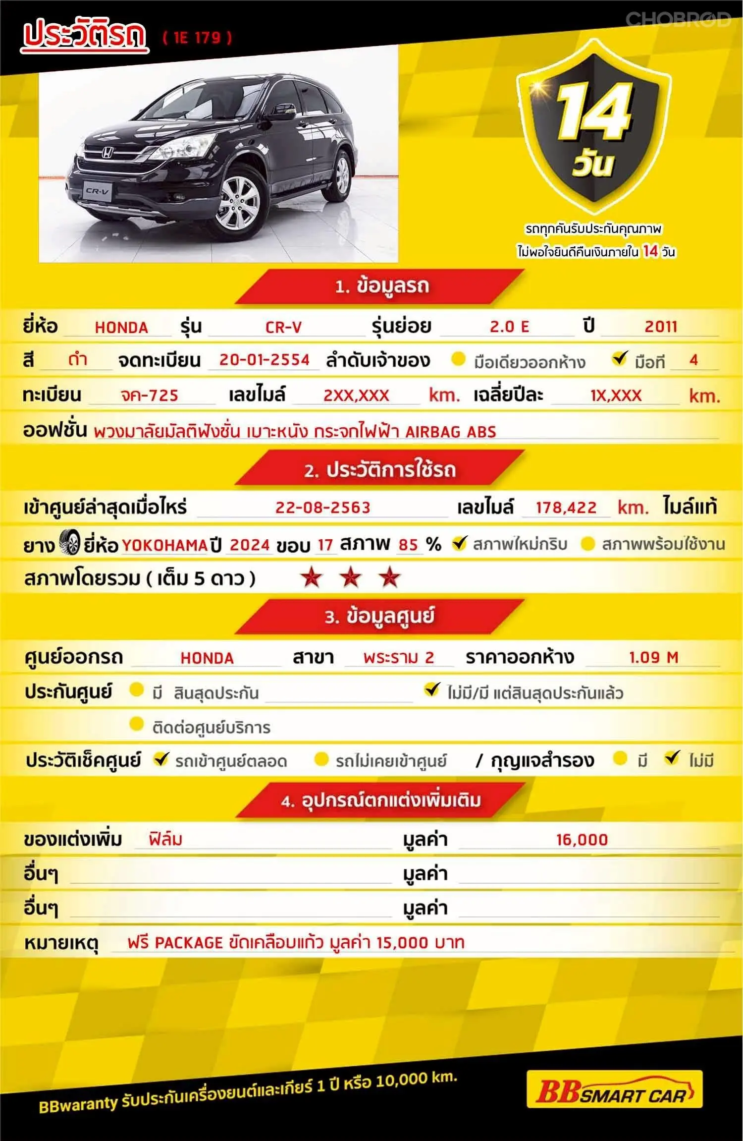 HONDA CR-V 2.0 E AT 2011 ออกรถ 0 บาท จัดได้ 244,000 Line:@**********แสดงข้อมูล 🔥จอง 199 บาท ส่งบัตรประชาชน รู้ผลพิจารณาภายใน 30 นาที ไม่ผ่านคืนเงินจองทุกกรณี 🔥ซื้อรถกับ BB พร้อมให้คำปรึกษา แก้ทุกปัญหา ให้ทุกเรื่อง บริการ call center 24 ชม. 🔥BB Care Plus รับประกันหลังการขาย สูงสุด 2 ปี หรือ 20,000 km.. 🔥มีรถให้เลือกมากกว่า 1,800 คัน สาขา 1 สี่แยกมไหสวรรย์ ใกล้เดอะมอลล์ท่าพระ รหัสรถ 1E179 ราคา 224,000 บาท ผ่อนเพียง 4,545 บาท Brand. : HONDA Year. : 2011 Model. : CR-V Grade. : 2.0 E Engine. : 2000 CC Type. : เบนซิน Gearbox : AT Color. : ดำ Mileage. : 241,XXX KM. (ซื้อสด ราคานี้ยังไม่รวมค่าดำเนินการ 10,000 บ.) 🚩 Price. 224,000 บาท ยอดจัด : 234,000 บาท เงินดาวน์ : 0 บาท ประกันภัย : ฟรีประกันภัย 1 ปี ค่าดำเนินการ : 10,000 บาท รวมออกรถ : 0 บาท ผ่อน 36 งวด = 8,051 บาท ผ่อน 48 งวด = 6,312 บาท ผ่อน 60 งวด = 5,425 บาท ผ่อน 72 งวด = 4,834 บาท ผ่อน 84 งวด = 4,545 บาท เงื่อนไขเป็นไปตามที่ไฟแนนซ์กำหนด โปรโมชั่นพิเศษ สำหรับลูกค้าเครดิตดีลือกรับเรทดอกเบี้ยพิเศษ 📍36 งวด = 1.29 % 📍48 งวด = 1.99 % 📍60 งวด = 2.39 % 📍72 งวด = 3.59 % 🔥 เงื่อนไข โปรโมชั่น ดอกเบี้ยเริ่มต้น 1.29% ตลอดอายุสัญญา - ยอดจัดไฟแนนซ์ 300,000-600,000 บาท - ผ่อนสูงสุด 72 เดือน - เป็นลูกค้าประวัติดี พนักงานประจำเงินเดือน 20,000 ขึ้นไป - ค่าดำเนินการแคมเปญ 20,000 บาท (รวมในยอดจัดได้) 🎗Car Hightlight รถสวยๆ วันนี้ขอแนะนำ HONDA CR-V 2.0 E AT 2011 จุดเด่นออฟชั่น 1 : พวงมาลัยมัลติฟังชั่น 2 : เบาะหนัง 3 : กระจกไฟฟ้า 🎗ภายใน AIRBAG ABS 🎗ภายนอก ล้ออัลลอย (17 นิ้ว) กระจกมองข้างปรับ-พับด้วยไฟฟ้า พร้อมไฟเลี้ยว ไฟ Daytime Running Light เสาอากาศครีบฉลาม ที่ปัดหมอกด้านหลัง มือเปิดประตูภายนอก สีเดียวกับตัวรถ 🎗ความคุ้มค่า สำหรับคันนี้หากเปรียบเทียบราคากับคุณภาพ คันนี้ถือว่าคุ้มค่ามากค่ะ ผ่อนสบายๆก็มีรถขับได้ รถดีมีคุณภาพแบบนี้รีบตัดสินใจซื้อได้เลราคานี้มาไวไปไวนะคะ ⭐️การรับประกันหลังการขาย BB Care Plus สูงสุด 2 ปี หรือ 20,000 km. ด้วยช่างที่ผ่านการอบรมจากศูนย์ชั้นนำของประเทศ 🎉Special offer เฉพาะ บีบีสมาร์ทคาร์ ที่นี่ที่เดียว ⭐ดอกเบี้ยเริ่มต้น 1.29% มีไฟแนนซ์รองรับหลายที่ค่ะ ⭐ฟรี!! แพคเก็จ ขัดเคลือบแก้ว มูลค่า 15,000 บาท ทุกคัน ⭐อนุมัติไว 30 นาที นำเอกสารมาให้ครบรับรถกลับบ้านทันทีค่ะ ⭐BB Care Plus รับประกันหลังการขาย สูงสุด 2 ปี หรือ 20,000 km. ⭐มี 6 สาขา ในกรุงเทพและปริมณฑลใกล้บ้านท่าน ⭐รถทุกคันผ่านตรวจสอบ Inspection เรียบร้อยแล้วค่ะ ผ่าน 5 ดาวทุกคันค่ะ ⭐เซลล์ทุกท่านเป็นมืออาชีพพร้อมให้บริการทุกท่านแน่นอนค่ะ
