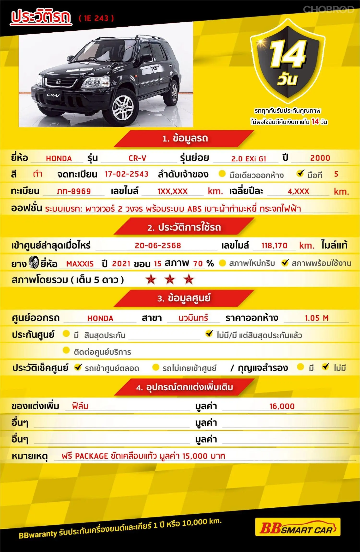 HONDA CR-V 2.0 EXi G1 AT 2000 (ขายสดเท่านั้น) Line:***********แสดงข้อมูล 🔥BB Care Plus รับประกันหลังการขาย สูงสุด 2 ปี หรือ 20,000 km.. 🔥มีรถให้เลือกมากกว่า 1,800 คัน 1E243 สาขา 1 สี่แยกมไหวรรย์ ใกล้เดอะมอลล์ท่าพระ ราคา 84,000 บ. (ขายสดเท่านั้น) เรารอตอบคำถามสำหรับลูกค้าที่น่ารักทุกท่านคะ ติดต่อได้ที่ 📲 : 084-6*******แสดงข้อมูล คุณโฟร์ แอดไลน์ ทันที https://line.me/ti/p/ee-e1UbGK BBsmartcar 1 Promotion sale for today (ซื้อสดราคานี้ยังไม่รวมค่าดำเนินการ 10,000 บาท) Brand. : HONDA Year. : 2000 Model. : CR-V Grade. : 2.0 EXi G1 Engine. : 2000 CC Type. : เบนซิน Gearbox : AT Color. : ดำ Mileage. : 121,XXX KM. Accessories : HONDA CR-V 2.0 EXi G1 AT เบนซิน 2000 1 : เครื่องยนต์เบนซิน 4 สูบ 16 วาล์ว ขนาด 1,972 ซีซี ให้กำลังสูงสุด 130 แรงม้า แรงบิดสูงสุด 19 กก.-ม. 2 : เบาะผ้ากำมะหยี่ กระจกไฟฟ้า 3 : ล้อแมกซ์ แอร์ วิทยุ จอ ประวัติข้อมูลรถ : เป็นรถใช้แล้ว ตัวรถไม่มีอุบัติเหตุหรือน้ำท่วม BBsmartcar service : ฟรีค่าแรงซ่อมบำรุง 3 เดือน หรือ 5,000 Km. BBsmartcar The Best Quality Used Car ที่สุดแห่งคุณภาพรถยนต์มือสอง รับชมรถคุณภาพดีมากกว่า 1,800 คัน ได้บนมือถือของคุณได้แล้ว >> http\://www.bbsmartcar.com/ ลิ้ง Line: https\://line.me/ti/p/1LW23pbPFI รวมคำถาม+คำตอบ ครบๆ แอด line มานะคะ - ติดแบล็คลิสต์ - ติดล่าช้า ติดค้ำ ปล่อยยึด/คืน - ช่องทางการติดต่อเซล์ - คำถามยอดฮิต - แผ่นที่มาโชว์รูม - ต้องการดูรูปรถ - เว็บไซต์/เว็บเพจ - เอกสาร การจัดไฟแนนซ์ **********************************