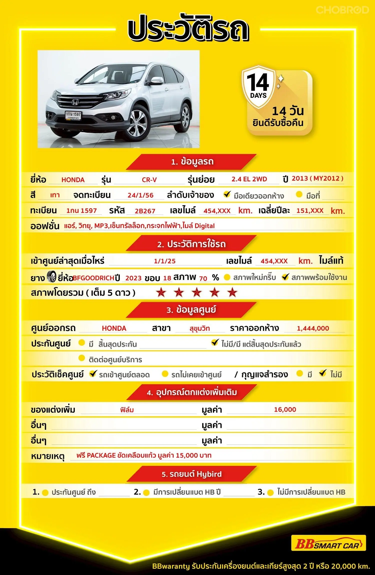 HONDA CR-V 2.4 EL 2WD AT 2013 ออกรถ 0 บาท รหัสรถ 2B278 Line ID : @bbcar02 🔥มีรถให้เลือกมากกว่า 1,800 คัน 🔥รถทุกคันผ่านตรวจสอบ Inspection เรียบแล้วค่ะ ผ่าน 5 ดาวทุกคันค่ะ 🔥ซื้อรถกับ BB พร้อมให้คำปรึกษา แก้ทุกปัญหา ให้ทุกเรื่อง บริการ call center 24 ชม. 🔥BB Care Plus รับประกันหลังการขาย สูงสุด 2 ปี หรือ 20,000 km. 🔥ฟรี!! แพคเก็จ ขัดเคลือบแก้ว มูลค่า 15,000 บาท ทุกคัน 🔥มี 6 สาขา ในกรุงเทพและปริมณฑลใกล้บ้านท่าน บีบีสมาร์ทคาร์ 2 สาขาแคราย รหัสรถ 2B278 ราคา 289,000 บาท ผ่อนเพียง 5,808 บาท Brand. : HONDA Year. : 2013 Model. : CR-V Grade. : 2.4 EL 2WD Engine. : 2400 CC Type. : เบนซิน Gearbox : AT Color. : เทา Mileage. : 454,700 KM. (ซื้อสด ราคานี้ยังไม่รวมค่าดำเนินการ 10,000 บ.) 🚩 Price. 289,000 บาท ยอดจัด : 299,000 บาท เงินดาวน์ : 0 บาท ประกันภัย : ฟรีประกันภัย 1 ปี ค่าดำเนินการ : 10,000 บาท รวมออกรถ : 0 บาท ผ่อน 36 งวด = 10,287 บาท ผ่อน 48 งวด = 8,065 บาท ผ่อน 60 งวด = 6,931 บาท ผ่อน 72 งวด = 6,176 บาท ผ่อน 84 งวด = 5,808 บาท **เงื่อนไขเป็นไปตามที่ไฟแนนซ์กำหนด** โปรโมชั่นพิเศษ สำหรับลูกค้าเครดิตดีเลือกรับเรทดอกเบี้ยพิเศษ 📍36 งวด = 1.29 % 📍48 งวด = 1.99 % 📍60 งวด = 2.39 % 📍72 งวด = 3.59 % 🔥 เงื่อนไข โปรโมชั่น ดอกเบี้ยเริ่มต้น 1.29% ตลอดอายุสัญญา - ยอดจัดไฟแนนซ์ 300,000-600,000 บาท - ผ่อนสูงสุด 72 เดือน - เป็นลูกค้าประวัติดี พนักงานประจำเงินเดือน 20,000 ขึ้นไป - ค่าดำเนินการแคมเปญ 20,000 บาท (รวมในยอดจัดได้) 🎗Car Hightlight รถสวยๆ วันนี้ขอแนะนำ HONDA CR-V 2.4 EL 2WD AT 2013 1 : ดีไซน์ภายนอกของ Honda CRV มาในแนวรถ SUV สไตล์สปอร์ตพรีเมี่ยม โดดเด่นด้วยไฟหน้าแบบ LED สไตล์ฮอนด้า 2 : ระบบความปลอดภัยติดรถ - ระบบแสดงภาพมุมอับสายตาขณะเปลี่ยนเลน (Honda LaneWatch) 🎗ภายใน ถุงลมคู่หน้าอัจฉริยะ (Dual i-SRS) - ถุงลมด้านข้างคู่หน้าอัจฉริยะ (i-Side Airbags) - ม่านถุงลมด้านข้าง (Side Curtain Airbags) - ระบบป้องกันล้อล็อก (ABS) - ระบบกระจายแรงเบรก (EBD) - ระบบช่วยควบคุมการทรงตัวขณะเข้าโค้ง (VSA) - ระบบช่วยควบคุมการบังคับพวงมาลัย (MA-EPS) - ระบบช่วยการออกตัวขณะอยู่บนทางลาดชัน (HSA) - สัญญาณไฟฉุกเฉินอัตโนมัติขณะเบรกกะทันหัน (ESS) - ระบบเพิ่มความคล่องตัวในการขับขี่ (Agile Handling Assist) 🎗ภายนอก ไฟเลี้ยวแบบ LED Sequential พร้อมไฟตัดหมอก LED เอกลักษณ์ของ Honda พร้อมกระจังหน้าลวดลายรังผึ้ง และมีการตัดลายเส้นโครเมี่ยมที่บริเวณด้านหน้ารถเสริมความหรูหราปนความสปอร์ตได้อย่างลงตัว 🎗ความคุ้มค่า สำหรับคันนี้หากเปรียบเทียบราคากับคุณภาพ คันนี้ถือว่าคุ้มค่ามากค่ะ ผ่อนสบายๆก็มีรถขับได้ รถดีมีคุณภาพแบบนี้รีบตัดสินใจซื้อได้เลราคานี้มาไวไปไวนะคะ