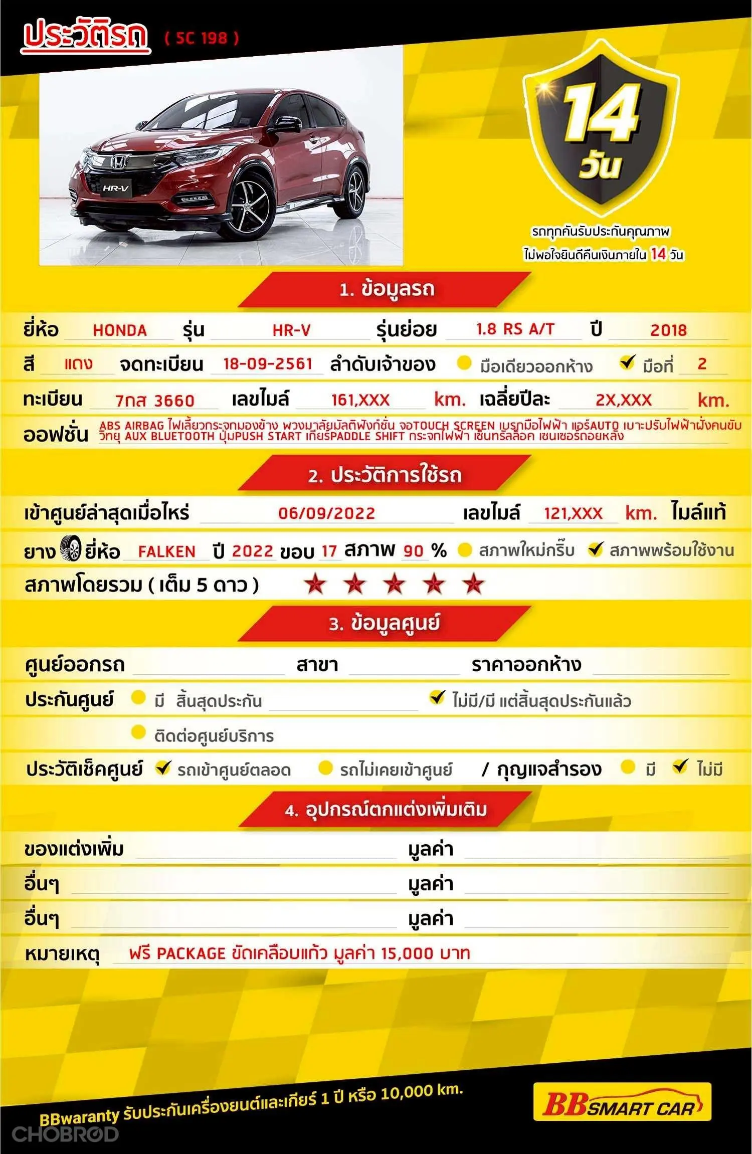 HONDA HR-V 1.8 RS AT 2018 ออกรถ 0 บาท จัดได้ 549,000 บ. Line:@BBCAR05 🔥จอง 199 บาท ส่งบัตรประชาชน รู้ผลพิจารณาภายใน 30 นาที ไม่ผ่านคืนเงินจองทุกกรณี 🔥ซื้อรถกับ BB พร้อมให้คำปรึกษา แก้ทุกปัญหา ให้ทุกเรื่อง บริการ call center 24 ชม. 🔥BB Care Plus รับประกันหลังการขาย สูงสุด 2 ปี หรือ 20,000 km. 🔥มีรถให้เลือกมากกว่า 1,800 คัน สาขา5 ถ.เศรษฐกิจ ใกล้โลตัสมหาชัย รหัสรถ 5C198 ราคา 529,000 บ. ผ่อนเพียง 9,023 บ. Brand : HONDA Year : 2018 Model : HR-V Grade : 1.8 RS Engine : 1800 CC. Type : เบนซิน Gearbox : A/T Color : แดง Mileage : 161,xxx km. (ซื้อสด ราคานี้ยังไม่รวมค่าดำเนินการ 10,000 บ.) � Price 529,000 บาท ยอดจัด : 539,000 บาท เงินดาวน์ : ฟรีเงินดาวน์ ประกันภัย : ฟรีประกันภัย 1 ปี ค่าดำเนินการ : 10,000 บาท รวมออกรถ : 0 บาท ผ่อน36= 17,361 บาท ผ่อน48 = 13,356 บาท ผ่อน60 = 11,097 บาท ผ่อน72 = 9,927 บาท ผ่อน84 = 9,023 บาท เงื่อนไขเป็นไปตามที่ไฟแนนซ์กำหนด** โปรโมชั่นพิเศษ สำหรับลูกค้าเครดิตดี 🚩เลือกรับเรทดอกเบี้ยพิเศษ 📍36 งวด = 1.29 % 📍48 งวด = 1.99 % 📍60 งวด = 2.39 % 📍72 งวด = 3.59 % 🔥เงื่อนไข โปรโมชั่น ดอกเบี้ยเริ่มต้น 1.29% ตลอดอายุสัญญา - ยอดจัดไฟแนนซ์ 300,000-600,0000 บาท - ผ่อนสูงสุด 72 เดือน - เป็นลูกค้าประวัติดี พนักงานประจำเงินเดือน 20,000 ขึ้นไป - ค่าดำเนินการแคมเปญ 20,000 บาท (รวมในยอดจัดได้) 🎗Car Hightlight Honda HR-V (ฮอนด้า เฮชอาร์-วี) รถอเนกประสงค์ใหม่จากฮอนด้ายังคงเดิมด้วยการผสมผสานระหว่าง รถ SUV 🎗ภายใน Airbag จอ LCD เล่น DVD เบรกมือไฟฟ้า ไมล์ Digital แอร์ AUTO เบรค ABS เซ็นทรัลล๊อก วิทยุ - CD กระจกมองข้างปรับไฟฟ้า พวงมาลัย Multifunction เบาะไฟฟ้าคนขับ เบาะหนัง 🎗ภายนอก กระจกไฟฟ้า ไฟเลี้ยวกระจกมองข้าง กล้องส่องหลัง ชุดแต่งสเกิร์ตรอบคัน เซนเซอร์ถอยหลัง กระจกมองข้างพับไฟฟ้า คิ้วกันสาด 🎗ความคุ้มค่า เป็นรถที่คุ้มค่าสุดๆ สามารถเหมาะกับการใช้งานยุคปัจจุบัน เราคัดเลือกสภาพรถคันนี้มาแล้ว สภาพดีมากๆ เทียบกับราคานี้ถือว่าคุ้มค่าสุดๆ ไปเลยจ้า ⭐️การรับประกันหลังการขาย BB Care Plus สูงสุด 2 ปี หรือ 20,000 km. ด้วยช่างที่ผ่านการอบรมจากศูนย์ชั้นนำของประเทศ 🎉Special offer เฉพาะ บีบีสมาร์ทคาร์ ที่นี่ที่เดียว ⭐ดอกเบี้ยเริ่มต้น 1.29% มีไฟแนนซ์รองรับหลายที่ค่ะ ⭐ฟรี!! แพคเก็จ ขัดเคลือบแก้ว มูลค่า 15,000 บาท ทุกคัน ⭐อนุมัติไว 30 นาที นำเอกสารมาให้ครบรับรถกลับบ้านทันทีค่ะ ⭐BB Care Plus รับประกันหลังการขาย สูงสุด 2 ปี หรือ 20,000 km. ⭐มี 6 สาขา ในกรุงเทพและปริมณฑลใกล้บ้านท่าน ⭐รถทุกคันผ่านตรวจสอบ Inspection เรียบร้อยแล้วค่ะ ผ่าน 5 ดาวทุกคันค่ะ ⭐เซลล์ทุกท่านเป็นมืออาชีพพร้อมให้บริการทุกท่านแน่นอนค่ะ