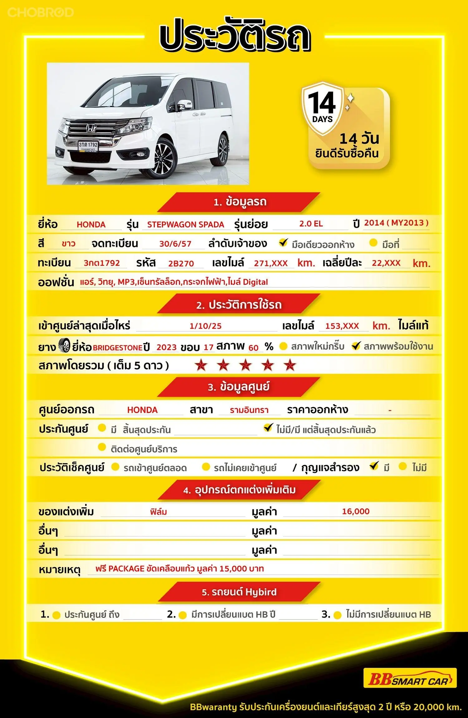 📍BBsmartcar สาขา 2 สี่แยกแครายใกล้เดอะมอลล์งามวงศ์วาน 💸price 639,000 บาท STEPWAGON SPADA 2.0 EL สี White Orchid Pearl รถ MPV ที่คุ้มค่าที่สุดสำหรับครอบครัวยุคใหม่ ขับง่าย คล่องตัว รถศูนย์แท้ ไร้อุบัติเหตุ สภาพป้ายแดงคุ้มมาก ประหยัดจากราคาป้ายแดงไปกว่า 5 แสนบาท 💎รับประกันไมล์แท้ 100% กรณีตรวจพบการกรอไมล์ ยินดีคืนเงินเต็มจำนวน 💎รับประกันโครงสร้างรถ ไม่เคยประสบอุบัติเหตุหนัก พลิกคว่ำ น้ำท่วม หรือไฟไหม้ โครงสร้างและแชสซีอยู่ในสภาพสมบูรณ์ สติกเกอร์และแผ่นเพลทครบถ้วน 💎BB Care Plus รับประกันหลังการขายสูงสุด 2 ปี หรือ 20,000 km. 💎ไม่พอใจ ยินดีคืนเงินภายใน 14 วัน 🔥คลิ๊กที่ลิงก์เพื่อดู วิดีโอคันนี้,ประวัติรถ,รูปภาพภายนอกและรูปภายใน https://www.bbsmartcar.com/web-php/index.php/site/cardetail/202512076962D7F4449C 🔥เรามีรถรุ่นนี้ให้เลือกชมอีก 3 คัน https://www.bbsmartcar.com/web-php/index.php/site/car?name_brand=HONDA&modelCar=STEP%20WAGON&search=one 🔥มีรถให้เลือกมากกว่า 1,800 คัน https://www.bbsmartcar.com/web-php/index.php/site/home NO. 2B270 Brand. : HONDA Year. : 2014 Model. : STEP WAGON Grade. : SPADA 2.0 EL Engine. : 2000 CC Type. : เบนซิน Gearbox : AT Color. : ขาว Mileage. : 272,000 KM. (ซื้อสด ราคานี้ยังไม่รวมค่าดำเนินการ 10,000 บ.) เงินดาวน์ : 0 บาท ประกันภัย : ฟรีประกันภัย 1 ปี ค่าดำเนินการ : 10,000 บาท รวมออกรถ : 0 บาท ผ่อน 72 งวด = 12,339 บาท ผ่อน 84 งวด = 11,496 บาท 🎗จุดเด่นออฟชั่น รถสวยๆ วันนี้ขอแนะนำ HONDA STEP WAGON SPADA 2.0 EL AT เบนซิน 2014 จุดเด่นออฟชั่น 1 : ไฟหน้าโปรเจ็คเตอร์, ไฟท้าย LED, สปอยเลอร์หลัง 2 : ใช้พื้นห้องโดยสารเป็นวัสดุไม้ Laminated และใช้วัสุดเบาะแบบหนังแท้ 3 : ด้านหน้าแผงสวิทช์ขวามือผู้ขับ ประกอบไปด้วย ปุ่ม ECON ทางขวาสุดบริเวณช่องแอร์, ปุ่ม Idling Stop 🎗ภายใน ภายในห้องโดยสาร ด้วยกุญแจระบบ Keyless ทำให้การปลดล๊อกประตูทำได้ง่ายเพียงเอามือแตะที่ประตู ก็ปลดล๊อกอัตโนมัติ พวงมาลัย 3 ก้าน ที่มาพร้อมปุ่ม Multifunction, Cruise Control, ปุ่มรับ-วางสายโทรศัพท์, ปุ่มควบคุมจอ MID บนหน้าจอ Entertainment ที่แผงคอนโซลกลางรองรับทั้ง MP3, USB, DVD พร้อมระบบนำทาง ระบบเชื่อมต่อ Wifi และ Bluetooth โดยส่งกำลังเสียงผ่านลำโพง 6 ตัว 12.2.3 : ด้านหน้าแผงสวิทช์ขวามือผู้ขับ ประกอบไปด้วย ปุ่ม ECON ทางขวาสุดบริเวณช่องแอร์, ปุ่ม Idling Stop ปุ่มประตูสไลด์ ปุ่ม VSA ระบบเบรก ดิสก์ 4 ล้อ พร้อม ABS ประกอบไปด้วย ถุงลมนิรภัย Dual SRS, ระบบเบรก ABS, ระบบควบคุมการทรงตัว VSA, ระบบช่วยออกตัวบนทางชัน HSA, ไฟส่องสว่างด้านข้างอัตโนมัติขณะเลี้ยว ACL, กล้องมองภาพหลัง, กุญแจ Immobilizer พร้อมสัญญาณกันขโมย 🎗ภายนอก ตัวรถสีขาวมาพร้อม ไฟหน้าโปรเจ็คเตอร์, ไฟท้าย LED, สปอยเลอร์หลัง, กระจังหน้าโครเมียม, ประตูสไลด์ข้างด้วยระบบไฟฟ้า ด้านบนหลังคามีจุดเด่นที่หลังคากระจก Skyroof ที่เปิดได้กว้างขวาง 🎗ความคุ้มค่า รถสภาพนี้หายากมากค่ะบอกเลย รถไมล์แท้อีกด้วย คัดเลือกคันนี้มาแล้วค่ะสภาพดีมากๆ เทียบกับราคานี้ถือว่าคุ้มค่ามากๆค