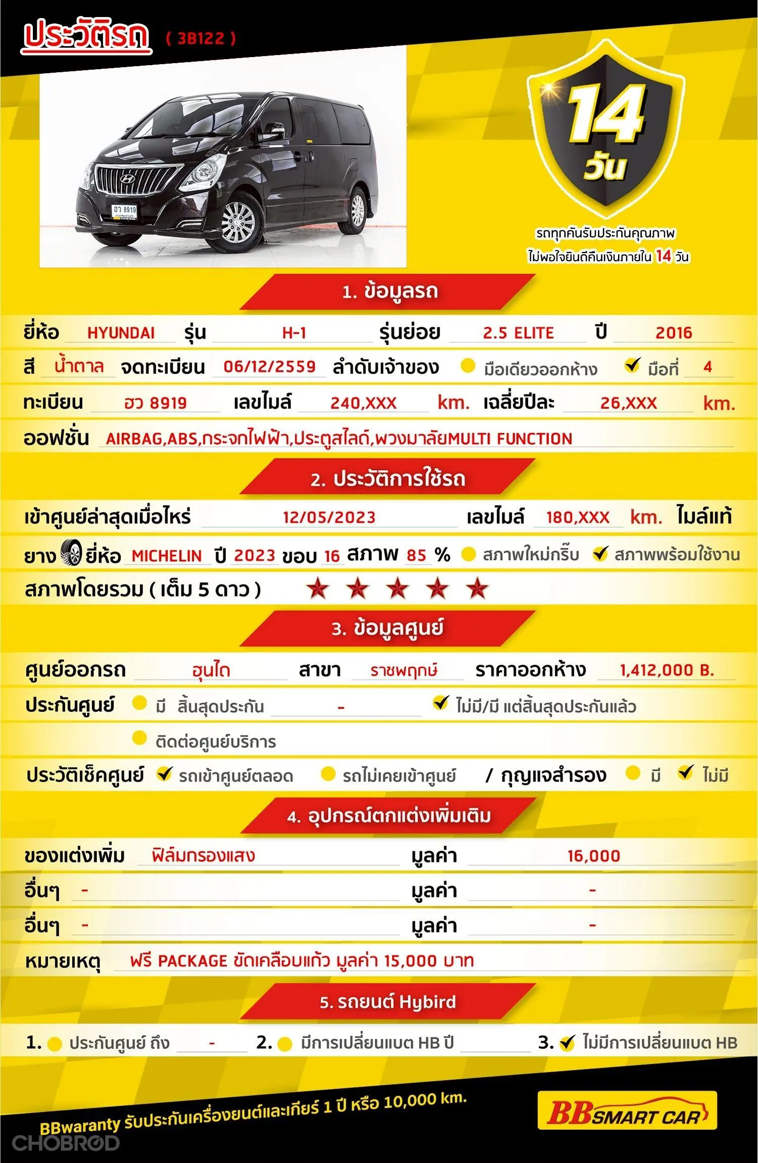 HYUNDAI 2.5 ELITE AT 2016 ออกรถ 0 บาท จัดได้ 589,000 บ. Line:@*******แสดงข้อมูล 🔥 จอง 199 บาท ส่งบัตรประชาชน รู้ผลอนุมัติภายใน 30 นาที ไม่ผ่านคืนเงินจองทุกกรณี 🔥 ซื้อรถกับ BB พร้อมให้คำปรึกษา แก้ทุกปัญหา ให้ทุกเรื่อง บริการ call center 24 ชม. 🔥 BB Care Plus รับประกันหลังการขาย สูงสุด 2 ปี หรือ 20,000 km. 🔥 มีรถให้เลือกมากกว่า 1,800 คัน บีบี3 สาขาบางใหญ่ (ใกล้โลตัสบางใหญ่ ) รหัสรถ 3B122 ราคา 569,000 บ. ผ่อนเพียง 10,596 บ. Brand : HYUNDAI Year : 2016 Model : H-1 Grade : 2.5 ELITE Engine : 2500 CC. Type : ดีเซล Gearbox : A/T Color : น้ำตาล Mileage : 240,xxx km. (ซื้อสด ราคานี้ยังไม่รวมค่าดำเนินการ 10,000 บ.) 🚩 Price : 569,000 บาท ยอดจัด : 579,000 บาท เงินดาวน์ : ฟรีเงินดาวน์ ประกันภัย : ฟรีประกันภัย 1 ปี ค่าดำเนินการ : 10,000 บาท รวมออกรถ : 0 บาท ผ่อน 36 = 19,549 บาท ผ่อน 48 = 15,173 บาท ผ่อน 60 = 12,652 บาท ผ่อน 72 = 11,374 บาท ผ่อน 84 = 10,596 บาท *เงื่อนไขเป็นไปตามที่ไฟแนนซ์กำหนด โปรโมชั่นพิเศษ สำหรับลูกค้าเครดิตดี 🚩เลือกรับเรทดอกเบี้ยพิเศษ 📍36 งวด = 1.29% 📍48 งวด = 1.99% 📍60 งวด = 2.39% 📍72 งวด = 3.59% 🔥 เงื่อนไข โปรโมชั่น ดอกเบี้ยเริ่มต้น 1.29% ตลอดอายุสัญญา - ยอดจัดไฟแนนซ์ 300,000-600,0000 บาท - ผ่อนสูงสุด 72 เดือน - เป็นลูกค้าประวัติดี พนักงานประจำ เงินเดือน 20,000 บาท ขึ้นไป - ค่าดำเนินการแคมเปญ 20,000 บาท (รวมในยอดจัดได้) 🎗Car Hightlight ออกแบบด้วยความสมบูรณ์แบบในทุกมิติ ด้วยการออกแบบขนาดของตัวรถที่กว้าง และลงตัวด้วยลวดลายการออกแบบที่ดูหรูหรา ด้วยกระจังหน้าขนาดใหญ่ กับสัดส่วนที่พอดีทำให้ Hyundai H-1 ดูเป็นรถยนต์ครอบครัวที่เหมาะแก่ครอบครัวใหญ่ที่รักการเดินทาง พร้อมความเป็นส่วนตัวและหรูหรา 🎗ภายใน. ออกแบบมาเป็นรถตู้ แอร์ราว กุญแจรีโมท-สัญญานกันขโมย Airbag พวงมาลัย Multifunction กระจกมองข้างปรับไฟฟ้า จอ LCD เล่น DVD แอร์ วิทยุ - CD พวงมาลัยเพาเวอร์ เบาะหนังแท้ กระจกไฟฟ้า เซ็นทรัลล๊อก เบรค ABS เซนเซอร์รอบคัน เซนเซอร์ถอยหลัง 🎗ภายนอก. ใช้เครื่องยนต์เทอร์โบดีเซลคอมมอนเรล ขนาด 2.5 ลิตร ไฟเลี้ยวกระจกมองข้าง กล้องส่องหลัง ไฟตัดหมอก กระจกมองข้างพับไฟฟ้า ไฟซีนอน เพียบพร้อมด้วยระบบความปลอดภัยครบครัน รวมถึงอุปกรณ์มาตรฐานและอุปกรณ์อำนวยความสะดวกให้แก่ผู้ขับขี่และผู้โดยสารตลอดการเดินทาง 🎗ความคุ้มค่า คัดเลือกคันนี้มาแล้วค่ะสภาพดีมากๆ เทียบกับราคานี้ถือว่าคุ้มค่ามากๆค่ะ มาดูรถไม่ผิดหวังแน่นนอนค่ะ ⭐การรับประกันหลังการขาย BB Care Plus สูงสุด 2 ปี หรือ 20,000 km. ด้วยช่างที่ผ่านการอบรมจากศูนย์ชั้นนำของประเทศ 🎉Special offer เฉพาะ บีบีสมาร์ทคาร์ ที่นี่ที่เดียว ⭐ดอกเบี้ยเริ่มต้น 1.29% มีไฟแนนซ์รองรับหลายที่ค่ะ ⭐ฟรี!! แพคเก็จ ขัดเคลือบแก้ว มูลค่า 15,000 บาท ทุกคัน ⭐อนุมัติไว 30 นาที นำเอกสารมาให้ครบรับรถกลับบ้านทันทีค่ะ ⭐BB Care Plus รับประกันหลังการขาย สูงสุด 2 ปี หรือ 20,000 km. ⭐มี 6 สาข