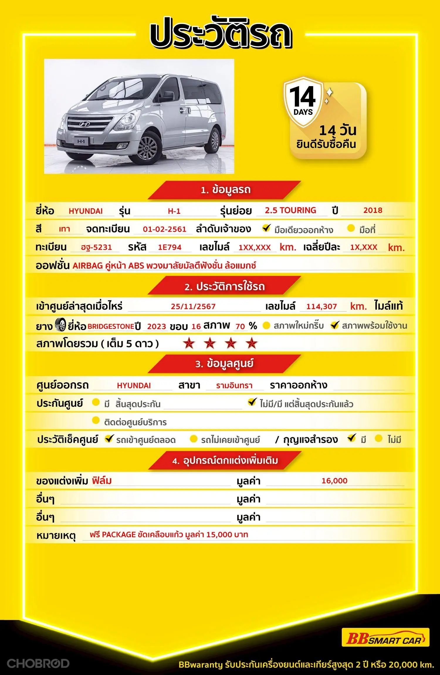 มีการรับประกันจากดีลเลอร์ (6 เดือน) มีบริการช่วยเหลือฉุกเฉินบนท้องถนน 24 ชม. จากดีลเลอร์