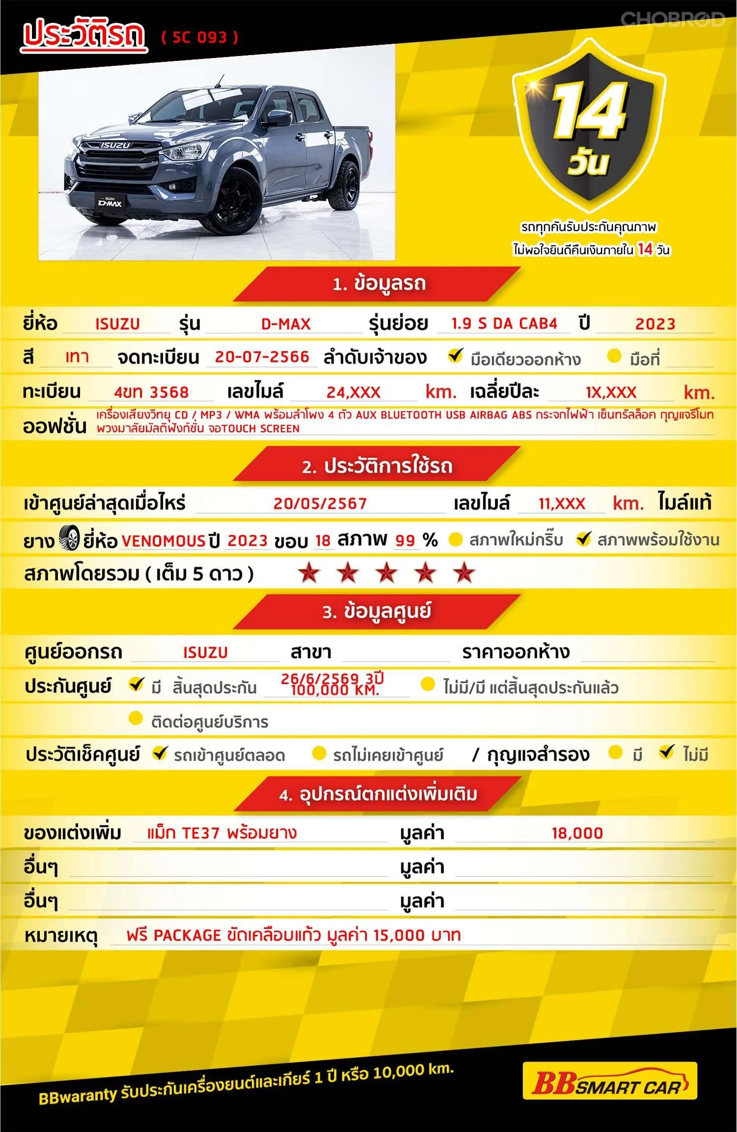 มีการรับประกันจากดีลเลอร์ (6 เดือน) มีบริการช่วยเหลือฉุกเฉินบนท้องถนน 24 ชม. จากดีลเลอร์
