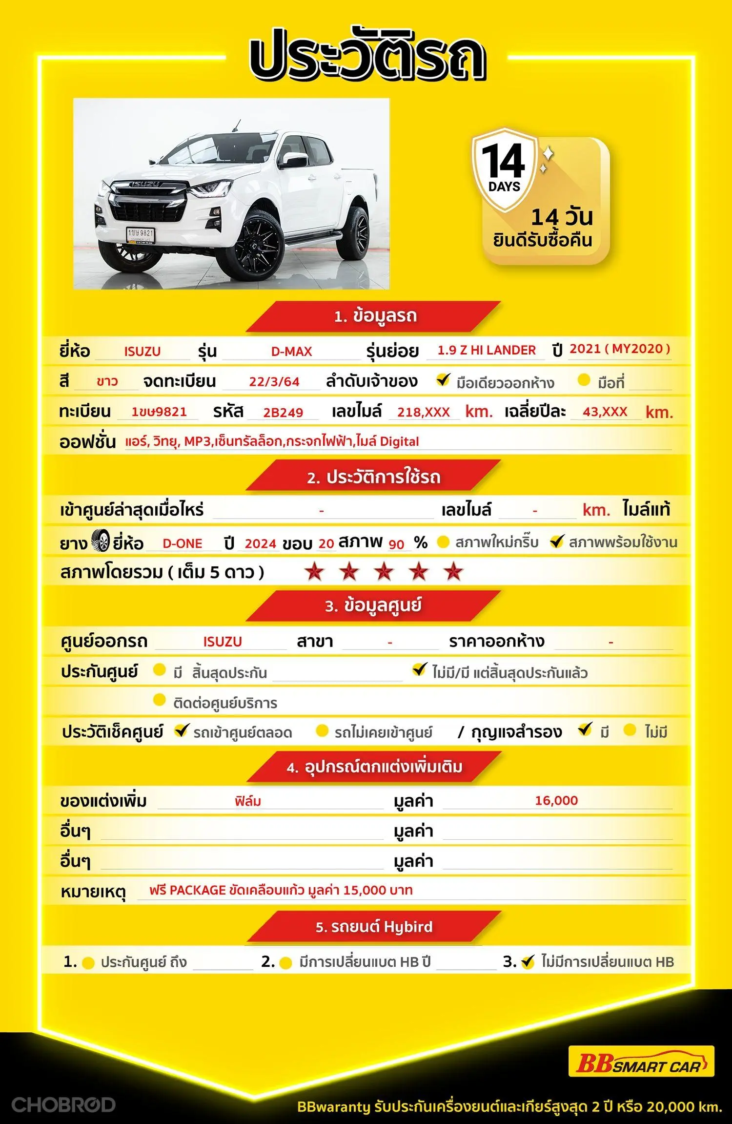 ISUZU D-MAX 1.9 Z HI-LANDER CAB-4 AT 2021 ออกรถ 0 บาท รหัสรถ 2B249 Line ID : @bbcar02 🔥มีรถให้เลือกมากกว่า 1,800 คัน 🔥รถทุกคันผ่านตรวจสอบ Inspection เรียบแล้วค่ะ ผ่าน 5 ดาวทุกคันค่ะ 🔥ซื้อรถกับ BB พร้อมให้คำปรึกษา แก้ทุกปัญหา ให้ทุกเรื่อง บริการ call center 24 ชม. 🔥BB Care Plus รับประกันหลังการขาย สูงสุด 2 ปี หรือ 20,000 km. 🔥ฟรี!! แพคเก็จ ขัดเคลือบแก้ว มูลค่า 15,000 บาท ทุกคัน 🔥มี 6 สาขา ในกรุงเทพและปริมณฑลใกล้บ้านท่าน สาขา2 สี่แยกแครายใกล้เดอะมอลล์งามวงศ์วาน รหัสรถ 2B249 ราคา 499,000 บาท ผ่อนเพียง 8,521 บาท Brand. : ISUZU Year. : 2021 Model. : D-MAX Grade. : 1.9 Z HI-LANDER CAB-4 Engine. : 1900 CC Type. : ดีเซล Gearbox : AT Color. : ขาว Mileage. : 219,000 KM. (ซื้อสด ราคานี้ยังไม่รวมค่าดำเนินการ 10,000 บ.) 🚩 Price. 499,000 บาท ยอดจัด : 509,000 บาท เงินดาวน์ : 0 บาท ประกันภัย : ฟรีประกันภัย 1 ปี ค่าดำเนินการ : 10,000 บาท รวมออกรถ : 0 บาท ผ่อน 36 งวด = 16,395 บาท ผ่อน 48 งวด = 12,613 บาท ผ่อน 60 งวด = 10,480 บาท ผ่อน 72 งวด = 9,375 บาท ผ่อน 84 งวด = 8,521 บาท ***เงื่อนไขเป็นไปตามที่ไฟแนนซ์กำหนด*** โปรโมชั่นพิเศษ สำหรับลูกค้าเครดิตดีลือกรับเรทดอกเบี้ยพิเศษ 📍36 งวด = 1.29 % 📍48 งวด = 1.99 % 📍60 งวด = 2.39 % 📍72 งวด = 3.59 % 🔥 เงื่อนไข โปรโมชั่น ดอกเบี้ยเริ่มต้น 1.29% ตลอดอายุสัญญา - ยอดจัดไฟแนนซ์ 300,000-600,000 บาท - ผ่อนสูงสุด 72 เดือน - เป็นลูกค้าประวัติดี พนักงานประจำเงินเดือน 20,000 ขึ้นไป - ค่าดำเนินการแคมเปญ 20,000 บาท (รวมในยอดจัดได้) 🎗Car Hightlight ISUZU D-MAX 1.9 Z CAB4 HI-LANDER เป็นรุ่นย่อยที่มีออปชันและอุปกรณ์อำนวยความสะดวกครบครันกว่ารุ่น L หรือ S โดยทั่วไปจะมาพร้อมไฟหน้า LED, หน้าจอสัมผัส, กล้องมองหลัง และระบบควบคุมความเร็วอัตโนมัติ (Cruise Control) ใช้เครื่องยนต์ดีเซล 1.9 Ddi Blue Power 🎗ภายใน ไมล์ Digital Airbag พวงมาลัย Multifunction แอร์ Cruise Control กระจกมองข้างปรับไฟฟ้า กระจกไฟฟ้า แอร์ AUTO เซ็นทรัลล๊อก วิทยุ - CD เบรค ABS พวงมาลัยเพาเวอร์ ไฟเลี้ยวกระจกมองข้าง 🎗ภายนอก ตัวรถสีขาวมาพร้อม ไฟหน้าเดย์ไลท์+โปรเจตเตอร์ กระจกมองข้างพับไฟฟ้า ล้อแม็ก ไฟตัดหมอก 🎗ความคุ้มค่า สำหรับคันนี้หากเปรียบเทียบราคากับคุณภาพ คันนี้ถือว่าคุ้มค่ามากค่ะ ผ่อนสบายๆก็มีรถขับได้ รถดีมีคุณภาพแบบนี้รีบตัดสินใจซื้อได้เลราคานี้มาไวไปไวนะคะ