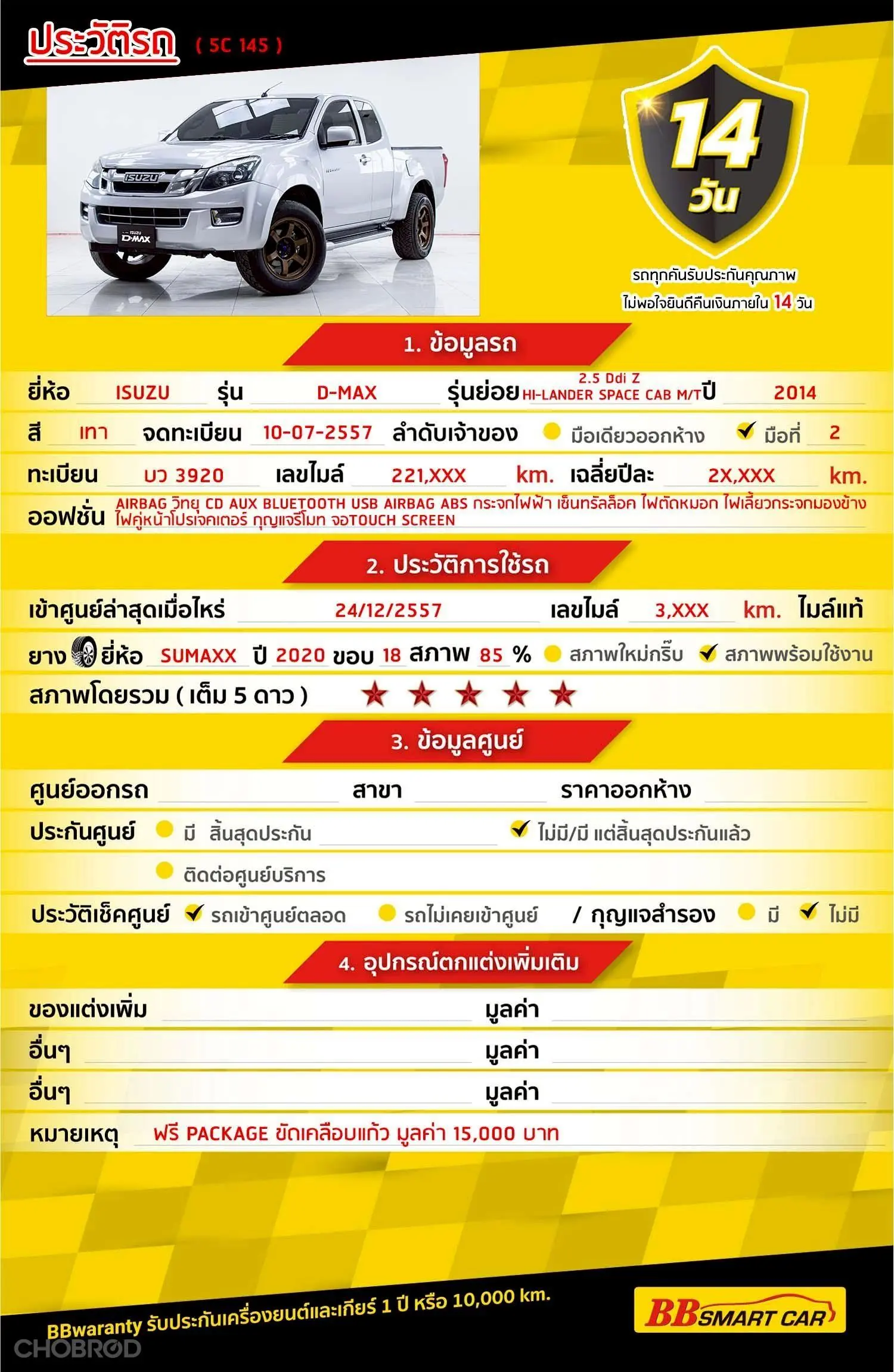 ISUZU D-MAX 2.5 Z HI-LANDER SPACECAB MT 2014 ออกรถ 0 บาท จัดได้ 324,000 บ. Line:@*******แสดงข้อมูล 🔥จอง 199 บาท ส่งบัตรประชาชน รู้ผลพิจารณาภายใน 30 นาที ไม่ผ่านคืนเงินจองทุกกรณี 🔥ซื้อรถกับ BB พร้อมให้คำปรึกษา แก้ทุกปัญหา ให้ทุกเรื่อง บริการ call center 24 ชม. 🔥BB Care Plus รับประกันหลังการขาย สูงสุด 2 ปี หรือ 20,000 km. 🔥มีรถให้เลือกมากกว่า 1,600 คัน สาขา5 ถ.เศรษฐกิจ ใกล้โลตัสมหาชัย รหัสรถ 5C145 ราคา 304,000 บาท ผ่อนเพียง 5,966 บาท Brand. : ISUZU Year. : 2014 Model. : D-MAX Grade. : 2.5 Z HI-LANDER SPACECAB Engine. :2500 CC Type. : ดีเซล Gearbox : M/T Color. : เทา Mileage. : 221,XXX km. (ซื้อสด ราคานี้ยังไม่รวมค่าดำเนินการ 10,000 บ.) 🚩 Price. 304,000 บาท ยอดจัด : 314,000 บาท เงินดาวน์ : 0 บาท ประกันภัย : ฟรีประกันภัย 1 ปี ค่าดำเนินการ : 10,000 บาท รวมออกรถ : 0 บาท ผ่อน36= 10,816 บาท ผ่อน48 = 8,446 บาท ผ่อน60 = 7,080 บาท ผ่อน72 = 6,388 บาท ผ่อน84 = 5,966 บาท เงื่อนไขเป็นไปตามที่ไฟแนนซ์กำหนด** โปรโมชั่นพิเศษ สำหรับลูกค้าเครดิตดีลือกรับเรทดอกเบี้ยพิเศษ 📍36 งวด = 2.59 % 📍48 งวด = 2.89 % 📍60 งวด = 3.29 % 📍72 งวด = 4.49 % 🔥เงื่อนไข โปรโมชั่น ดอกเบี้ยเริ่มต้น 2.59% ตลอดอายุสัญญา - ยอดจัดไฟแนนซ์ 300,000-600,000 บาท - ผ่อนสูงสุด 72 เดือน - เป็นลูกค้าประวัติดี - ค่าดำเนินการแคมเปญ 20,000 บาท (รวมในยอดจัดได้) 🎗Car Hightlight รถสวยๆ ISUZU D-MAX 2.5 Z HI-LANDER SPACECAB 2014 1.จอ LCD เล่น DVD 2.กระจกมองข้างปรับไฟฟ้า 3.ล้อแม็ก 🎗ภายใน กุญแจรีโมท-สัญญานกันขโมย เซ็นทรัลล๊อก จอ LCD เล่น DVD กระจกไฟฟ้า วิทยุ - CD พวงมาลัยเพาเวอร์ กระจกมองข้างปรับไฟฟ้า เบาะหนัง เบรค ABS แอร์ Airbag 🎗ภายนอก. ตัวรถสีเทา ไฟตัดหมอก บันไดข้าง คิ้วกันสาด ไฟเลี้ยวกระจกมองข้าง ล้อแม็ก ไฟโปรเจคเตอร์ กระจกมองข้างพับไฟฟ้า 🎗ความคุ้มค่า สำหรับคันนี้หากเปรียบเทียบราคากับคุณภาพ ถือว่าคุ้มค่ามากครับ ผ่อนสบายๆก็มีรถขับได้ รถดีมีคุณภาพแบบนี้รีบตัดสินใจซื้อได้เลย ราคานี้มาไวไปไวนะคะ ⭐️การรับประกันหลังการขาย BB Care Plus สูงสุด 2 ปี หรือ 20,000 km. ด้วยช่างที่ผ่านการอบรมจากศูนย์ชั้นนำของประเทศ 🎉Special offer เฉพาะ บีบีสมาร์ทคาร์ ที่นี่ที่เดียว ⭐ดอกเบี้ยเริ่มต้น 2.59% มีไฟแนนซ์รองรับหลายที่ค่ะ ⭐ฟรี!! แพคเก็จ ขัดเคลือบแก้ว มูลค่า 15,000 บาท ทุกคัน ⭐อนุมัติไว 30 นาที นำเอกสารมาให้ครบรับรถกลับบ้านทันทีค่ะ ⭐BB Care Plus รับประกันหลังการขาย สูงสุด 2 ปี หรือ 20,000 km. ⭐มี 6 สาขา ในกรุงเทพและปริมณฑลใกล้บ้านท่าน ⭐รถทุกคันผ่านตรวจสอบ Inspection เรียบร้อยแล้วค่ะ ผ่าน 5 ดาวทุกคันค่ะ ⭐เซลล์ทุกท่านเป็นมืออาชีพพร้อมให้บริการทุกท่านแน่นอนค่ะ