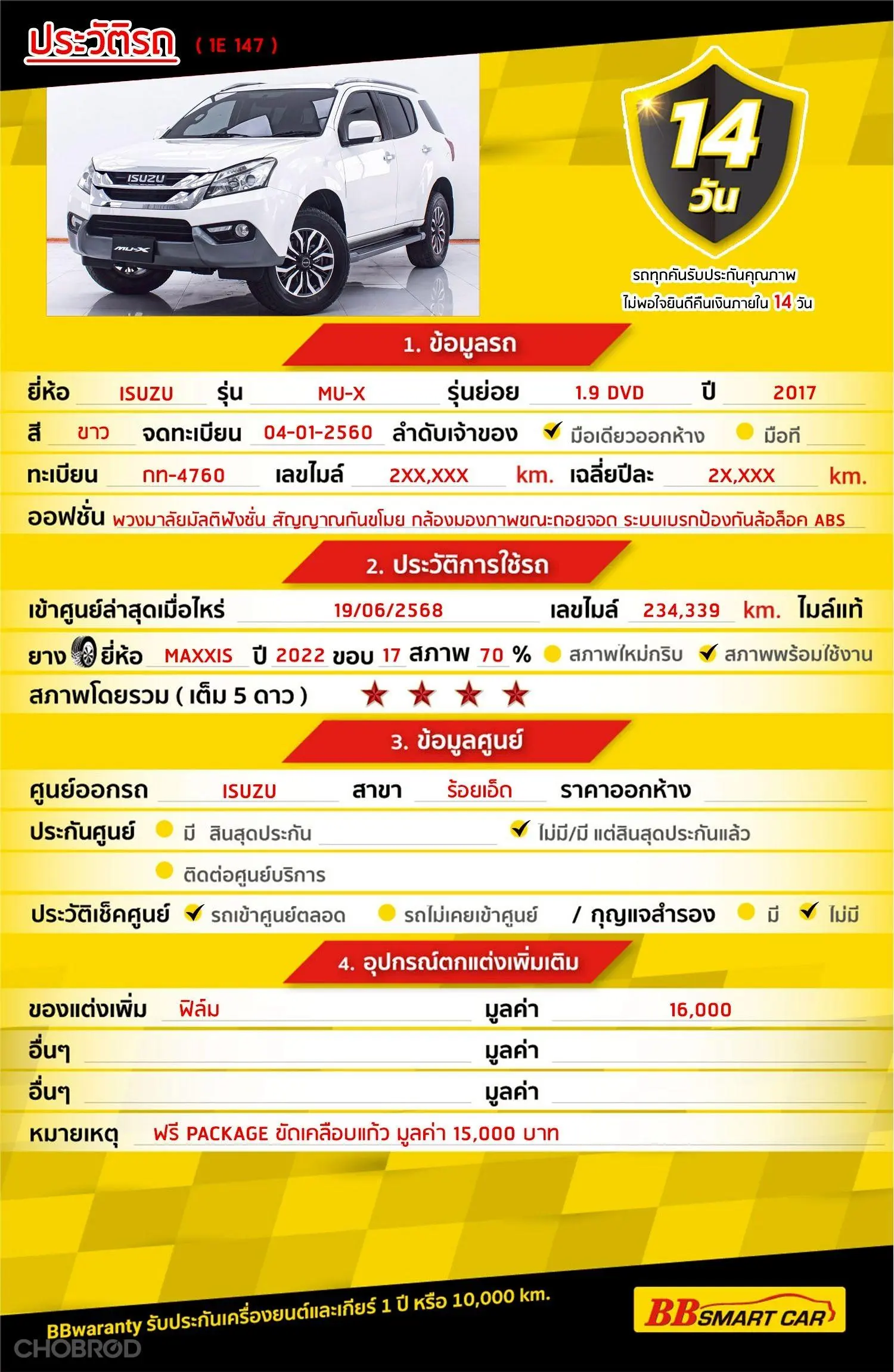 ISUZU MU-X 1.9 DVD AT 2017 ออกรถ 0 บาท จัดได้ 549,000 Line:***********แสดงข้อมูล 🔥จอง 199 บาท ส่งบัตรประชาชน รู้ผลพิจารณาภายใน 30 นาที ไม่ผ่านคืนเงินจองทุกกรณี 🔥ซื้อรถกับ BB พร้อมให้คำปรึกษา แก้ทุกปัญหา ให้ทุกเรื่อง บริการ call center 24 ชม. 🔥BB Care Plus รับประกันหลังการขาย สูงสุด 2 ปี หรือ 20,000 km.. 🔥มีรถให้เลือกมากกว่า 1,800 คัน สาขา 1 สี่แยกมไหสวรรย์ ใกล้เดอะมอลล์ท่าพระ รหัสรถ 1E147 ราคา 529,000 บาท ผ่อนเพียง 9,696 บาท Brand. : ISUZU Year. : 2017 Model. : MU-X Grade. : 1.9 DVD Engine. : 1900 CC Type. : ดีเซล Gearbox : AT Color. : ขาว Mileage. : 238,XXX KM. (ซื้อสด ราคานี้ยังไม่รวมค่าดำเนินการ 10,000 บ.) 🚩 Price. 529,000 บาท ยอดจัด : 539,000 บาท เงินดาวน์ : 0 บาท ประกันภัย : ฟรีประกันภัย 1 ปี ค่าดำเนินการ : 10,000 บาท รวมออกรถ : 0 บาท ผ่อน 36 งวด = 17,889 บาท ผ่อน 48 งวด = 13,884 บาท ผ่อน 60 งวด = 11,577 บาท ผ่อน 72 งวด = 10,408 บาท ผ่อน 84 งวด = 9,696 บาท เงื่อนไขเป็นไปตามที่ไฟแนนซ์กำหนด โปรโมชั่นพิเศษ สำหรับลูกค้าเครดิตดีลือกรับเรทดอกเบี้ยพิเศษ 📍36 งวด = 1.29 % 📍48 งวด = 1.99 % 📍60 งวด = 2.39 % 📍72 งวด = 3.59 % 🔥 เงื่อนไข โปรโมชั่น ดอกเบี้ยเริ่มต้น 1.29% ตลอดอายุสัญญา - ยอดจัดไฟแนนซ์ 300,000-600,000 บาท - ผ่อนสูงสุด 72 เดือน - เป็นลูกค้าประวัติดี พนักงานประจำเงินเดือน 20,000 ขึ้นไป - ค่าดำเนินการแคมเปญ 20,000 บาท (รวมในยอดจัดได้) 🎗Car Hightlight รถสวยๆ วันนี้ขอแนะนำ ISUZU MU-X 1.9 DVD AT 2017 จุดเด่นออฟชั่น 1 : ไฟหน้า Projector Lens Bi-LED ไฟ Daytime Running Light ในโคมไฟหน้า ไฟหรี่ LED Guiding Light 2 : เบาะนั่งหุ้มด้วยหนังดีไซน์ใหม่ Sport Cut เบาะนั่งคนขับปรับด้วยไฟฟ้า 6 ทิศทาง 3 : พวงมาลัยมัลติฟังชั่น 🎗ภายใน วัสดุตกแต่งคอนโซลกลาง, เกียร์, ช่องแอร์ สีเงิน/โครเมียม มาตรวัดเรืองแสง Optitron จอแสดงข้อมูล MID Multi-Information Display แบบ สี หน้าจอเครื่องเสียง iConnect ขนาด 8 นิ้ว AM/FM CD MP3 ระบบ Air Mirroring ระบบเชื่อมต่อไร้สาย Bluetooth ช่องเชื่อมต่อ AUX / USB ช่องชาร์จไฟ 220V ลำโพง 8 ตำแหน่ง พร้อม Roof Speaker บนเพดาน กล้องบันทึกภาพด้านหน้ารถ DVR Built-in กับกระจกมองหลัง กระจกมองหลัง ปรับลดแสงแบบอัตโนมัติ ระบบกุญแจ Smart Keyless Entry ปุ่มสตาร์ทเครื่องยนต์ Push Start Button ระบบ ISS (idilling Start/Stop System) ระบบล็อกรถอัตโนมัติเมื่อรถวิ่งด้วยความเร็วเกิน 20km/h กล้องมองภาพขณะถอยจอด พร้อมเส้นกะระยะ Lane Guide สัญญาณกันขโมย ระบบเบรก ด้านหน้าดิสก์เบรก / ด้านหลังดิสก์เบรก ระบบเบรกป้องกันล้อล็อค ABS ระบบกระจายแรงเบรก EBD ระบบเสริมแรงเบรก BA ระบบควบคุมการทรงตัว ESC ระบบป้องกันการลื่นไถล และ ล้อหมุนฟรี TCS ระบบช่วยออกตัวบนทางลาดชัน HSA ระบบควบคุมความเร็วขณะลงทางลาดชัน HDC ถุงลมนิรภัยคู่หน้า 2 ตำแหน่ง 🎗ภายนอก ไฟท้าย ไฟหรี่ LED Tube ราวหลังคา บุนุ่มบริเวณแผงแดชบอร์ดด้านหน้า เสาอากาศแบบครีบฉลาม Shark Fin ล้อแมกซ์ 17 นิ้ว กระจกมองข้างสีเดียวกับตัวรถ กระจกมองข้าง ปรับและพับด้วยไฟฟ้า พร้อมไฟเลี้ยวในตัว มือเปิดประตูภายนอก สีเดียวกับตัวร