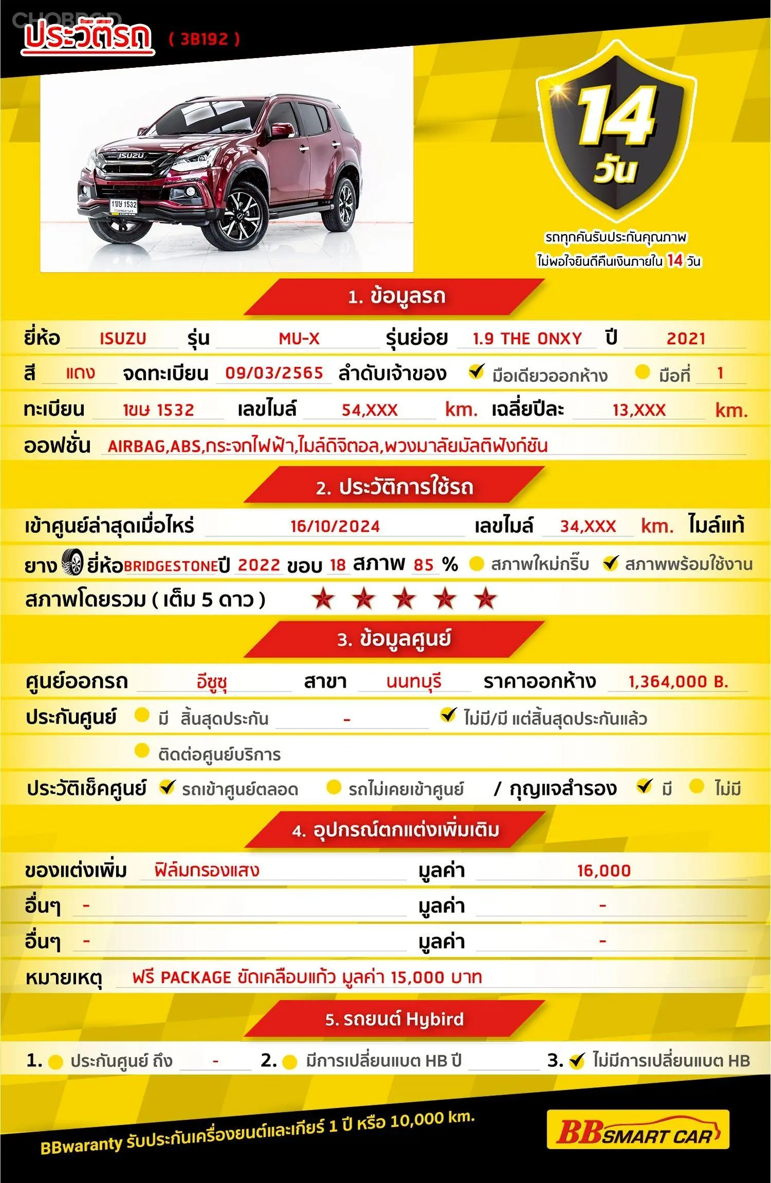 ISUZU MU-X 1.9 THE ONYX AT 2020 ออกรถ 0 บาท จัดได้ 739,000 บ. Line:@*******แสดงข้อมูล 🔥จอง 199 บาท ส่งบัตรประชาชน รู้ผลอนุมัติภายใน 30 นาที ไม่ผ่านคืนเงินจองทุกกรณี 🔥 ซื้อรถกับ BB พร้อมให้คำปรึกษา แก้ทุกปัญหา ให้ทุกเรื่อง บริการ call center 24 ชม. 🔥 BB Care Plus รับประกันหลังการขาย สูงสุด 2 ปี หรือ 20,000 km. 🔥 มีรถให้เลือกมากกว่า 1,800 คัน สาขา 3 ถนนกาญจนาภิเษก ใกล้โลตัสบางใหญ่ รหัสรถ 3B192 ราคา 719,000 บ. ผ่อนเพียง 12,707 บ. Brand : ISUZU Year : 2020 Model : MU-X Grade : 1.9 THE ONYX Engine : 1900 cc. Type : ดีเซล Gearbox : AT Color : แดง Mileage : 54,XXX km. (ซื้อสด ราคานี้ยังไม่รวมค่าดำเนินการ 10,000 บ.) 🚩 Price : 719,000 บาท ยอดจัด : 729,000 บาท เงินดาวน์ : ฟรีเงินดาวน์ ประกันภัย : ฟรีประกันภัย 1 ปี ค่าดำเนินการ : 10,000 บาท รวมออกรถ : 0 บาท ผ่อน 36 = 24,447 บาท ผ่อน 48 = 18,807 บาท ผ่อน 60 = 15,626 บาท ผ่อน 72 = 13,980 บาท ผ่อน 84 = 12,707 บาท *เงื่อนไขเป็นไปตามที่ไฟแนนซ์กำหนด โปรโมชั่นพิเศษ สำหรับลูกค้าเครดิตดี 🚩เลือกรับเรทดอกเบี้ยพิเศษ 📍36 งวด = 1.29% 📍48 งวด = 1.99% 📍60 งวด = 2.39% 📍72 งวด = 3.59% 🔥 เงื่อนไข โปรโมชั่น ดอกเบี้ยเริ่มต้น 1.29% ตลอดอายุสัญญา - ยอดจัดไฟแนนซ์ 300,000-600,0000 บาท - ผ่อนสูงสุด 72 เดือน - เป็นลูกค้าประวัติดี พนักงานประจำ เงินเดือน 20,000 บาท ขึ้นไป - ค่าดำเนินการแคมเปญ 20,000 บาท (รวมในยอดจัดได้) 🎗Car Hightlight . รถ PPV ที่มาพร้อมความอเนกประสงค์ ที่รองรับการใช้งานในทุกไลฟ์สไตล์ โดยมีการดีไซน์รูปลักษณ์ภายนอกให้มีความสง่างาม และดูภูมิฐาน แต่ก็แฝงไปด้วยความสปอร์ตกับความหรูหรา มาพร้อมเครื่องยนต์ที่มีความแรง และเป็นมิตรกับสิ่งแวดล้อม 🎗ภายใน.กระจกมองข้างปรับไฟฟ้า เบรค ABS แอร์ AUTO เซ็นทรัลล๊อก กุญแจรีโมท-สัญญานกันขโมย Airbag แอร์ราว เบาะหนังแท้ แอร์ จอ LCD เล่น DVD พวงมาลัยเพาเวอร์ วิทยุ - CD เบาะไฟฟ้าคนขับ ไมล์ Digital Cruise Control Navigator พวงมาลัย Multifunction 🎗ภายนอก.ตัวรถเป็นสีแดง กระจกไฟฟ้า บันไดข้าง กล้องส่องหลัง ไฟโปรเจคเตอร์ ไฟเลี้ยวกระจกมองข้าง ไฟตัดหมอก กระจกมองข้างพับไฟฟ้า ไฟซีนอน 🎗ความคุ้มค่า. ISUZU MU-X เป็นรถ PPV ที่มีรูปลักษณ์ที่สง่างาม และหรูหรา แต่ก็ยังแอบแฝงความสปอร์ตไว้ในตัว รวมถึงยังมีเครื่องยนต์ที่ให้ทั้งความแรง ควบคู่ไปกับการประหยัดน้ำมัน ปิดท้ายด้วยเรื่องระบบความปลอดภัยที่มีประสิทธิภาพ ⭐การรับประกันหลังการขาย BB Care Plus สูงสุด 2 ปี หรือ 20,000 km. ด้วยช่างที่ผ่านการอบรมจากศูนย์ชั้นนำของประเทศ 🎉Special offer เฉพาะ บีบีสมาร์ทคาร์ ที่นี่ที่เดียว ⭐ดอกเบี้ยเริ่มต้น 1.29% มีไฟแนนซ์รองรับหลายที่ค่ะ ⭐ฟรี!! แพคเก็จ ขัดเคลือบแก้ว มูลค่า 15,000 บาท ทุกคัน ⭐อนุมัติไว 30 นาที นำเอกสารมาให้ครบรับรถกลับบ้านทันทีค่ะ ⭐BB Care Plus รับประกันหลังการขาย สูงสุด 2 ปี หรือ 20,000 km. ⭐มี 6 สาขา ในกรุงเทพและปริมณฑลใกล้บ้านท่าน ⭐รถทุกคันผ่านตรวจสอบ Inspection เรียบแล้วค่ะ ผ่าน 