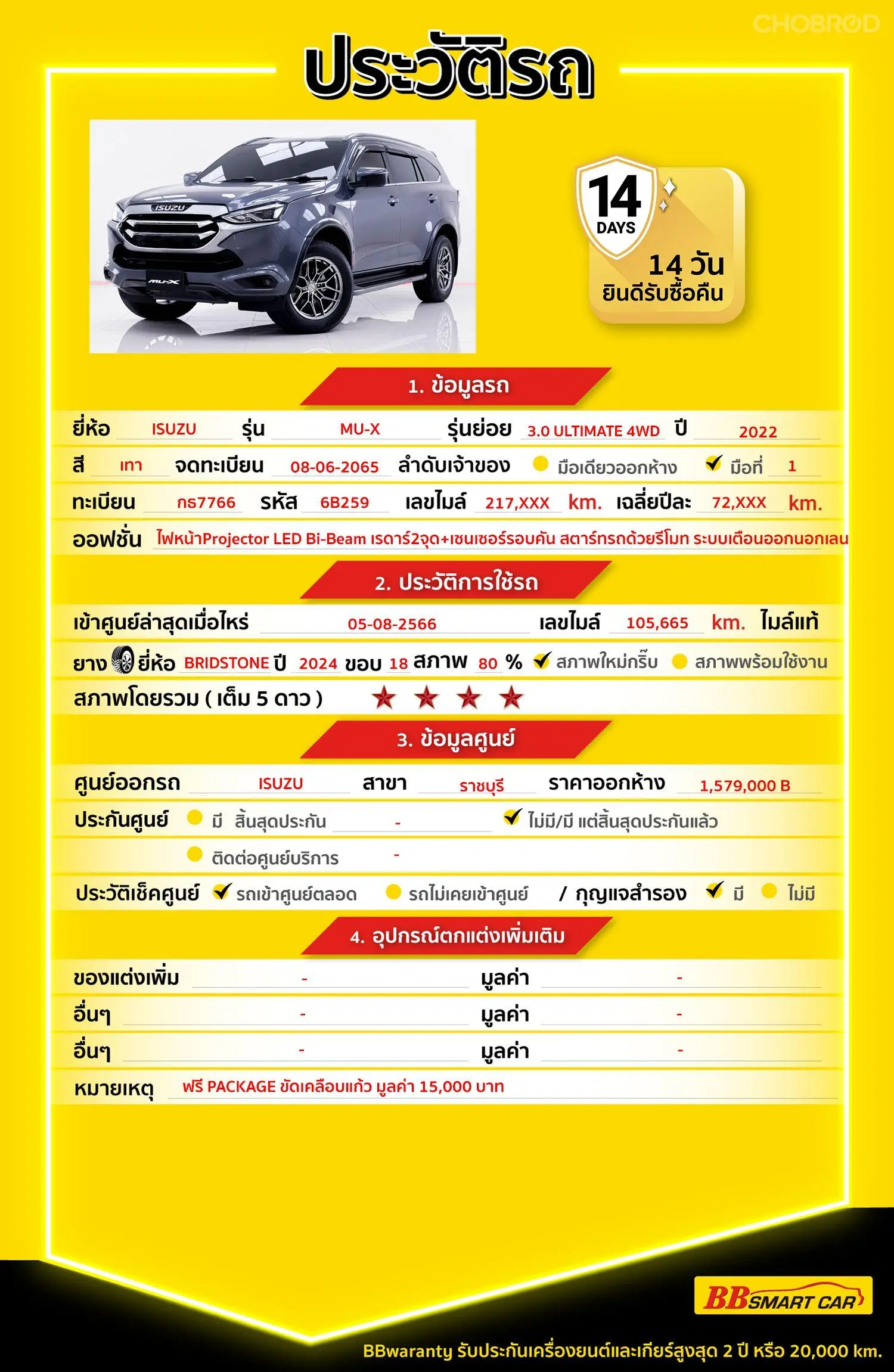 ISUZU MU-X 3.0 ULTIMATE 4WD AT 2022 ออกรถ 0 บาท จัดได้ 909,000 บ. Line:@*******แสดงข้อมูล 🔥จอง 199 บาท ส่งบัตรประชาชน รู้ผลพิจารณาภายใน 30 นาที ไม่ผ่านคืนเงินจองทุกกรณี 🔥ซื้อรถกับ BB พร้อมให้คำปรึกษา แก้ทุกปัญหา ให้ทุกเรื่อง บริการ call center 24 ชม. 🔥BB Care Plus รับประกันหลังการขาย สูงสุด 2 ปี หรือ 20,000 km.. 🔥มีรถให้เลือกมากกว่า 1,800 คัน สาขา 6 ศูนย์รวมรถยนต์ไอคาร์สยาม กาญจนาภิเษก รหัสรถ 6B259 ราคา 889,000 บาท ผ่อนเพียง 15,720 บาท Brand. : ISUZU Year. : 2022 Model. : MU-X Grade. : 3.0 ULTIMATE 4WD Engine. : 3,000 CC Type. : ดีเซล Gearbox : AT Color. : เทา Mileage. : 217,xxx KM. (ซื้อสด ราคานี้ยังไม่รวมค่าดำเนินการ 10,000 บ.) 🚩 Price. 889,000 บาท ยอดจัด : 899,000 บาท เงินดาวน์ : 0 บาท ประกันภัย : ฟรีประกันภัย 1 ปี ค่าดำเนินการ : 10,000 บาท รวมออกรถ : 0 บาท ผ่อน 36 = 30,246 บาท ผ่อน 48 = 23,268 บาท ผ่อน 60 = 19,333 บาท ผ่อน 72 = 17,295 บาท ผ่อน 84 = 15,720 บาท เงื่อนไขเป็นไปตามที่ไฟแนนซ์กำหนด โปรโมชั่นพิเศษ สำหรับลูกค้าเครดิตดี 🚩เลือกรับเรทดอกเบี้ยพิเศษ 📍36 งวด = 1.29 % 📍48 งวด = 1.99 % 📍60 งวด = 2.39 % 📍72 งวด = 3.59 % 🔥 เงื่อนไข โปรโมชั่น ดอกเบี้ยเริ่มต้น 1.29% ตลอดอายุสัญญา - ยอดจัดไฟแนนซ์ 300,000-600,0000 บาท - ผ่อนสูงสุด 72 เดือน - เป็นลูกค้าประวัติดี พนักงานประจำเงินเดือน 20,000 ขึ้นไป - ค่าดำเนินการแคมเปญ 20,000 บาท (รวมในยอดจัดได้) 🎗Car Hightlight รถสวยๆ วันนี้ขอแนะนำ ISUZU MU-X 3.0 ULTIMATE 4WD AT 2022 ออฟชั่น 12.2.1 :ระบบความปลอดภัย ADAS ครบ (กล้อง+เรดาร์, Adaptive Cruise, เตือนออกนอกเลน ฯลฯ) 12.2.2 :ภายในหรู เบาะคู่หน้าไฟฟ้า + จอสัมผัส 9 นิ้ว รองรับ Wireless CarPlay/Android Auto 12.2.3 :เครื่องยนต์ดีเซล 3.0 แรงบิดสูง 450 นิวตัน-เมตร พร้อมระบบขับเคลื่อน 4WD ลุยได้ทุกเส้นทาง 🎗ภายใน เซ็นทรัลล๊อก กระจกไฟฟ้า แอร์ AUTO Airbag เบรค ABS พวงมาลัย Multifunction พวงมาลัยเพาเวอร์ จอ LCD เล่น DVD กระจกมองข้างปรับไฟฟ้า เบาะไฟฟ้าคนขับ 🎗ภายนอก คิ้วกันสาด ไฟตัดหมอก บันไดข้าง ล้อแม็ก ไฟโปรเจคเตอร์ 🎗ความคุ้มค่า สำหรับคันนี้หากเปรียบเทียบราคากับคุณภาพ คันนี้ถือว่าคุ้มค่ามากค่ะ ผ่อนสบายๆก็มีรถขับได้ รถดีมีคุณภาพแบบนี้รีบตัดสินใจซื้อได้เลราคานี้มาไวไปไวนะคะ ⭐️การรับประกันหลังการขาย BB Care Plus สูงสุด 2 ปี หรือ 20,000 km. ด้วยช่างที่ผ่านการอบรมจากศูนย์ชั้นนำของประเทศ 🎉🎉Special offer เฉพาะ บีบีสมาร์ทคาร์ ที่นี่ที่เดียว ⭐️ ดอกเบี้ยเริ่มต้น 1.29% มีไฟแนนซ์รองรับหลายที่ค่ะ ⭐️ ฟรี!! แพคเก็จ ขัดเคลือบแก้ว มูลค่า 15,000 บาท ทุกคัน ⭐️ อนุมัติไว 30 นาที นำเอกสารมาให้ครบรับรถกลับบ้านทันทีค่ะ ⭐️ BB Care Plus รับประกันหลังการขาย สูงสุด 2 ปี หรือ 20,000 km. ⭐️ มี 6 สาขา ในกรุงเทพและปริมณฑลใกล้บ้านท่าน ⭐️ รถทุกคันผ่านตรวจสอบ Inspection เรียบแล้วค่ะ ผ่าน 5 ดาวทุกคันค่ะ ⭐️ เซลล์ทุกท่านเป็นมืออาชีพพร้อมให้บริการทุกท่านแน่นอนค่ะ