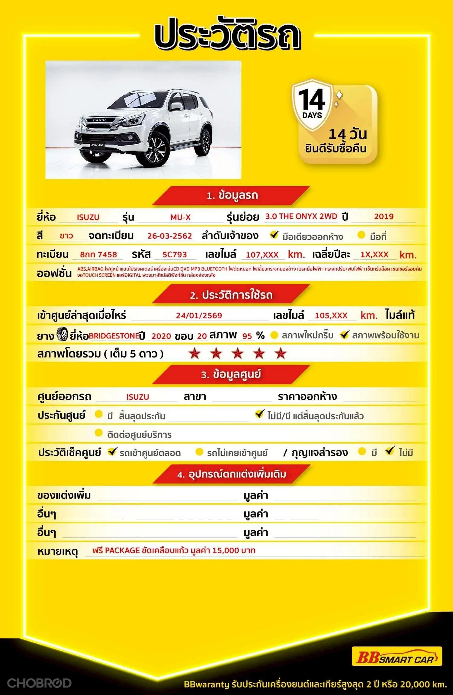 ISUZU MU-X 3.0 THE ONYX AT 2019 ออกรถ 0 บาท รหัสรถ 5C793 Line: ID @BBCAR05 คลิ๊กที่ลิงก์ เพื่อดู วิดีโอคันนี้,ประวัติรถ, รูปภาพภายนอกและรูปภายใน >> https://www.bbsmartcar.com/web-php/index.php/site/cardetail/2026040635B46D20E378 🔥มีรถให้เลือกมากกว่า 1,800 คัน 🔥รถทุกคันผ่านตรวจสอบ Inspection เรียบแล้วค่ะ ผ่าน 5 ดาวทุกคันค่ะ 🔥ซื้อรถกับ BB พร้อมให้คำปรึกษา แก้ทุกปัญหา ให้ทุกเรื่อง บริการ call center 24 ชม. 🔥BB Care Plus รับประกันหลังการขาย สูงสุด 2 ปี หรือ 20,000 km. 🔥ฟรี!! แพคเก็จ ขัดเคลือบแก้ว มูลค่า 15,000 บาท ทุกคัน 🔥มี 6 สาขา ในกรุงเทพและปริมณฑลใกล้บ้านท่าน สาขา5 ถ.เศรษฐกิจ ใกล้โลตัสมหาชัย รหัสรถ 5C793 ราคา 699,000 บาท ผ่อนเพียง 12,372 บาท Brand. : ISUZU Year. : 2019 Model. : MU-X Grade. : 3.0 THE ONYX Engine. : 3000 CC Type. : ดีเซล Gearbox : AT Color. : ขาว Mileage. : 107,XXX KM. (ซื้อสด ราคานี้ยังไม่รวมค่าดำเนินการ 10,000 บ.) 🚩 Price. 699,000 บาท ยอดจัด : 709,000 บาท เงินดาวน์ : 0 บาท ประกันภัย : ฟรีประกันภัย 1 ปี ค่าดำเนินการ : 10,000 บาท รวมออกรถ : 0 บาท ผ่อน 36 งวด = 23,803 บาท ผ่อน 48 งวด = 18,312 บาท ผ่อน 60 งวด = 15,215 บาท ผ่อน 72 งวด = 13,611 บาท ผ่อน 84 งวด = 12,372 บาท เงื่อนไขเป็นไปตามที่ไฟแนนซ์กำหนด โปรโมชั่นพิเศษ สำหรับลูกค้าเครดิตดีลือกรับเรทดอกเบี้ยพิเศษ 📍36 งวด = 1.29 % 📍48 งวด = 1.99 % 📍60 งวด = 2.39 % 📍72 งวด = 3.59 % 🔥 เงื่อนไข โปรโมชั่น ดอกเบี้ยเริ่มต้น 1.29% ตลอดอายุสัญญา - ยอดจัดไฟแนนซ์ 300,000-600,000 บาท - ผ่อนสูงสุด 72 เดือน - เป็นลูกค้าประวัติดี พนักงานประจำเงินเดือน 20,000 ขึ้นไป - ค่าดำเนินการแคมเปญ 20,000 บาท (รวมในยอดจัดได้) 🎗Car Hightlight ISUZU MU-X 3.0 THE ONYX 2019 AT ดีเซล จุดเด่นออฟชั่น 1 : กล้องส่องหลัง 2 : เซนเซอร์ถอยหลัง 3 : พวงมาลัย Multifunction 🎗ภายใน เบรค ABS จอ LCD เล่น DVD กระจกมองข้างปรับไฟฟ้า เซ็นทรัลล๊อก เบาะหนัง พวงมาลัย Multifunction กระจกไฟฟ้า วิทยุ - CD แอร์ AUTO Airbag 🎗ภายนอก ไฟเลี้ยวกระจกมองข้าง กระจกมองข้างพับไฟฟ้า กล้องส่องหลัง ไฟโปรเจคเตอร์ บันไดข้าง ไฟตัดหมอก แล็คหลังคา เซนเซอร์ถอยหลัง 🎗ความคุ้มค่า สำหรับคันนี้หากเปรียบเทียบราคากับคุณภาพ คันนี้ถือว่าคุ้มค่ามากค่ะ ผ่อนสบายๆก็มีรถขับได้ รถดีมีคุณภาพแบบนี้รีบตัดสินใจซื้อได้เลราคานี้มาไวไปไวนะคะ