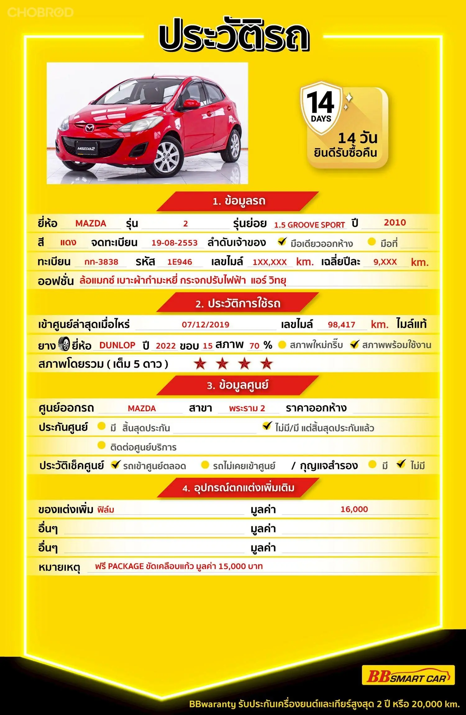MAZDA 2 1.5 GROOVE SPORT AT 2010 ออกรถ 0 บาท จัดได้ 139,000 บ Line:@bbsmartcar 🔥มีรถให้เลือกมากกว่า 1,800 คัน 🔥รถทุกคันผ่านตรวจสอบ Inspection เรียบร้อยแล้วค่ะ ผ่าน 5 ดาวทุกคันค่ะ 🔥ซื้อรถกับ BB พร้อมให้คำปรึกษา แก้ทุกปัญหา ให้ทุกเรื่อง บริการ call center 24 ชม. 🔥BB Care Plus รับประกันหลังการขาย สูงสุด 2 ปี หรือ 20,000 km. 🔥ฟรี!! แพคเก็จ ขัดเคลือบแก้ว มูลค่า 15,000 บาท ทุกคัน 🔥มี 6 สาขา ในกรุงเทพและปริมณฑลใกล้บ้านท่าน สาขา 1 สี่แยกมไหสวรรย์ ใกล้เดอะมอลล์ท่าพระ รหัสรถ 1E946 ราคา 119,000 บาท ผ่อนเพียง 2,620 บาท Brand. : MAZDA Year. : 2010 Model. : 2 Grade. : 1.5 GROOVE SPORT Engine. : 1500 CC Type. : เบนซิน Gearbox : AT Color. : แดง Mileage. : 144,XXX KM. (ซื้อสด ราคานี้ยังไม่รวมค่าดำเนินการ 10,000 บ.) 🚩 Price. 119,000 บาท ยอดจัด : 129,000 บาท เงินดาวน์ : 0 บาท ประกันภัย : ค่าดำเนินการ : 10,000 บาท รวมออกรถ : 0 บาท ผ่อน 36 งวด = 4,640 บาท ผ่อน 48 งวด = 3,681 บาท ผ่อน 60 งวด = 3,163 บาท ผ่อน 72 งวด = 2,838 บาท ผ่อน 84 งวด = 2,620 บาท เงื่อนไขเป็นไปตามที่ไฟแนนซ์กำหนด โปรโมชั่นพิเศษ สำหรับลูกค้าเครดิตดีลือกรับเรทดอกเบี้ยพิเศษ 📍36 งวด = 1.29 % 📍48 งวด = 1.99 % 📍60 งวด = 2.39 % 📍72 งวด = 3.59 % 🔥 เงื่อนไข โปรโมชั่น ดอกเบี้ยเริ่มต้น 1.29% ตลอดอายุสัญญา - ยอดจัดไฟแนนซ์ 300,000-600,000 บาท - ผ่อนสูงสุด 72 เดือน - เป็นลูกค้าประวัติดี พนักงานประจำเงินเดือน 20,000 ขึ้นไป - ค่าดำเนินการแคมเปญ 20,000 บาท (รวมในยอดจัดได้) 🎗Car Hightlight รถสวยๆ วันนี้ขอแนะนำ MAZDA 2 1.5 GROOVE SPORT AT 2010 จุดเด่นออฟชั่น 1 : ล้อแมกซ์ 2 : เบาะผ้ากำมะหยี่ 3 : กระจกปรับไฟฟ้า 🎗ภายใน AIRBAG ABS 🎗ภายนอก กระจกมองข้างสีเดียวกับตัวรถ กระจกมองข้าง ปรับและพับด้วยไฟฟ้า พร้อมไฟเลี้ยวในตัว มือเปิดประตูภายนอก สีเดียวกับตัวรถ ระบบปัดน้ำฝนด้านหน้า – ด้านหลัง ไฟท้าย LED ไฟ Daytime Running Lights (LED) 🎗ความคุ้มค่า สำหรับคันนี้หากเปรียบเทียบราคากับคุณภาพ คันนี้ถือว่าคุ้มค่ามากค่ะ ผ่อนสบายๆก็มีรถขับได้ รถดีมีคุณภาพแบบนี้รีบตัดสินใจซื้อได้เลราคานี้มาไวไปไวนะคะ