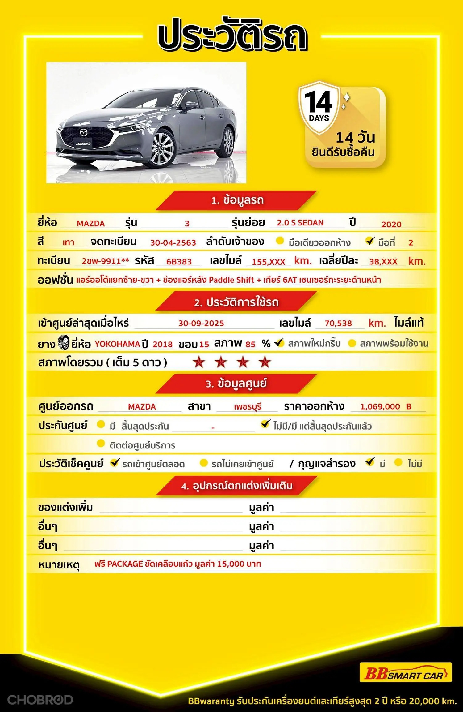 MAZDA 3 2.0 S SEDAN AT 2020 ออกรถ 0 บาท จัดได้ 569,000 บ. Line:@*******แสดงข้อมูล 🔥จอง 199 บาท ส่งบัตรประชาชน รู้ผลพิจารณาภายใน 30 นาที ไม่ผ่านคืนเงินจองทุกกรณี 🔥ซื้อรถกับ BB พร้อมให้คำปรึกษา แก้ทุกปัญหา ให้ทุกเรื่อง บริการ call center 24 ชม. 🔥BB Care Plus รับประกันหลังการขาย สูงสุด 2 ปี หรือ 20,000 km.. 🔥มีรถให้เลือกมากกว่า 1,800 คัน สาขา 6 ศูนย์รวมรถยนต์ไอคาร์สยาม กาญจนาภิเษก รหัสรถ 6B383 ราคา 549,000 บาท ผ่อนเพียง 9,358 บาท Brand. : MAZDA Year. : 2020 Model. : 3 Grade. : 2.0 S SEDAN Engine. : 2,000 CC Type. : เบนซิน Gearbox : AT Color. : เทา Mileage. : 85,xxx KM. (ซื้อสด ราคานี้ยังไม่รวมค่าดำเนินการ 10,000 บ.) 🚩 Price. 549,000 บาท ยอดจัด : 559,000 บาท เงินดาวน์ : 0 บาท ประกันภัย : ฟรีประกันภัย 1 ปี ค่าดำเนินการ : 10,000 บาท รวมออกรถ : 0 บาท ผ่อน 36 = 18,005 บาท ผ่อน 48 = 13,852 บาท ผ่อน 60 = 11,509 บาท ผ่อน 72 = 10,297 บาท ผ่อน 84 = 9,358 บาท เงื่อนไขเป็นไปตามที่ไฟแนนซ์กำหนด โปรโมชั่นพิเศษ สำหรับลูกค้าเครดิตดี 🚩เลือกรับเรทดอกเบี้ยพิเศษ 📍36 งวด = 1.29 % 📍48 งวด = 1.99 % 📍60 งวด = 2.39 % 📍72 งวด = 3.59 % 🔥 เงื่อนไข โปรโมชั่น ดอกเบี้ยเริ่มต้น 1.29% ตลอดอายุสัญญา - ยอดจัดไฟแนนซ์ 300,000-600,0000 บาท - ผ่อนสูงสุด 72 เดือน - เป็นลูกค้าประวัติดี พนักงานประจำเงินเดือน 20,000 ขึ้นไป - ค่าดำเนินการแคมเปญ 20,000 บาท (รวมในยอดจัดได้) 🎗Car Hightlight รถสวยๆ วันนี้ขอแนะนำ MAZDA 3 2.0 S SEDAN AT 2020 ออฟชั่น 1. แอร์ออโต้แยกซ้าย-ขวา + ช่องแอร์หลัง 2. Paddle Shift + เกียร์ 6AT ขับมันส์ สปอร์ต 3. ล้ออัลลอย 18 นิ้ว + ดีไซน์หรูพรีเมียมทั้งคัน 🎗ภายใน พวงมาลัย Multifunction Airbag จอ LCD เล่น DVD กระจกมองข้างปรับไฟฟ้า เบรค ABS พวงมาลัยเพาเวอร์ แอร์ AUTO เซ็นทรัลล๊อก เบาะไฟฟ้าคนขับ 🎗ภายนอก กระจกไฟฟ้า ล้อแม็ก ไฟโปรเจคเตอร์ 🎗ความคุ้มค่า สำหรับคันนี้หากเปรียบเทียบราคากับคุณภาพ คันนี้ถือว่าคุ้มค่ามากค่ะ ผ่อนสบายๆก็มีรถขับได้ รถดีมีคุณภาพแบบนี้รีบตัดสินใจซื้อได้เลราคานี้มาไวไปไวนะคะ ⭐️การรับประกันหลังการขาย BB Care Plus สูงสุด 2 ปี หรือ 20,000 km. ด้วยช่างที่ผ่านการอบรมจากศูนย์ชั้นนำของประเทศ 🎉🎉Special offer เฉพาะ บีบีสมาร์ทคาร์ ที่นี่ที่เดียว ⭐️ ดอกเบี้ยเริ่มต้น 1.29% มีไฟแนนซ์รองรับหลายที่ค่ะ ⭐️ ฟรี!! แพคเก็จ ขัดเคลือบแก้ว มูลค่า 15,000 บาท ทุกคัน ⭐️ อนุมัติไว 30 นาที นำเอกสารมาให้ครบรับรถกลับบ้านทันทีค่ะ ⭐️ BB Care Plus รับประกันหลังการขาย สูงสุด 2 ปี หรือ 20,000 km. ⭐️ มี 6 สาขา ในกรุงเทพและปริมณฑลใกล้บ้านท่าน ⭐️ รถทุกคันผ่านตรวจสอบ Inspection เรียบแล้วค่ะ ผ่าน 5 ดาวทุกคันค่ะ ⭐️ เซลล์ทุกท่านเป็นมืออาชีพพร้อมให้บริการทุกท่านแน่นอนค่ะ