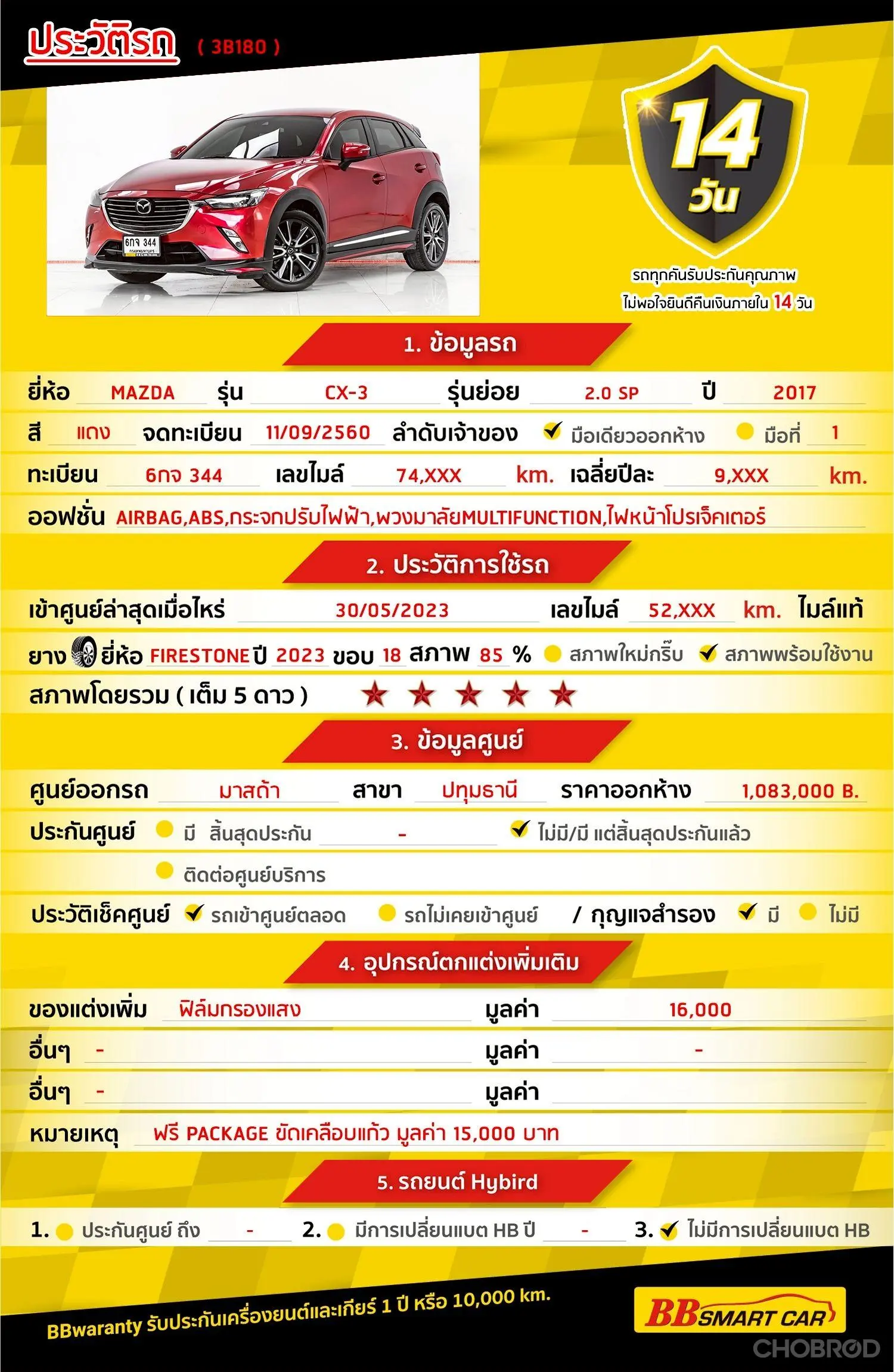 MAZDA CX-3 2.0 SP AT 2017 ออกรถ 0 บาท จัดได้ 389,000 บ. Line:@*******แสดงข้อมูล 🔥 จอง 199 บาท ส่งบัตรประชาชน รู้ผลอนุมัติภายใน 30 นาที ไม่ผ่านคืนเงินจองทุกกรณี 🔥 ซื้อรถกับ BB พร้อมให้คำปรึกษา แก้ทุกปัญหา ให้ทุกเรื่อง บริการ call center 24 ชม. 🔥 BB Care Plus รับประกันหลังการขาย สูงสุด 2 ปี หรือ 20,000 km. 🔥 มีรถให้เลือกมากกว่า 1,800 คัน บีบี3 สาขาบางใหญ่ (ใกล้โลตัสบางใหญ่ ) รหัสรถ 3B180 ราคา 369,000 บ. ผ่อนเพียง 6,512 บ. Brand : MAZDA Year : 2017 Model : CX-3 Grade : 2.0 SP Engine : 2000 CC. Type : เบนซิน Gearbox : A/T Color : แดง Mileage : 74,xxx km. (ซื้อสด ราคานี้ยังไม่รวมค่าดำเนินการ 10,000 บ.) 🚩 Price : 369,000 บาท ยอดจัด : 379,000 บาท เงินดาวน์ : ฟรีเงินดาวน์ ประกันภัย : ฟรีประกันภัย 1 ปี ค่าดำเนินการ : 10,000 บาท รวมออกรถ : 0 บาท ผ่อน 36 = 12,530 บาท ผ่อน 48 = 9,640 บาท ผ่อน 60 = 8,009 บาท ผ่อน 72 = 7,165 บาท ผ่อน 84 = 6,512 บาท *เงื่อนไขเป็นไปตามที่ไฟแนนซ์กำหนด โปรโมชั่นพิเศษ สำหรับลูกค้าเครดิตดี 🚩เลือกรับเรทดอกเบี้ยพิเศษ 📍36 งวด = 1.29% 📍48 งวด = 1.99% 📍60 งวด = 2.39% 📍72 งวด = 3.59% 🔥 เงื่อนไข โปรโมชั่น ดอกเบี้ยเริ่มต้น 1.29% ตลอดอายุสัญญา - ยอดจัดไฟแนนซ์ 300,000-600,0000 บาท - ผ่อนสูงสุด 72 เดือน - เป็นลูกค้าประวัติดี พนักงานประจำ เงินเดือน 20,000 บาท ขึ้นไป - ค่าดำเนินการแคมเปญ 20,000 บาท (รวมในยอดจัดได้) 🎗Car Hightlight มาแล้วค่ะ MAZDA CX-3 เป็นรถที่ครบครันด้วยอุปกรณ์อำนวยความสะดวกสบาย ตอบโจทย์ทุกการใช้งาน ที่มาพร้อมกับรูปลักษณ์ดีไซน์ภายนอกที่สปอร์ตโฉบเฉี่ยว ภายในสปอร์ตหรูหรา ดูล้ำสมัยมากยิ่งขึ้น สนใจเข้ามาดูตัวรถได้ค่ะ รถสภาพป้ายแดงค่ะ ราคาไม่แพง ไมล์แท้ รถดูแลศูนย์ตลอดค่ะ 🎗ภายใน ภายในสะอาดเรียบร้อย ไมล์ Digital เกียร์ Paddle Shift Airbag พวงมาลัย Multifunction เซ็นทรัลล๊อก แอร์ AUTO จอ LCD เล่น DVD กระจกไฟฟ้า พวงมาลัยเพาเวอร์ เบรค ABS Navigator Cruise Control เบาะหนังแท้ วิทยุ - CD 🎗ภายนอก ไม่มีชนหนักหรือพลิกคว่ำค่ะ กระจกมองข้างปรับไฟฟ้า กุญแจรีโมท-สัญญานกันขโมย แอร์ ไฟโปรเจคเตอร์ ไฟซีนอน กระจกมองข้างพับไฟฟ้า กล้องส่องหลัง เซนเซอร์ถอยหลัง ไฟเลี้ยวกระจกมองข้าง ไฟตัดหมอก ให้ความโดดเด่นเป็นเอกลักษณ์ของ MAZDA ทดลองขับแล้วช่วงล่างและเครื่องยนต์ยังแน่นค่ะ 🎗ความคุ้มค่า คัดเลือกคันนี้มาแล้วค่ะสภาพดีมากๆ เทียบกับราคานี้ถือว่าคุ้มค่ามากๆค่ะ มาดูรถไม่ผิดหวังแน่นนอนค่ะ ⭐การรับประกันหลังการขาย BB Care Plus สูงสุด 2 ปี หรือ 20,000 km. ด้วยช่างที่ผ่านการอบรมจากศูนย์ชั้นนำของประเทศ 🎉Special offer เฉพาะ บีบีสมาร์ทคาร์ ที่นี่ที่เดียว ⭐ดอกเบี้ยเริ่มต้น 1.29% มีไฟแนนซ์รองรับหลายที่ค่ะ ⭐ฟรี!! แพคเก็จ ขัดเคลือบแก้ว มูลค่า 15,000 บาท ทุกคัน ⭐อนุมัติไว 30 นาที นำเอกสารมาให้ครบรับรถกลับบ้านทันทีค่ะ ⭐BB Care Plus รับประกันหลังการขาย สูงสุด 2 ปี หรือ 20,000 km. ⭐มี 6 สาขา ในกรุงเทพและปริมณฑลใกล้บ้านท่าน ⭐รถทุกคันผ