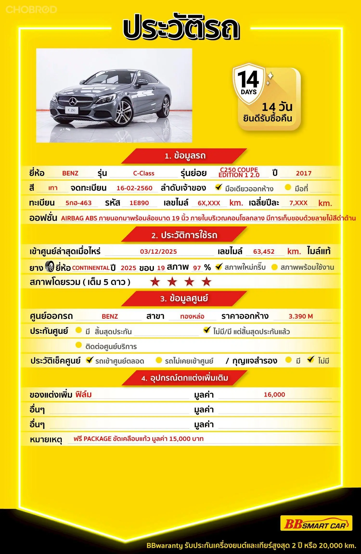 MERCEDES-BENZ C-CLASS C250 COUPE EDITION 1 2.0 W205 AT 2017 ออกรถ 0 บาท จัดได้ 979,000 บ Line:@bbsmartcar 📍BBsmartcar สาขา 1 สี่แยกมไหสวรรย์ 1E890 MERCEDES-BENZ C-CLASS C250 COUPE EDITION 1 2.0 W205 AT 2017 💸price 959,000 บาท *** Highlight *** BENZ C250 COUPE EDITION 1 สีเทา Tenorite Grey ปี 2017 แท้ สปอร์ตหรูหรา ภายในทนสีน้ำตาลสลับดำ (Saddle Brown/Black) หุ้มหนัง ARTICO สลับ DINAMICA microfibre เดินด้ายสีเทอร์ควอยซ์ (Turquoise) แผงคอนโซลตกแต่งด้วยลายไม้สีดำด้าน (Open-pore black ash wood) ตัดกับอลูมิเนียม เพิ่มความโฉบเฉี่ยว หายาก วิ่งน้อยเพียง 64,XXX KM. รถจากศูนย์ BENZ THONGLOR เข้าศูนย์ตามระยะที่กำหนด ประหยัดจากป้ายแดงได้ถึง 2 ล้านบาท 💎รับประกันไมล์แท้ 100% กรณีตรวจพบการกรอไมล์ ยินดีคืนเงินเต็มจำนวน 💎รับประกันโครงสร้างรถ ไม่เคยประสบอุบัติเหตุหนัก พลิกคว่ำ น้ำท่วม หรือไฟไหม้ โครงสร้างและแชสซีอยู่ในสภาพสมบูรณ์ สติกเกอร์และแผ่นเพลทครบถ้วน 💎BB Care Plus รับประกันหลังการขายสูงสุด 2 ปี หรือ 20,000 km. 💎ไม่พอใจ ยินดีคืนเงินภายใน 14 วัน 🔥คลิ๊กที่ลิงก์เพื่อดู วิดีโอคันนี้,ประวัติรถ,รูปภาพภายนอกและรูปภายใน https://www.bbsmartcar.com/web-php/index.php/site/cardetail/20260127BD068A5DE4EC 🔥เรามีรถรุ่นนี้ให้เลือกชมอีก 34 คัน https://www.bbsmartcar.com/web-php/index.php/site/car?name_brand=MERCEDES-BENZ&modelCar=C-CLASS&search=one 🔥มีรถให้เลือกมากกว่า 1,800 คัน https://www.bbsmartcar.com/web-php/index.php/site/home NO. 1E890 Brand. : BENZ Year. : 2017 Model. : C-CLASS Grade. : C250 COUPE EDITION 1 2.0 W205 Engine. : 2000 CC Type. : เบนซิน Gearbox : AT Color. : สีเทา Mileage. : 64,XXX KM. (ซื้อสด ราคานี้ยังไม่รวมค่าดำเนินการ 10,000 บ.) เงินดาวน์ : 0 บาท ประกันภัย : ฟรีประกันภัย 1 ปี ค่าดำเนินการ : 10,000 บาท รวมออกรถ : 0 บาท ผ่อน 72 งวด = 18,712 บาท ผ่อน 84 งวด = 17,432 บาท จุดเด่นออฟชั่น 1 : C250 Coupe’ ใช้เครื่องยนต์เบนซิน 4 สูบแถวเรียง 16 วาล์ว ขนาด 2.0 ลิตร 1,991 ซีซี. พ่วงเทอร์โบ กระบอกสูบ x ระยะช่วงชัก : 82.0 x 93.0 มิลลิเมตร อัตราส่วนกำลังอัด 9.8 : 1 กำลังสูงสุด 211 แรงม้า (PS) ที่ 5,500 รอบ/นาที แรงบิดสูงสุด 350 นิวตันเมตร ที่ 1,200 – 4,000 รอบ/นาที จับคู่กับเกียร์อัตโนมัติ 7 จังหวะ 2 : 7G-Tronic Plus+ มีโหมดการขับขี่ให้เลือก ECO / COMFORT / SPORT / SPORT+ และสามารถตั้งค่าได้เองในโหมด Individual 3 : ผลิตจากสเตนเลส และมีแถบยางสีดำป้องกันการลื่น 🎗ภายใน AIRBAG ABS ภายในบริเวณคอนโซลกลาง มีการเก็บขอบด้วยลายไม้สีดำด้าน ผสานด้วยการตกแต่งด้วยอลูมิเนียม บริเวณแผงควบคุมและประตู มีตราสัญลักษณ์ “Edition 1” แป้นคันเร่งและเบรกโดย AMG เบาะนั่งแบบสปอร์ตหุ้มหนัง ARTICO สลับ DINAMICA microfibre สีน้ำตาลสลับดำ และเดินด้ายสีเทอร์ควอยซ์ พรมในห้องโดยสารเป็นสีน้ำตาลปักด้วยด้ายสีเทอร์ควอยซ์ 🎗ภายนอก ภายนอกมาพร้อมล้อขนาด 19 นิ้ว ปัดน้ำฝนกระจกหน้าแบบพิเศษ (ทำงานอัตโนมัติ) ไฟตัดหมอก ไฟหน้าส่องสว่างอัตโนมัติ (เปิด-ปิด อัตโนมัติ) กระจกมองข้าง สีเทาแบบสปอร์ต กระจกมองข้าง พร้อมไฟเลี้ยวในตัว กระจกมองข้าง ปรับและพับด้วยไฟฟ้า 🎗ความคุ้มค่า สำหรับคันนี้หากเปรียบเทียบราคากับคุณภาพ คันนี้ถื