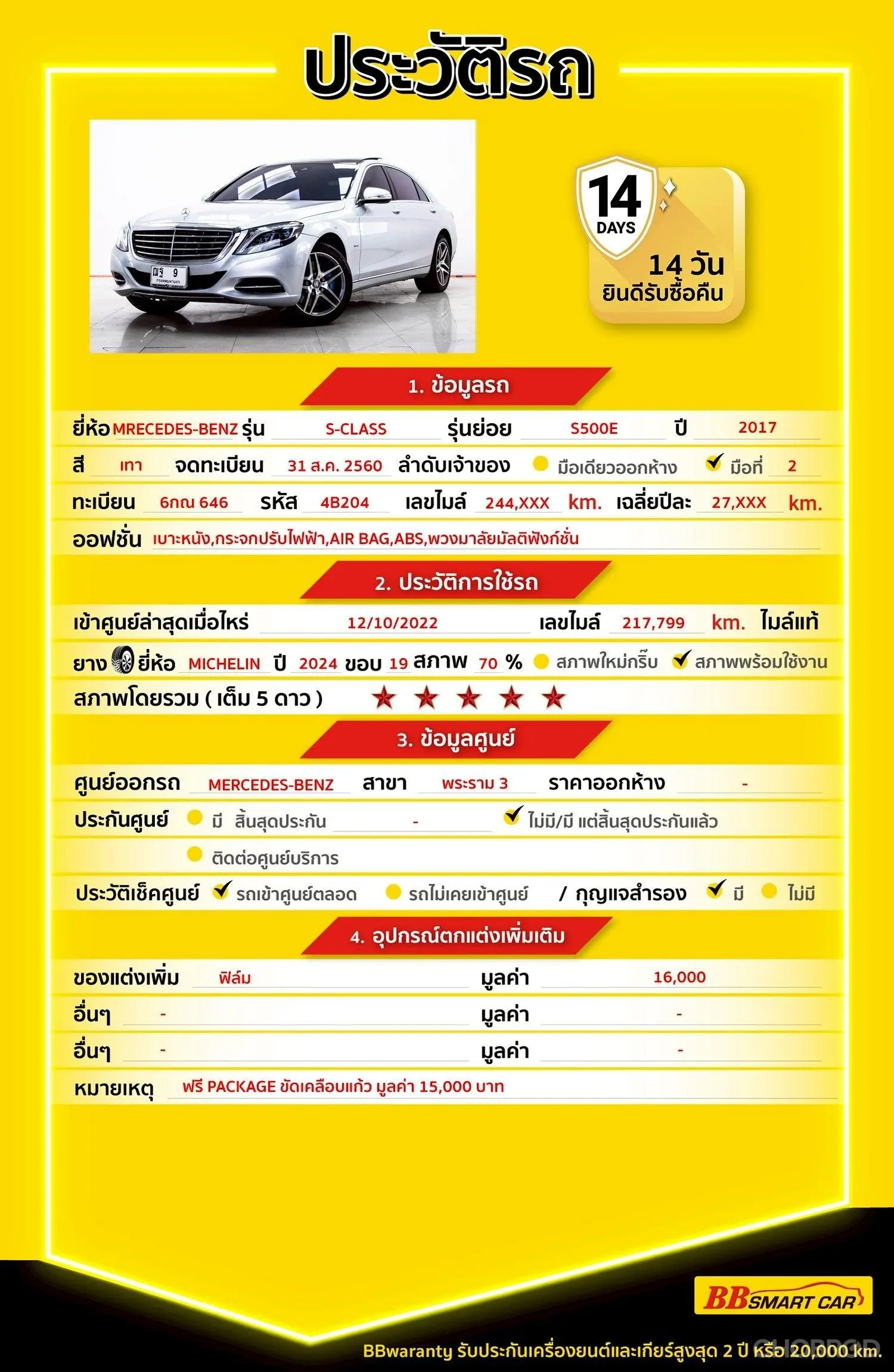 มีการรับประกันจากดีลเลอร์ (6 เดือน) มีบริการช่วยเหลือฉุกเฉินบนท้องถนน 24 ชม. จากดีลเลอร์