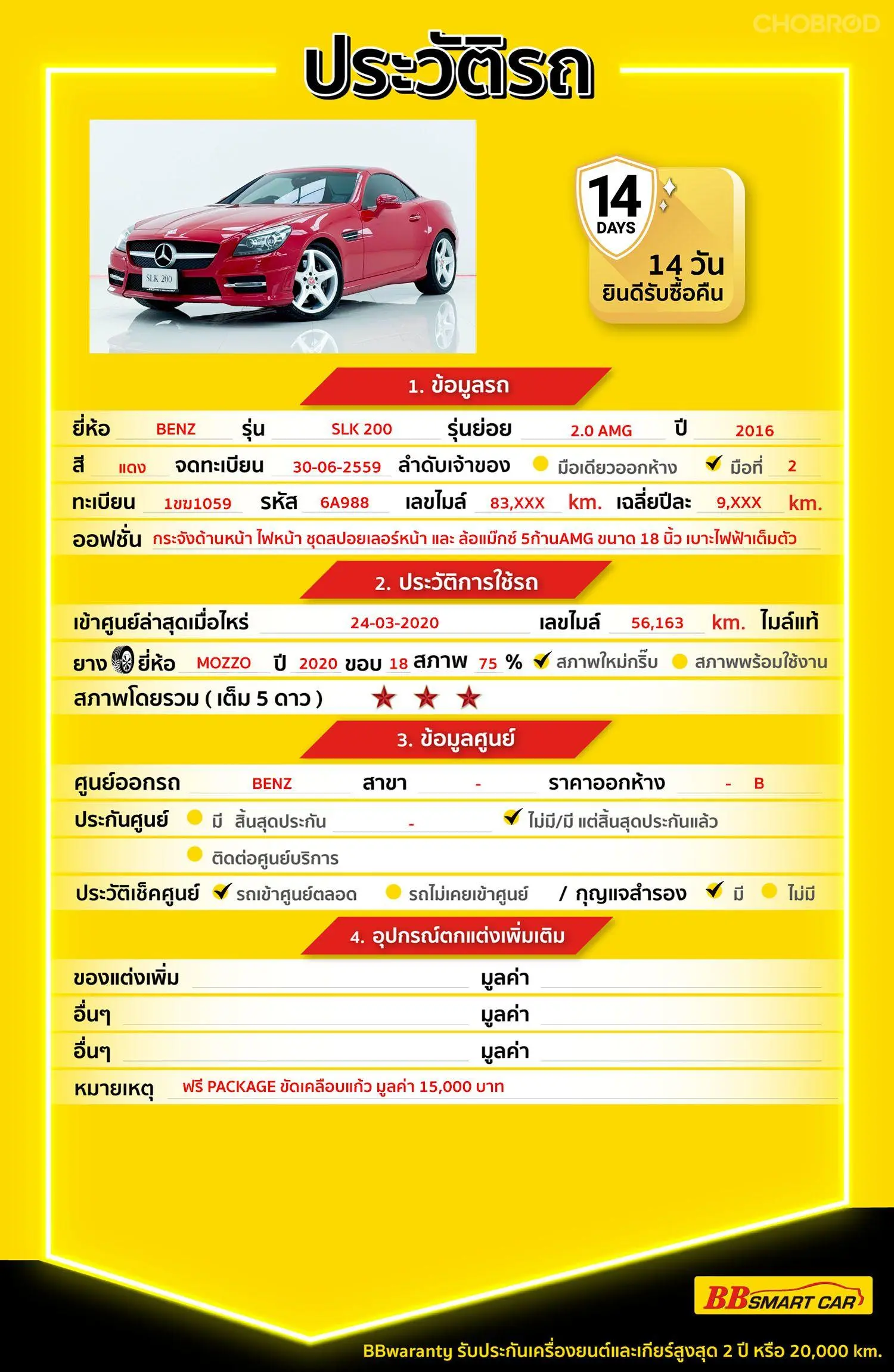 MERCEDES-BENZ SLK-CLASS SLK200 R172 AT 2016 ออกรถ 0 บาท จัดได้ 1,229,000 บ. Line:@*******แสดงข้อมูล 🔥จอง 199 บาท ส่งบัตรประชาชน รู้ผลพิจารณาภายใน 30 นาที ไม่ผ่านคืนเงินจองทุกกรณี 🔥ซื้อรถกับ BB พร้อมให้คำปรึกษา แก้ทุกปัญหา ให้ทุกเรื่อง บริการ call center 24 ชม. 🔥BB Care Plus รับประกันหลังการขาย สูงสุด 2 ปี หรือ 20,000 km.. 🔥มีรถให้เลือกมากกว่า 1,800 คัน สาขา 6 ศูนย์รวมรถยนต์ไอคาร์สยาม กาญจนาภิเษก รหัสรถ 6A988 ราคา 1,209,000 บาท ผ่อนเพียง 21,930 บาท Brand. : MERCEDES-BENZ Year. : 2016 Model. : SLK-CLASS Grade. : SLK200 R172 Engine. : 2,000 CC Type. : เบนซิน Gearbox : AT Color. : แดง Mileage. : 83,xxx KM. (ซื้อสด ราคานี้ยังไม่รวมค่าดำเนินการ 10,000 บ.) 🚩 Price. 1,209,000 บาท ยอดจัด : 1,219,000 บาท เงินดาวน์ : 0 บาท ประกันภัย : ฟรีประกันภัย 1 ปี ค่าดำเนินการ : 10,000 บาท รวมออกรถ : 0 บาท ผ่อน 36 = 40,460 บาท ผ่อน 48 = 31,401 บาท ผ่อน 60 = 26,184 บาท ผ่อน 72 = 23,540 บาท ผ่อน 84 = 21,930 บาท เงื่อนไขเป็นไปตามที่ไฟแนนซ์กำหนด โปรโมชั่นพิเศษ สำหรับลูกค้าเครดิตดี 🚩เลือกรับเรทดอกเบี้ยพิเศษ 📍36 งวด = 1.29 % 📍48 งวด = 1.99 % 📍60 งวด = 2.39 % 📍72 งวด = 3.59 % 🔥 เงื่อนไข โปรโมชั่น ดอกเบี้ยเริ่มต้น 1.29% ตลอดอายุสัญญา - ยอดจัดไฟแนนซ์ 300,000-600,0000 บาท - ผ่อนสูงสุด 72 เดือน - เป็นลูกค้าประวัติดี พนักงานประจำเงินเดือน 20,000 ขึ้นไป - ค่าดำเนินการแคมเปญ 20,000 บาท (รวมในยอดจัดได้) 🎗Car Hightlight รถสวยๆ วันนี้ขอแนะนำ MERCEDES-BENZ SLK-CLASS SLK200 R172 2016 ออฟชั่น 12.2.1 :AMG Sport Package จากกระจังด้านหน้า ไฟหน้า ชุดสปอยเลอร์หน้า และ ล้อแม๊กซ์ 5ก้านAMG ขนาด 18 นิ้ว 12.2.2 :เบาะไฟฟ้าเต็มตัวหุ้มหนังแท้สีดำเย็บโชว์ตะเข็บด้วยด้ายสีแดง +หน่วยบันทึกความจำ 3 ระดับ พร้อมเบลท์แดงเพิ่มความสปอร์ต 12.2.3 :เครื่องยนต์ของ Mercedes Benz SLK 200 AMG package R172 คือเครื่อง 2.0 ลิตร 4 กระบอกสูบ ให้แรงม้าสูงสุด 184 ตัว พร้อมเกียร์อัตโนมัติ 7 สปีด 🎗ภายใน พวงมาลัย Multifunction กระจกไฟฟ้า พวงมาลัยเพาเวอร์ เบรค ABS เซ็นทรัลล๊อก จอ LCD เล่น DVD กระจกมองข้างปรับไฟฟ้า Airbag เบาะไฟฟ้าคู่หน้า แอร์ AUTO 🎗ภายนอก ไฟโปรเจคเตอร์ ไฟตัดหมอก ไฟเลี้ยวกระจกมองข้าง ล้อแม็ก 🎗ความคุ้มค่า สำหรับคันนี้หากเปรียบเทียบราคากับคุณภาพ คันนี้ถือว่าคุ้มค่ามากค่ะ ผ่อนสบายๆก็มีรถขับได้ รถดีมีคุณภาพแบบนี้รีบตัดสินใจซื้อได้เลราคานี้มาไวไปไวนะคะ ⭐️การรับประกันหลังการขาย BB Care Plus สูงสุด 2 ปี หรือ 20,000 km. ด้วยช่างที่ผ่านการอบรมจากศูนย์ชั้นนำของประเทศ 🎉🎉Special offer เฉพาะ บีบีสมาร์ทคาร์ ที่นี่ที่เดียว ⭐️ ดอกเบี้ยเริ่มต้น 1.29% มีไฟแนนซ์รองรับหลายที่ค่ะ ⭐️ ฟรี!! แพคเก็จ ขัดเคลือบแก้ว มูลค่า 15,000 บาท ทุกคัน ⭐️ อนุมัติไว 30 นาที นำเอกสารมาให้ครบรับรถกลับบ้านทันทีค่ะ ⭐️ BB Care Plus รับประกันหลังการขาย สูงสุด 2 ปี หรือ 20,000 km. ⭐️ มี 6 สาขา ในกรุงเทพและปริมณฑลใกล้บ้านท่าน ⭐️ รถทุกคันผ่านตรวจสอบ Inspection เรียบแล้วค่ะ ผ่าน 5 ดาวทุกคันค่ะ ⭐️ เซลล์ทุกท่านเป็นมื