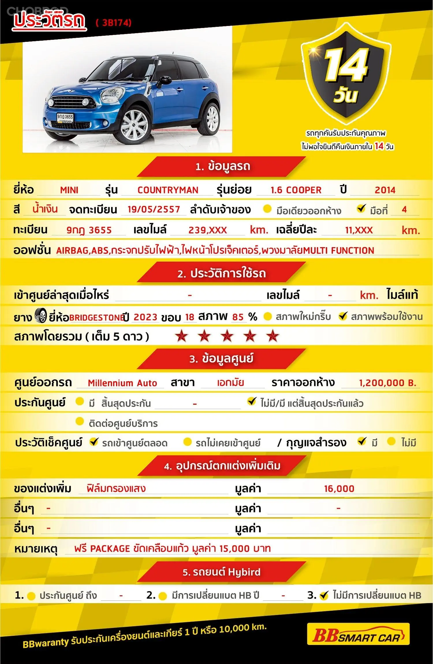 MINI COUNTRYMAN 1.6 COOPER AT 2014 ออกรถ 0 บาท จัดได้ 439,000 บ. Line:@*******แสดงข้อมูล 🔥จอง 199 บาท ส่งบัตรประชาชน รู้ผลอนุมัติภายใน 30 นาที ไม่ผ่านคืนเงินจองทุกกรณี 🔥 ซื้อรถกับ BB พร้อมให้คำปรึกษา แก้ทุกปัญหา ให้ทุกเรื่อง บริการ call center 24 ชม. 🔥 BB Care Plus รับประกันหลังการขาย สูงสุด 2 ปี หรือ 20,000 km. 🔥 มีรถให้เลือกมากกว่า 1,800 คัน สาขา 3 ถนนกาญจนาภิเษก ใกล้โลตัสบางใหญ่ รหัสรถ 3B174 ราคา 419,000 บ. ผ่อนเพียง 7,718 บ. Brand : MINI Year : 2014 Model : COUNTRYMAN Grade : 1.6 COOPER Engine : 1600 cc. Type : เบนซิน Gearbox : A/T Color : น้ำเงิน Mileage : 293,XXX km. (ซื้อสด ราคานี้ยังไม่รวมค่าดำเนินการ 10,000 บ.) 🚩 Price : 419,000 บาท ยอดจัด : 429,000 บาท เงินดาวน์ : ฟรีเงินดาวน์ ประกันภัย : ฟรีประกันภัย 1 ปี ค่าดำเนินการ : 10,000 บาท รวมออกรถ : 0 บาท ผ่อน 36 = 14,238 บาท ผ่อน 48 = 11,051 บาท ผ่อน 60 = 9,215 บาท ผ่อน 72 = 8,284 บาท ผ่อน 84 = 7,718 บาท *เงื่อนไขเป็นไปตามที่ไฟแนนซ์กำหนด โปรโมชั่นพิเศษ สำหรับลูกค้าเครดิตดี 🚩เลือกรับเรทดอกเบี้ยพิเศษ 📍36 งวด = 1.29% 📍48 งวด = 1.99% 📍60 งวด = 2.39% 📍72 งวด = 3.59% 🔥 เงื่อนไข โปรโมชั่น ดอกเบี้ยเริ่มต้น 1.29% ตลอดอายุสัญญา - ยอดจัดไฟแนนซ์ 300,000-600,0000 บาท - ผ่อนสูงสุด 72 เดือน - เป็นลูกค้าประวัติดี พนักงานประจำ เงินเดือน 20,000 บาท ขึ้นไป - ค่าดำเนินการแคมเปญ 20,000 บาท (รวมในยอดจัดได้) 🎗Car Hightlight รถสวยๆ วันนี้ขอแนะนำ MINI CONTRYMAN สวยมากค่ะ จัดทรงมาอย่างดี เป็นแบรนด์ในฝันของสาวๆหลายคน คุณผู้ชายก็ขับได้ค่ะ เครื่องยนต์เบนซิน รถสวย สภาพพร้อมใช้งาน 🎗ภายใน กระจกมองข้างปรับไฟฟ้า วิทยุ - CD แอร์ Airbag กุญแจรีโมท-สัญญานกันขโมย แอร์ AUTO เกียร์ Paddle Shift เซ็นทรัลล๊อก Cruise Control กระจกไฟฟ้า พวงมาลัยเพาเวอร์ พวงมาลัย Multifunction เบรค ABS เบาะหนังแท้ Navigator จอ LCD เล่น DVD 🎗ภายนอก ไม่มีชนหนักหรือพลิกคว่ำค่ะ สภาพดี พร้อมด้วยกระจกมองข้างพับไฟฟ้า ไฟซีนอน เซนเซอร์ถอยหลัง ไฟโปรเจคเตอร์ ไฟตัดหมอก ดูแลรักษาง่าย แถมช่วงล่างยังแน่นๆ ให้ความโดดเด่นเป็นเอกลักษณ์ของ แบรนด์ MINI ทดลองขับแล้วช่วงล่างและเครื่องยนต์ยังแน่นค่ะ 🎗ความคุ้มค่า รถสภาพนี้หายากมากค่ะบอกเลย รถไมล์แท้อีกด้วย คัดเลือกคันนี้มาแล้วค่ะสภาพดีมากๆ เทียบกับราคานี้ถือว่าคุ้มค่ามากๆค่ะ มาดูรถไม่ผิดหวังแน่นนอนค่ะ ⭐การรับประกันหลังการขาย BB Care Plus สูงสุด 2 ปี หรือ 20,000 km. ด้วยช่างที่ผ่านการอบรมจากศูนย์ชั้นนำของประเทศ 🎉Special offer เฉพาะ บีบีสมาร์ทคาร์ ที่นี่ที่เดียว ⭐ดอกเบี้ยเริ่มต้น 1.29% มีไฟแนนซ์รองรับหลายที่ค่ะ ⭐ฟรี!! แพคเก็จ ขัดเคลือบแก้ว มูลค่า 15,000 บาท ทุกคัน ⭐อนุมัติไว 30 นาที นำเอกสารมาให้ครบรับรถกลับบ้านทันทีค่ะ ⭐BB Care Plus รับประกันหลังการขาย สูงสุด 2 ปี หรือ 20,000 km. ⭐มี 6 สาขา ในกรุงเทพและปริมณฑลใกล้บ้านท่าน ⭐รถทุกคันผ่านตรวจสอบ Inspection เรียบแล้วค่ะ ผ่าน 5 ดาวทุกคันค่ะ ⭐เซลล์ทุกท่านเป