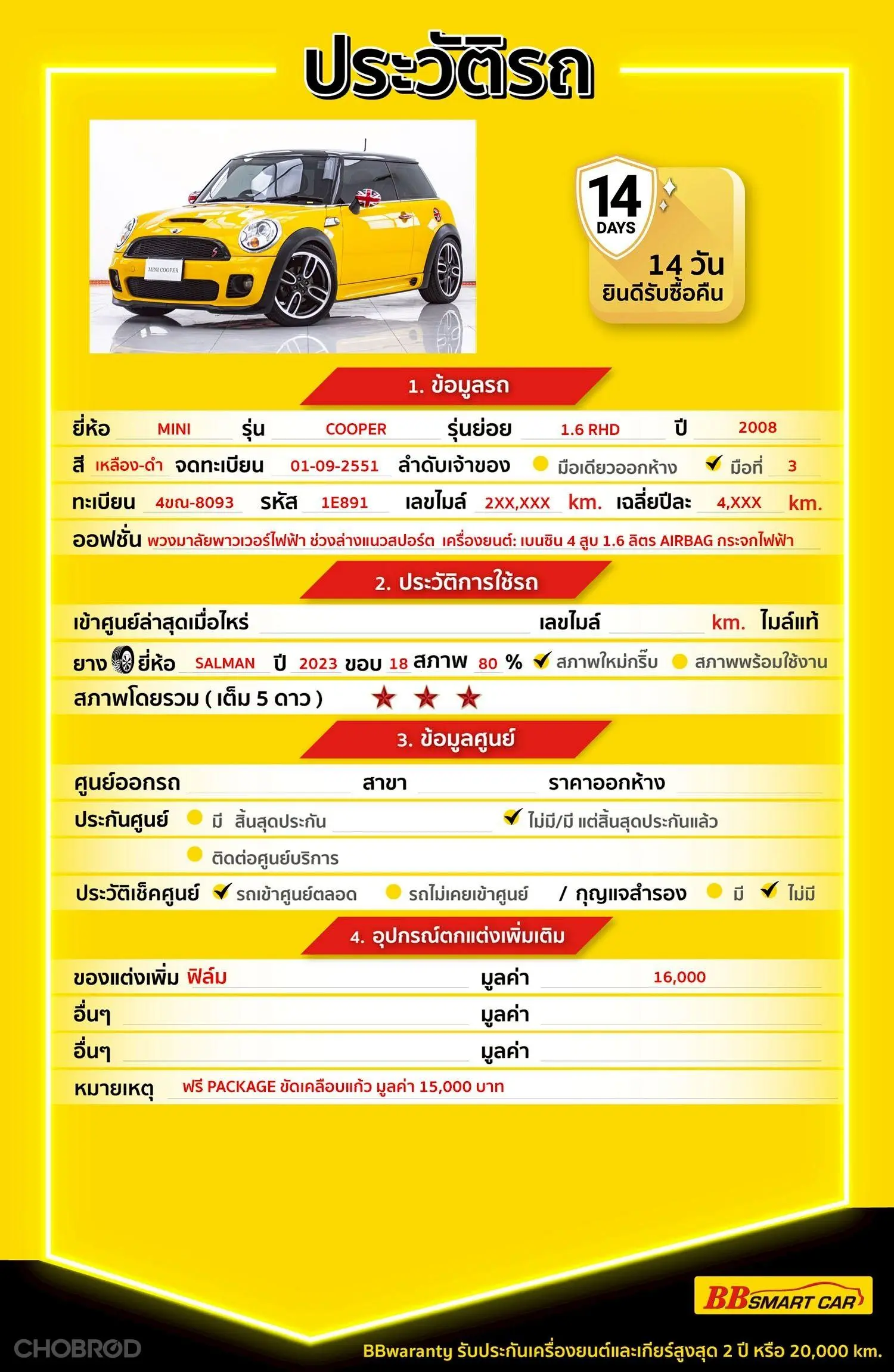 MINI COOPER 1.6 RHD AT 2008 ออกรถ 0 บาท จัดได้ 419,000 บ Line:@bbsmartcar 📍BBsmartcar สาขา 1 สี่แยกมไหสวรรย์ 1E891 MINI COOPER 1.6 RHD AT 2008 💸price 399,000 บาท *** Highlight *** MINI COOPER 1.6 RHD R56 สีเหลือง-ดำ (Yellow-Black) ปี 2008 แท้ รถยนต์ Mini Hatch 3 ประตู สไตล์สปอร์ตที่เป็นที่นิยม RHD (Right Hand Drive) หายาก วิ่งเพียง 86,XXX KM. รถศูนย์ MILENIUM ประวัติรถดี เจ้าของรถซื้อสะสม เน้นจอดเป็นหลัก ประหยัดจากป้ายแดงได้ถึง 2.0 M 💎ราคาออกห้าง 2.2 M 💎รับประกันไมล์แท้ 100% กรณีตรวจพบการกรอไมล์ ยินดีคืนเงินเต็มจำนวน 💎รับประกันโครงสร้างรถ ไม่เคยประสบอุบัติเหตุหนัก พลิกคว่ำ น้ำท่วม หรือไฟไหม้ โครงสร้างและแชสซีอยู่ในสภาพสมบูรณ์ สติกเกอร์และแผ่นเพลทครบถ้วน 💎BB Care Plus รับประกันหลังการขายสูงสุด 2 ปี หรือ 20,000 km. 💎ไม่พอใจ ยินดีคืนเงินภายใน 14 วัน 🔥คลิ๊กที่ลิงก์เพื่อดู วิดีโอคันนี้,ประวัติรถ,รูปภาพภายนอกและรูปภายใน https://www.bbsmartcar.com/web-php/index.php/site/cardetail/202601271BF0571A889F 🔥เรามีรถรุ่นนี้ให้เลือกชมอีก 8 คัน https://www.bbsmartcar.com/web-php/index.php/site/car?name_brand=MINI&search=one 🔥มีรถให้เลือกมากกว่า 1,800 คัน https://www.bbsmartcar.com/web-php/index.php/site/home NO. 1E891 Brand. : MINI Year. : 2008 Model. : COOPER Grade. : 1.6 RHD Engine. : 1600 CC Type. : เบนซิน Gearbox : AT Color. : สีเหลืองดำ Mileage. : 86,XXX KM. (ซื้อสด ราคานี้ยังไม่รวมค่าดำเนินการ 10,000 บ.) เงินดาวน์ : 0 บาท ประกันภัย : ฟรีประกันภัย 1 ปี ค่าดำเนินการ : 10,000 บาท รวมออกรถ : 0 บาท ผ่อน 72 งวด = 6,079 บาท ผ่อน 84 งวด = 5,210 บาท จุดเด่นออฟชั่น 1 : เครื่องยนต์: เบนซิน 4 สูบ 1.6 ลิตร * กำลังสูงสุด: ประมาณ 115 แรงม้า (HP) * การขับเคลื่อน: ล้อหน้า (FWD) * รูปแบบ: Hatchback 3 ประตู (ส่วนใหญ่) 2 : ล้อแมก เบาะหนัง 3 : กระจกไฟฟ้า 🎗ภายใน AIRBAG ABS *เบาะหนัง *พวงมาลัยพาวเวอร์ไฟฟ้า (EPS), ช่วงล่างแนวสปอร์ต, ทรงคลาสสิก 🎗ภายนอก *กระจกมองข้าง ปรับและพับด้วยไฟฟ้า พร้อมไฟเลี้ยวในตัว *ไฟตัดหมอก (หน้า) *ไฟหน้า (ระบบเปิด-ปิดไฟหน้าอัตโนมัติ) *ระบบปัดน้ำฝนด้านหน้า – ด้านหลัง *เสาอากาศแบบสั้น *ล้อ SALMAN ปี 23 ขอบ18 🎗ความคุ้มค่า สำหรับคันนี้หากเปรียบเทียบราคากับคุณภาพ คันนี้ถือว่าคุ้มค่ามากค่ะ ผ่อนสบายๆก็มีรถขับได้ รถดีมีคุณภาพแบบนี้รีบตัดสินใจซื้อได้เลราคานี้มาไวไปไวนะคะ ⭐️การรับประกันหลังการขาย BB Care Plus สูงสุด 2 ปี หรือ 20,000 km. ด้วยช่างที่ผ่านการอบรมจากศูนย์ชั้นนำของประเทศ 🎉Special offer เฉพาะ บีบีสมาร์ทคาร์ ที่นี่ที่เดียว ⭐ดอกเบี้ยเริ่มต้น 1.29% มีไฟแนนซ์รองรับหลายที่ค่ะ ⭐ฟรี!! แพคเก็จ ขัดเคลือบแก้ว มูลค่า 15,000 บาท ทุกคัน ⭐อนุมัติไว 30 นาที นำเอกสารมาให้ครบรับรถกลับบ้านทันทีค่ะ ⭐มี 6 สาขา ในกรุงเทพและปริมณฑลใกล้บ้านท่าน ⭐รถทุกคันผ่านตรวจสอบ Inspection เรียบร้อยแล้วค่ะ ผ่าน 5 ดาวทุกคันค่ะ ⭐เซลล์ทุกท่านเป็นมืออาชีพพร้อมให้บริการทุกท่านแน่นอนค่ะ ⭐เงื่อนไขเป็นไปตามที่ไฟแนนซ์กำหนด เลือกข้อเสนอที่ให้คุณมากกว่าที่อื่น เพราะเราเล็งเห็น