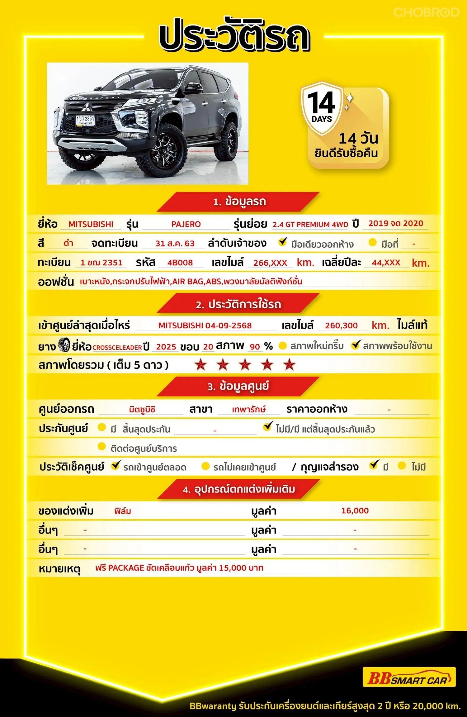 MITSUBISHI PAJERO 2.4 GT PREMIUM 4WD 2020 ออกรถ 0 บาท จัดได้ 759,000 บ. Line:@********แสดงข้อมูล 🔥จอง 199 บาท ส่งบัตรประชาชน รู้ผลพิจารณาภายใน 30 นาที ไม่ผ่านคืนเงินจองทุกกรณี 🔥ซื้อรถกับ BB พร้อมให้คำปรึกษา แก้ทุกปัญหา ให้ทุกเรื่อง บริการ call center 24 ชม. 🔥BB Care Plus รับประกันหลังการขาย สูงสุด 2 ปี หรือ 20,000 km.. 🔥มีรถให้เลือกมากกว่า 1,800 คัน สาขา4 ถนนกาญจนาภิเษกใกล้กับสมาคมปักษ์ใต้ รหัสรถ 4B008 ราคา 739,000 บาท ผ่อนเพียง 12,539 บาท Brand. : MITSUBISHI Year. : 2020 Model. : PAJERO Grade. : 2.4 GT PREMIUM 4WD Engine. : 2400 CC Type. : ดีเซล Gearbox : A/T Color. : ดำ Mileage. : 266,XXX km. (ซื้อสด ราคานี้ยังไม่รวมค่าดำเนินการ 10,000 บ.) 🚩 Price. 739,000 บาท ยอดจัด : 749,000 บาท เงินดาวน์ : 0 บาท ประกันภัย : ฟรีประกันภัย 1 ปี ค่าดำเนินการ : 10,000 บาท รวมออกรถ : 0 บาท ผ่อน 36 งวด = 24,125 บาท ผ่อน 48 งวด = 18,560 บาท ผ่อน 60 งวด = 15,421 บาท ผ่อน 72 งวด = 13,796 บาท ผ่อน 84 งวด = 12,539 บาท **เงื่อนไขเป็นไปตามที่ไฟแนนซ์กำหนด โปรโมชั่นพิเศษ สำหรับลูกค้าเครดิตดีลือกรับเรทดอกเบี้ยพิเศษ 📍36 งวด = 1.29 % 📍48 งวด = 1.99 % 📍60 งวด = 2.39 % 📍72 งวด = 3.59 % 🔥 เงื่อนไข โปรโมชั่น ดอกเบี้ยเริ่มต้น 1.29% ตลอดอายุสัญญา - ยอดจัดไฟแนนซ์ 300,000-600,000 บาท - ผ่อนสูงสุด 72 เดือน - เป็นลูกค้าประวัติดี พนักงานประจำเงินเดือน 20,000 ขึ้นไป - ค่าดำเนินการแคมเปญ 20,000 บาท (รวมในยอดจัดได้) 🎗Car Hightlight รถสวยๆ วันนี้ขอแนะนำ MITSUBISHI PAJERO มั่นใจเรื่องความปลอดภัยในการขับขี่ เป็นรถที่มีความปลอดภัยและมีความแข็งแรงสูงมาก ฟังก์ชันการใช้งานต่างๆ ก็ให้มาแบบไม่ได้กั๊ก มีฟังก์ชันและออปชันต่างๆ ที่ตอบโจทย์การใช้งานจริง 🎗ภายใน Airbag พวงมาลัย Multifunction จอ LCD เล่น DVD แอร์ AUTO เกียร์ Paddle Shift กุญแจรีโมท-สัญญานกันขโมย วิทยุ - CD เบาะหนัง เซ็นทรัลล๊อก กระจกไฟฟ้า เบาะกึ่งหนัง ไมล์ Digital เบรค ABS เบาะไฟฟ้าคู่หน้า พวงมาลัยเพาเวอร์ แอร์ 🎗ภายนอก กระจกมองข้างปรับไฟฟ้า กระจกมองข้างพับไฟฟ้า ไฟโปรเจคเตอร์ บันไดข้าง ไฟตัดหมอก เซนเซอร์รอบคัน ล้อแม็ก ไฟเลี้ยวกระจกมองข้าง กล้องส่องหลัง 🎗ความคุ้มค่า สำหรับคันนี้หากเปรียบเทียบราคากับคุณภาพ คันนี้ถือว่าคุ้มค่ามากค่ะ ผ่อนสบายๆก็มีรถขับได้ รถดีมีคุณภาพแบบนี้รีบตัดสินใจซื้อได้เลราคานี้มาไวไปไวนะคะ ⭐️การรับประกันหลังการขาย BB Care Plus สูงสุด 2 ปี หรือ 20,000 km. ด้วยช่างที่ผ่านการอบรมจากศูนย์ชั้นนำของประเทศ 🎉Special offer เฉพาะ บีบีสมาร์ทคาร์ ที่นี่ที่เดียว ⭐ดอกเบี้ยเริ่มต้น 1.29% มีไฟแนนซ์รองรับหลายที่ค่ะ ⭐ฟรี!! แพคเก็จ ขัดเคลือบแก้ว มูลค่า 15,000 บาท ทุกคัน ⭐อนุมัติไว 30 นาที นำเอกสารมาให้ครบรับรถกลับบ้านทันทีค่ะ ⭐BB Care Plus รับประกันหลังการขาย สูงสุด 2 ปี หรือ 20,000 km. ⭐มี 6 สาขา ในกรุงเทพและปริมณฑลใกล้บ้านท่าน ⭐รถทุกคันผ่านตรวจสอบ Inspection เรียบร้อยแล้วค่ะ ผ่าน 5 ดาวทุกคันค่ะ ⭐เซลล์ทุกท่านเป็นมืออาช