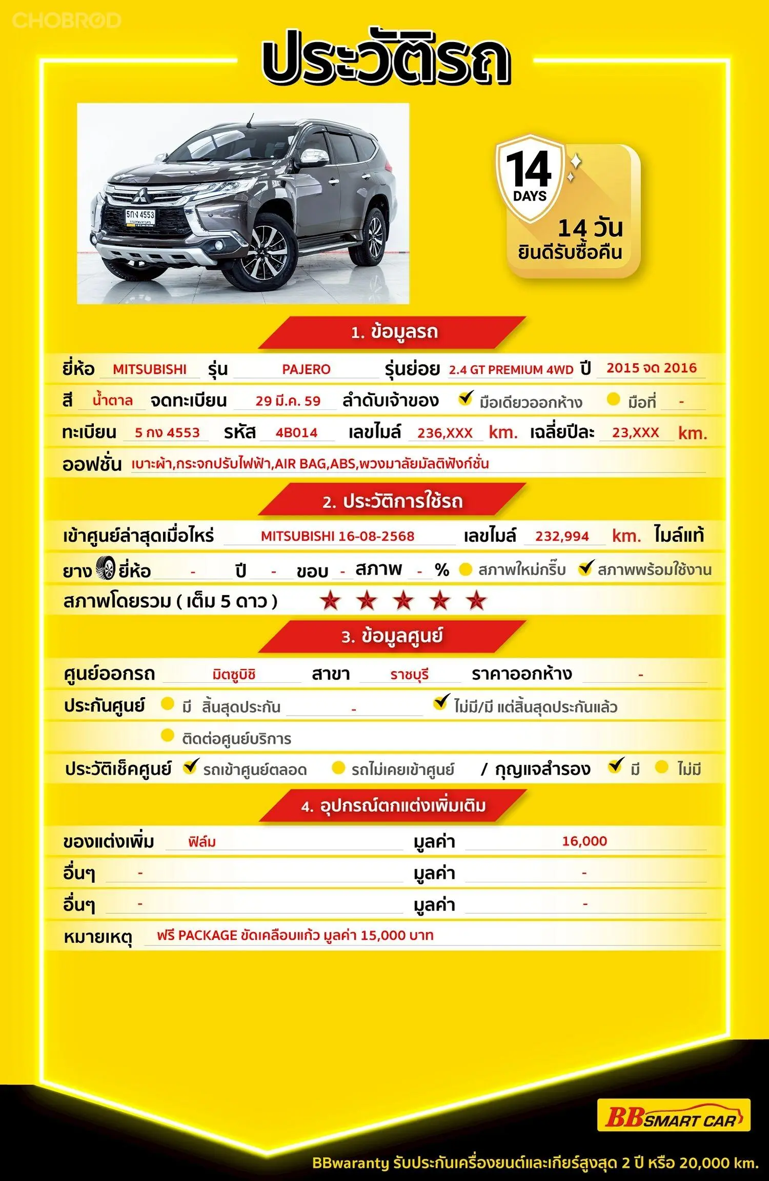 MITSUBISHI PAJERO 2.4 GT PREMIUM 4WD 2016 ออกรถ 0 บาท จัดได้ 539,000 บ. Line:@698epmtg 🔥จอง 199 บาท ส่งบัตรประชาชน รู้ผลพิจารณาภายใน 30 นาที ไม่ผ่านคืนเงินจองทุกกรณี 🔥ซื้อรถกับ BB พร้อมให้คำปรึกษา แก้ทุกปัญหา ให้ทุกเรื่อง บริการ call center 24 ชม. 🔥BB Care Plus รับประกันหลังการขาย สูงสุด 2 ปี หรือ 20,000 km.. 🔥มีรถให้เลือกมากกว่า 1,800 คัน สาขา4 ถนนกาญจนาภิเษกใกล้กับสมาคมปักษ์ใต้ รหัสรถ 4B014 ราคา 519,000 บาท ผ่อนเพียง 9,157 บาท Brand. : MITSUBISHI Year. : 2016 Model. : PAJERO Grade. : 2.4 GT PREMIUM 4WD Engine. : 2400 CC Type. : ดีเซล Gearbox : A/T Color. : น้ำตาล Mileage. : 236,XXX km. (ซื้อสด ราคานี้ยังไม่รวมค่าดำเนินการ 10,000 บ.) 🚩 Price. 519,000 บาท ยอดจัด : 529,000 บาท เงินดาวน์ : 0 บาท ประกันภัย : ฟรีประกันภัย 1 ปี ค่าดำเนินการ : 10,000 บาท รวมออกรถ : 0 บาท ผ่อน 36 งวด = 16,894 บาท ผ่อน 48 งวด = 13,112 บาท ผ่อน 60 งวด = 10,933 บาท ผ่อน 72 งวด = 9,829 บาท ผ่อน 84 งวด = 9,157 บาท **เงื่อนไขเป็นไปตามที่ไฟแนนซ์กำหนด โปรโมชั่นพิเศษ สำหรับลูกค้าเครดิตดีลือกรับเรทดอกเบี้ยพิเศษ 📍36 งวด = 1.29 % 📍48 งวด = 1.99 % 📍60 งวด = 2.39 % 📍72 งวด = 3.59 % 🔥 เงื่อนไข โปรโมชั่น ดอกเบี้ยเริ่มต้น 1.29% ตลอดอายุสัญญา - ยอดจัดไฟแนนซ์ 300,000-600,000 บาท - ผ่อนสูงสุด 72 เดือน - เป็นลูกค้าประวัติดี พนักงานประจำเงินเดือน 20,000 ขึ้นไป - ค่าดำเนินการแคมเปญ 20,000 บาท (รวมในยอดจัดได้) 🎗Car Hightlight รถสวยๆ วันนี้ขอแนะนำ MITSUBISHI PAJERO มั่นใจเรื่องความปลอดภัยในการขับขี่ เป็นรถที่มีความปลอดภัยและมีความแข็งแรงสูงมาก ฟังก์ชันการใช้งานต่างๆ ก็ให้มาแบบไม่ได้กั๊ก มีฟังก์ชันและออปชันต่างๆ ที่ตอบโจทย์การใช้งานจริง 🎗ภายใน พวงมาลัยเพาเวอร์ พวงมาลัย Multifunction เกียร์ Paddle Shift วิทยุ - CD จอ LCD เล่น DVD เบาะกึ่งหนัง เซ็นทรัลล๊อก Airbag เบาะหนัง กระจกไฟฟ้า เบรค ABS เบรกมือไฟฟ้า แอร์ แอร์ AUTO กุญแจรีโมท-สัญญานกันขโมย 🎗ภายนอก กระจกมองข้างปรับไฟฟ้า ไฟเลี้ยวกระจกมองข้าง ไฟตัดหมอก กระจกข้างโครเมี่ยม ไฟโปรเจคเตอร์ กระจกมองข้างพับไฟฟ้า กล้องส่องหลัง บันไดข้าง คิ้วกันสาด เซนเซอร์รอบคัน 🎗ความคุ้มค่า สำหรับคันนี้หากเปรียบเทียบราคากับคุณภาพ คันนี้ถือว่าคุ้มค่ามากค่ะ ผ่อนสบายๆก็มีรถขับได้ รถดีมีคุณภาพแบบนี้รีบตัดสินใจซื้อได้เลราคานี้มาไวไปไวนะคะ ⭐️การรับประกันหลังการขาย BB Care Plus สูงสุด 2 ปี หรือ 20,000 km. ด้วยช่างที่ผ่านการอบรมจากศูนย์ชั้นนำของประเทศ 🎉Special offer เฉพาะ บีบีสมาร์ทคาร์ ที่นี่ที่เดียว ⭐ดอกเบี้ยเริ่มต้น 1.29% มีไฟแนนซ์รองรับหลายที่ค่ะ ⭐ฟรี!! แพคเก็จ ขัดเคลือบแก้ว มูลค่า 15,000 บาท ทุกคัน ⭐อนุมัติไว 30 นาที นำเอกสารมาให้ครบรับรถกลับบ้านทันทีค่ะ ⭐BB Care Plus รับประกันหลังการขาย สูงสุด 2 ปี หรือ 20,000 km. ⭐มี 6 สาขา ในกรุงเทพและปริมณฑลใกล้บ้านท่าน ⭐รถทุกคันผ่านตรวจสอบ Inspection เรียบร้อยแล้วค่ะ ผ่าน 5 ดาวทุกคันค่ะ ⭐เซลล์ทุกท่านเป็นมื