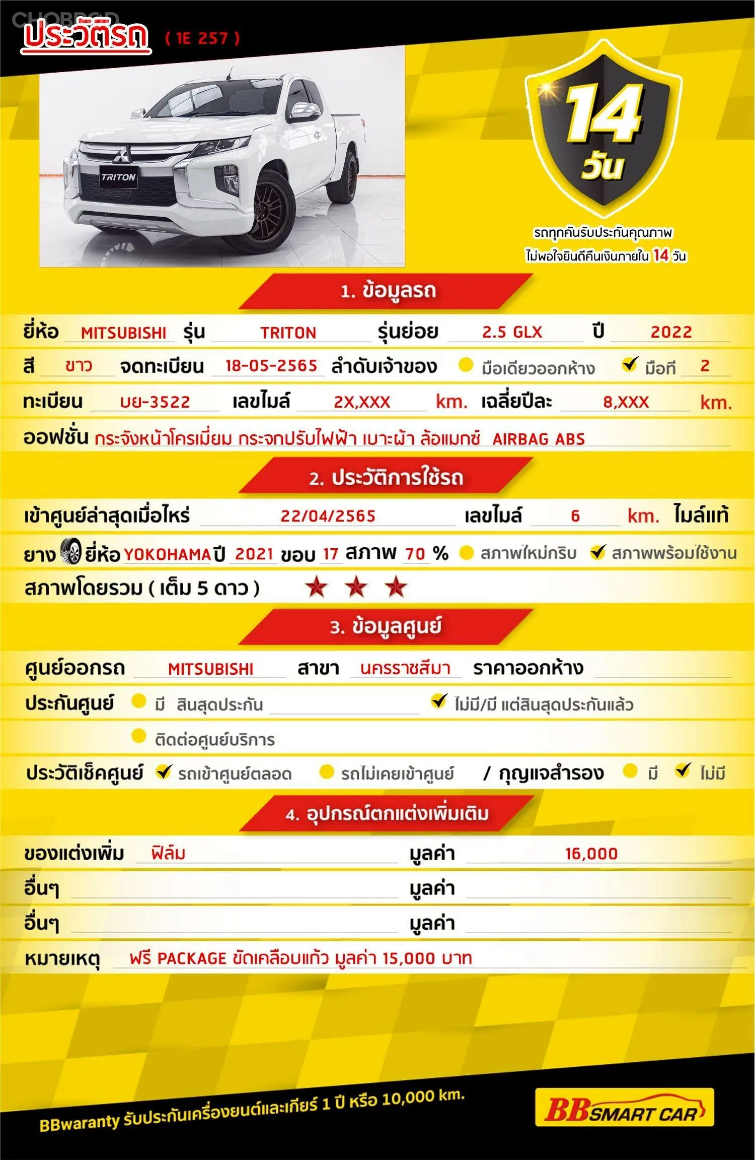 MITSUBISHI TRITON 2.5 GLX MT 2022 ออกรถ 0 บาท จัดได้ 319,000 Line:@**********แสดงข้อมูล 🔥จอง 199 บาท ส่งบัตรประชาชน รู้ผลพิจารณาภายใน 30 นาที ไม่ผ่านคืนเงินจองทุกกรณี 🔥ซื้อรถกับ BB พร้อมให้คำปรึกษา แก้ทุกปัญหา ให้ทุกเรื่อง บริการ call center 24 ชม. 🔥BB Care Plus รับประกันหลังการขาย สูงสุด 2 ปี หรือ 20,000 km.. 🔥มีรถให้เลือกมากกว่า 1,800 คัน สาขา 1 สี่แยกมไหสวรรย์ ใกล้เดอะมอลล์ท่าพระ รหัสรถ 1E257 ราคา 299,000 บาท ผ่อนเพียง 5,865 บาท Brand. : MITSUBISHI Year. : 2022 Model. : TRITON Grade. : 2.5 GLX Engine. : 2500 CC Type. : ดีเซล Gearbox : MT Color. : ขาว Mileage. : 26,XXX KM. (ซื้อสด ราคานี้ยังไม่รวมค่าดำเนินการ 10,000 บ.) 🚩 Price. 299,000 บาท ยอดจัด : 309,000 บาท เงินดาวน์ : 0 บาท ประกันภัย : ฟรีประกันภัย 1 ปี ค่าดำเนินการ : 10,000 บาท รวมออกรถ : 0 บาท ผ่อน 36 งวด = 10,630 บาท ผ่อน 48 งวด = 8,334 บาท ผ่อน 60 งวด = 7,026 บาท ผ่อน 72 งวด = 6,246 บาท ผ่อน 84 งวด = 5,865 บาท เงื่อนไขเป็นไปตามที่ไฟแนนซ์กำหนด โปรโมชั่นพิเศษ สำหรับลูกค้าเครดิตดีลือกรับเรทดอกเบี้ยพิเศษ 📍36 งวด = 2.59 % 📍48 งวด = 2.89 % 📍60 งวด = 3.29 % 📍72 งวด = 4.49 % 🔥 เงื่อนไข โปรโมชั่น ดอกเบี้ยเริ่มต้น 2.59% ตลอดอายุสัญญา - ยอดจัดไฟแนนซ์ 300,000-600,000 บาท - ผ่อนสูงสุด 72 เดือน - เป็นลูกค้าประวัติดี - ค่าดำเนินการแคมเปญ 20,000 บาท (รวมในยอดจัดได้) 🎗Car Hightlight รถสวยๆ วันนี้ขอแนะนำ MITSUBISHI TRITON 2.5 GLX MT 2022 จุดเด่นออฟชั่น 1 : กระจังหน้าโครเมี่ยม 2 : เบาะผ้า 3 : ล้อแมกซ์ 🎗ภายใน กระจกปรับไฟฟ้า AIRBAG ABS 🎗ภายนอก มือเปิดประตูภายนอก สีเดียวกับตัวรถ ไฟท้ายแบบ LED ไฟตัดหมอกคู่หน้า แบบ LED ไฟท้าย แบบ LED 🎗ความคุ้มค่า สำหรับคันนี้หากเปรียบเทียบราคากับคุณภาพ คันนี้ถือว่าคุ้มค่ามากค่ะ ผ่อนสบายๆก็มีรถขับได้ รถดีมีคุณภาพแบบนี้รีบตัดสินใจซื้อได้เลราคานี้มาไวไปไวนะคะ ⭐️การรับประกันหลังการขาย BB Care Plus สูงสุด 2 ปี หรือ 20,000 km. ด้วยช่างที่ผ่านการอบรมจากศูนย์ชั้นนำของประเทศ 🎉Special offer เฉพาะ บีบีสมาร์ทคาร์ ที่นี่ที่เดียว ⭐ดอกเบี้ยเริ่มต้น 2.59% มีไฟแนนซ์รองรับหลายที่ค่ะ ⭐ฟรี!! แพคเก็จ ขัดเคลือบแก้ว มูลค่า 15,000 บาท ทุกคัน ⭐อนุมัติไว 30 นาที นำเอกสารมาให้ครบรับรถกลับบ้านทันทีค่ะ ⭐BB Care Plus รับประกันหลังการขาย สูงสุด 2 ปี หรือ 20,000 km. ⭐มี 6 สาขา ในกรุงเทพและปริมณฑลใกล้บ้านท่าน ⭐รถทุกคันผ่านตรวจสอบ Inspection เรียบร้อยแล้วค่ะ ผ่าน 5 ดาวทุกคันค่ะ ⭐เซลล์ทุกท่านเป็นมืออาชีพพร้อมให้บริการทุกท่านแน่นอนค่ะ เลือกข้อเสนอที่ให้คุณมากกว่าที่อื่น เพราะเราเล็งเห็นแล้ว ที่บีบีสมาร์ทคาร์ ให้คุณได้มากกว่าที่อื่นแน่นอนครับ มาที่เดียวจบทุกปัญหา หลากหลายรุ่นให้เลือกกับบริการที่คุณต้องประทับใจแน่นอนครับ