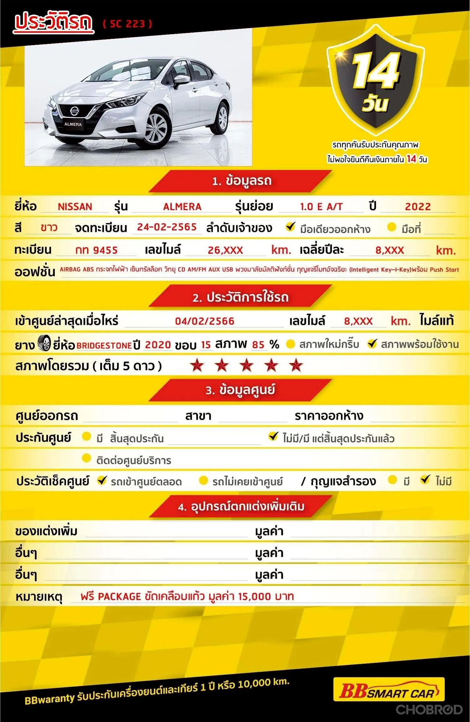 NISSAN ALMERA 1.0 E AT 2022 ออกรถ 0 บาท จัดได้ 369,000 บ. Line:@BBCAR05 🔥จอง 199 บาท ส่งบัตรประชาชน รู้ผลพิจารณาภายใน 30 นาที ไม่ผ่านคืนเงินจองทุกกรณี 🔥ซื้อรถกับ BB พร้อมให้คำปรึกษา แก้ทุกปัญหา ให้ทุกเรื่อง บริการ call center 24 ชม. 🔥BB Care Plus รับประกันหลังการขาย สูงสุด 2 ปี หรือ 20,000 km. 🔥มีรถให้เลือกมากกว่า 1,800 คัน สาขา5 ถ.เศรษฐกิจ ใกล้โลตัสมหาชัย รหัสรถ 5C223 ราคา 349,000 บาท ผ่อนเพียง 6,010 บาท Brand. : NISSAN Year. : 2022 Model. : ALMERA Grade. : 1.0 E Engine. : 1000 CC Type. : เบนซิน Gearbox : AT Color. : ขาว Mileage. : 26,XXX KM. (ซื้อสด ราคานี้ยังไม่รวมค่าดำเนินการ 10,000 บ.) 🚩 Price. 349,000 บาท ยอดจัด : 359,000 บาท เงินดาวน์ : 0 บาท ประกันภัย : ฟรีประกันภัย 1 ปี ค่าดำเนินการ : 10,000 บาท รวมออกรถ : 0 บาท ผ่อน 36 งวด = 11,563 บาท ผ่อน 48 งวด = 8,896 บาท ผ่อน 60 งวด = 7,392 บาท ผ่อน 72 งวด = 6,613 บาท ผ่อน 84 งวด = 6,010 บาท เงื่อนไขเป็นไปตามที่ไฟแนนซ์กำหนด โปรโมชั่นพิเศษ สำหรับลูกค้าเครดิตดีเลือกรับเรทดอกเบี้ยพิเศษ 📍36 งวด = 1.29 % 📍48 งวด = 1.99 % 📍60 งวด = 2.39 % 📍72 งวด = 3.59 % 🔥เงื่อนไข โปรโมชั่น ดอกเบี้ยเริ่มต้น 1.29% ตลอดอายุสัญญา - ยอดจัดไฟแนนซ์ 300,000-600,000 บาท - ผ่อนสูงสุด 72 เดือน - เป็นลูกค้าประวัติดี พนักงานประจำเงินเดือน 20,000 ขึ้นไป - ค่าดำเนินการแคมเปญ 20,000 บาท (รวมในยอดจัดได้) 🎗Car Hightlight รถสวยๆ วันนี้ขอแนะนำ NISSAN ALMERA 1.0 EL AT เบนซิน จุดเด่นออฟชั่น 1 : วิทยุ - CD 2 : คิ้วกันสาด 3 : กระจกมองข้างปรับไฟฟ้า 🎗ภายใน วิทยุ - CD กุญแจรีโมท-สัญญานกันขโมย กระจกไฟฟ้า พวงมาลัยเพาเวอร์ เบาะผ้า กระจกมองข้างปรับไฟฟ้า เซ็นทรัลล๊อก Airbag แอร์ เบรค ABS 🎗ภายนอก คันนี้สีขาว คิ้วกันสาด กระจกมองข้างพับไฟฟ้า 🎗ความคุ้มค่า สำหรับคันนี้หากเปรียบเทียบราคากับคุณภาพ คันนี้ถือว่าคุ้มค่ามากค่ะ ผ่อนสบายๆก็มีรถขับได้ รถดีมีคุณภาพแบบนี้รีบตัดสินใจซื้อได้เลราคานี้มาไวไปไวนะคะ ⭐️การรับประกันหลังการขาย BB Care Plus สูงสุด 2 ปี หรือ 20,000 km. ด้วยช่างที่ผ่านการอบรมจากศูนย์ชั้นนำของประเทศ 🎉Special offer เฉพาะ บีบีสมาร์ทคาร์ ที่นี่ที่เดียว ⭐ดอกเบี้ยเริ่มต้น 1.29% มีไฟแนนซ์รองรับหลายที่ค่ะ ⭐ฟรี!! แพคเก็จ ขัดเคลือบแก้ว มูลค่า 15,000 บาท ทุกคัน ⭐อนุมัติไว 30 นาที นำเอกสารมาให้ครบรับรถกลับบ้านทันทีค่ะ ⭐BB Care Plus รับประกันหลังการขาย สูงสุด 2 ปี หรือ 20,000 km. ⭐มี 6 สาขา ในกรุงเทพและปริมณฑลใกล้บ้านท่าน ⭐รถทุกคันผ่านตรวจสอบ Inspection เรียบแล้วค่ะ ผ่าน 5 ดาวทุกคันค่ะ ⭐เซลล์ทุกท่านเป็นมืออาชีพพร้อมให้บริการทุกท่านแน่นอนค่ะ