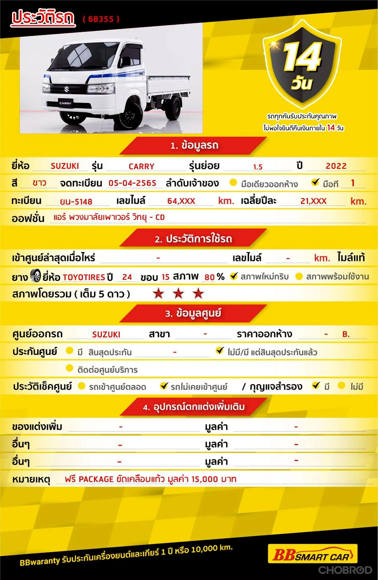SUZUKI CARRY 1.5 MT 2022 ออกรถ 0 บาท จัดได้ 299,000 บ. Line:@*******แสดงข้อมูล 🔥จอง 199 บาท ส่งบัตรประชาชน รู้ผลพิจารณาภายใน 30 นาที ไม่ผ่านคืนเงินจองทุกกรณี 🔥ซื้อรถกับ BB พร้อมให้คำปรึกษา แก้ทุกปัญหา ให้ทุกเรื่อง บริการ call center 24 ชม. 🔥BB Care Plus รับประกันหลังการขาย สูงสุด 2 ปี หรือ 20,000 km.. 🔥มีรถให้เลือกมากกว่า 1,800 คัน สาขา 6 ศูนย์รวมรถยนต์ไอคาร์สยาม กาญจนาภิเษก รหัสรถ 6B355 ราคา 279,000 บาท ผ่อนเพียง 5,485 บาท Brand. : SUZUKI Year. : 2022 Model. : CARRY PICKUP Grade. : 1.5 Engine. : 1,500 CC Type. : เบนซิน Gearbox : MT Color. : ขาว Mileage. : 64,xxx KM. (ซื้อสด ราคานี้ยังไม่รวมค่าดำเนินการ 10,000 บ.) 🚩 Price. 279,000 บาท ยอดจัด : 289,000 บาท เงินดาวน์ : 0 บาท ประกันภัย : ฟรีประกันภัย 1 ปี ค่าดำเนินการ : 10,000 บาท รวมออกรถ : 0 บาท ผ่อน 36 = 9,942 บาท ผ่อน 48 = 7,795 บาท ผ่อน 60 = 6,571 บาท ผ่อน 72 = 5,841 บาท ผ่อน 84 = 5,485 บาท เงื่อนไขเป็นไปตามที่ไฟแนนซ์กำหนด โปรโมชั่นพิเศษ สำหรับลูกค้าเครดิตดี 🚩เลือกรับเรทดอกเบี้ยพิเศษ 📍36 งวด = 2.59 % 📍48 งวด = 2.89 % 📍60 งวด = 3.29 % 📍72 งวด = 4.49 % 🔥 เงื่อนไข โปรโมชั่น ดอกเบี้ยเริ่มต้น 1.29% ตลอดอายุสัญญา - ยอดจัดไฟแนนซ์ 300,000-600,0000 บาท - ผ่อนสูงสุด 72 เดือน - เป็นลูกค้าประวัติดี พนักงานประจำเงินเดือน 20,000 ขึ้นไป - ค่าดำเนินการแคมเปญ 20,000 บาท (รวมในยอดจัดได้) 🎗Car Hightlight รถสวยๆ วันนี้ขอแนะนำ SUZUKI CARRY 1.5 MT 2022 ออฟชั่น 12.2.1 : 1. เครื่องยนต์ดีเซล 2.5 ลิตร คอมมอนเรล รุ่นนี้ใช้เครื่องยนต์ขนาด 2,488 ซีซี ซึ่งในข้อมูลระบุว่าเป็นเครื่องดีเซลคอมมอนเรลแบบ “Mid-Power” สำหรับรุ่น 2.5 MT 4×2 🎗ภายใน แอร์ พวงมาลัยเพาเวอร์ วิทยุ - CD 🎗ภายนอก กระจกมองข้าง 🎗ความคุ้มค่า สำหรับคันนี้หากเปรียบเทียบราคากับคุณภาพ คันนี้ถือว่าคุ้มค่ามากค่ะ ผ่อนสบายๆก็มีรถขับได้ รถดีมีคุณภาพแบบนี้รีบตัดสินใจซื้อได้เลราคานี้มาไวไปไวนะคะ ⭐️การรับประกันหลังการขาย BB Care Plus สูงสุด 2 ปี หรือ 20,000 km. ด้วยช่างที่ผ่านการอบรมจากศูนย์ชั้นนำของประเทศ 🎉🎉Special offer เฉพาะ บีบีสมาร์ทคาร์ ที่นี่ที่เดียว ⭐️ ดอกเบี้ยเริ่มต้น 2.59% มีไฟแนนซ์รองรับหลายที่ค่ะ ⭐️ ฟรี!! แพคเก็จ ขัดเคลือบแก้ว มูลค่า 15,000 บาท ทุกคัน ⭐️ อนุมัติไว 30 นาที นำเอกสารมาให้ครบรับรถกลับบ้านทันทีค่ะ ⭐️ BB Care Plus รับประกันหลังการขาย สูงสุด 2 ปี หรือ 20,000 km. ⭐️ มี 6 สาขา ในกรุงเทพและปริมณฑลใกล้บ้านท่าน ⭐️ รถทุกคันผ่านตรวจสอบ Inspection เรียบแล้วค่ะ ผ่าน 5 ดาวทุกคันค่ะ ⭐️ เซลล์ทุกท่านเป็นมืออาชีพพร้อมให้บริการทุกท่านแน่นอนค่ะ