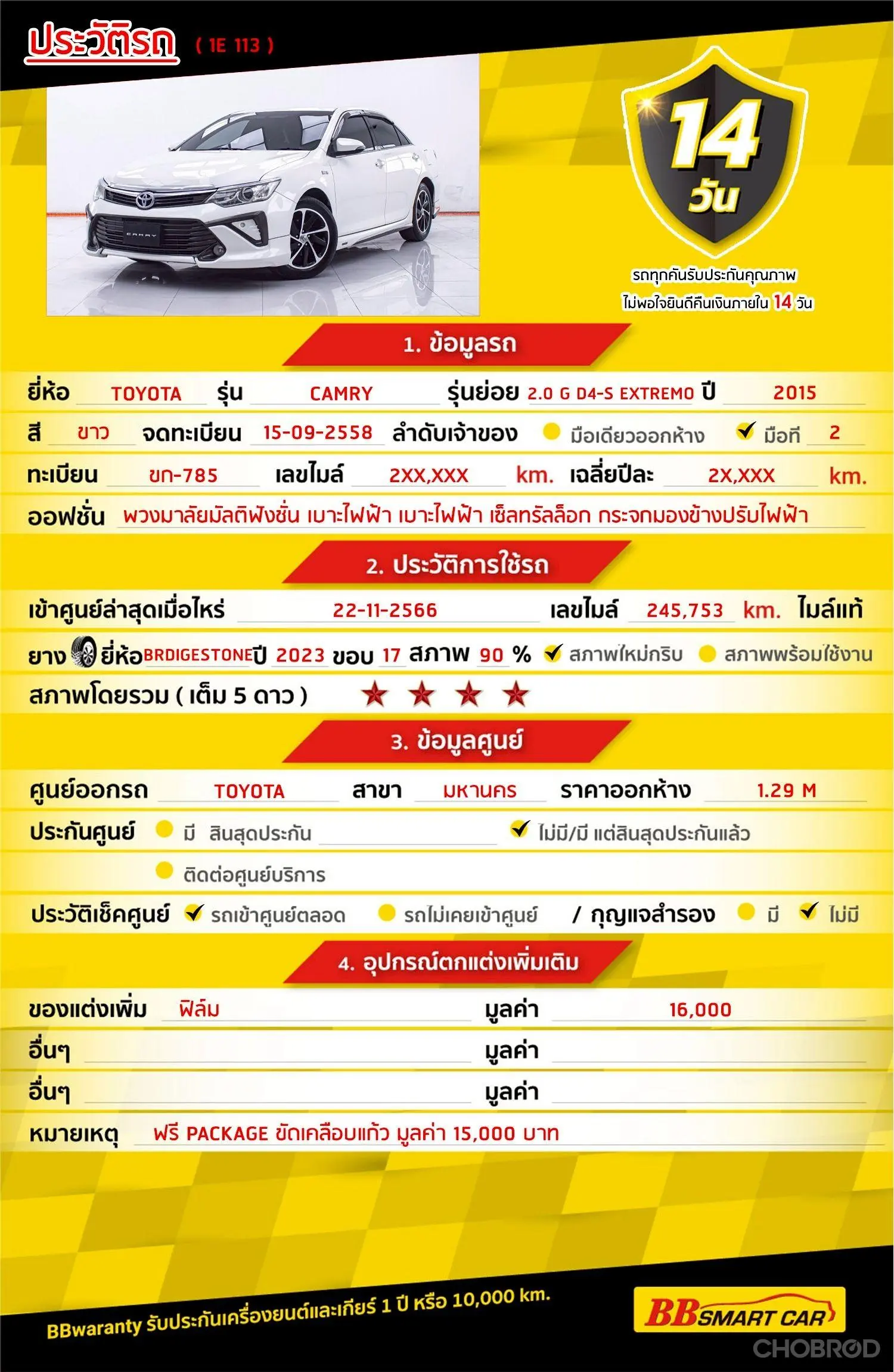 TOYOTA CAMRY 2.0 G D4-S EXTREMO AT 2015 ออกรถ 0 บาท จัดได้ 479,000 Line:@bbsmartcar 🔥จอง 199 บาท ส่งบัตรประชาชน รู้ผลพิจารณาภายใน 30 นาที ไม่ผ่านคืนเงินจองทุกกรณี 🔥ซื้อรถกับ BB พร้อมให้คำปรึกษา แก้ทุกปัญหา ให้ทุกเรื่อง บริการ call center 24 ชม. 🔥BB Care Plus รับประกันหลังการขาย สูงสุด 2 ปี หรือ 20,000 km.. 🔥มีรถให้เลือกมากกว่า 1,800 คัน สาขา 1 สี่แยกมไหสวรรย์ ใกล้เดอะมอลล์ท่าพระ รหัสรถ 1E113 ราคา 459,000 บาท ผ่อนเพียง 8,437 บาท Brand. : TOYOTA Year. : 2015 Model. : CAMRY Grade. : 2.0 G D4-S EXTREMO Engine. : 2000 CC Type. : เบนซิน Gearbox : AT Color. : ขาว Mileage. : 296,XXX KM. (ซื้อสด ราคานี้ยังไม่รวมค่าดำเนินการ 10,000 บ.) 🚩 Price. 459,000 บาท ยอดจัด : 469,000 บาท เงินดาวน์ : 0 บาท ประกันภัย : ฟรีประกันภัย 1 ปี ค่าดำเนินการ : 10,000 บาท รวมออกรถ : 0 บาท ผ่อน 36 งวด = 15,566 บาท ผ่อน 48 งวด = 12,081 บาท ผ่อน 60 งวด = 10,074 บาท ผ่อน 72 งวด = 9,056 บาท ผ่อน 84 งวด = 8,437 บาท เงื่อนไขเป็นไปตามที่ไฟแนนซ์กำหนด โปรโมชั่นพิเศษ สำหรับลูกค้าเครดิตดีลือกรับเรทดอกเบี้ยพิเศษ 📍36 งวด = 1.29 % 📍48 งวด = 1.99 % 📍60 งวด = 2.39 % 📍72 งวด = 3.59 % 🔥 เงื่อนไข โปรโมชั่น ดอกเบี้ยเริ่มต้น 1.29% ตลอดอายุสัญญา - ยอดจัดไฟแนนซ์ 300,000-600,000 บาท - ผ่อนสูงสุด 72 เดือน - เป็นลูกค้าประวัติดี พนักงานประจำเงินเดือน 20,000 ขึ้นไป - ค่าดำเนินการแคมเปญ 20,000 บาท (รวมในยอดจัดได้) 🎗Car Hightlight รถสวยๆ วันนี้ขอแนะนำ TOYOTA CAMRY 2.0 G D4-S EXTREMO AT 2015 จุดเด่นออฟชั่น 1 : พวงมาลัยMuiltifunction 2 : เบาะไฟฟ้า 3 : ไมล์สถานะรถDigital 🎗ภายใน พวงมาลัยปรับระดับได้ – มาตรวัดเรืองแสง – มาตรวัดแสดงอัตราสิ้นเปลืองน้ำมันเชื้อเพลิง – เซ็ลทรัลล็อก – กุญแจรีโมท – กล่องเก็บของด้านหน้า 2 ตำแหน่ง – ที่วางแก้วน้ำ – ช่องเก็บของใต้เบาะนั่งด้านหลัง – ช่องเก็บของหลังเบาะ – ช่องจ่ายไฟสำรอง 🎗ภายนอก – กระจกไฟฟ้า – กระจกมองข้างปรับไฟฟ้า – แผงบังแดดพร้อมกระจกแต่งหน้าแบบมีฝาปิด – มือเปิดประตูภายนอก สีเดียวกับตัวรถ – ไฟ Daytime Running Lights (LED) – ล้ออัลลอย (17 นิ้ว) 🎗ความคุ้มค่า สำหรับคันนี้หากเปรียบเทียบราคากับคุณภาพ คันนี้ถือว่าคุ้มค่ามากค่ะ ผ่อนสบายๆก็มีรถขับได้ รถดีมีคุณภาพแบบนี้รีบตัดสินใจซื้อได้เลราคานี้มาไวไปไวนะคะ ⭐️การรับประกันหลังการขาย BB Care Plus สูงสุด 2 ปี หรือ 20,000 km. ด้วยช่างที่ผ่านการอบรมจากศูนย์ชั้นนำของประเทศ 🎉Special offer เฉพาะ บีบีสมาร์ทคาร์ ที่นี่ที่เดียว ⭐ดอกเบี้ยเริ่มต้น 1.29% มีไฟแนนซ์รองรับหลายที่ค่ะ ⭐ฟรี!! แพคเก็จ ขัดเคลือบแก้ว มูลค่า 15,000 บาท ทุกคัน ⭐อนุมัติไว 30 นาที นำเอกสารมาให้ครบรับรถกลับบ้านทันทีค่ะ ⭐BB Care Plus รับประกันหลังการขาย สูงสุด 2 ปี หรือ 20,000 km. ⭐มี 6 สาขา ในกรุงเทพและปริมณฑลใกล้บ้านท่าน ⭐รถทุกคันผ่านตรวจสอบ Inspection เรียบร้อยแล้วค่ะ ผ่าน 5 ดาวทุกคันค่ะ ⭐เซลล์ทุกท่านเป็นมืออาชีพพร้อมให้บริการทุกท่านแน่นอนค่ะ เลือกข้อเสนอที่ให้คุณมากก