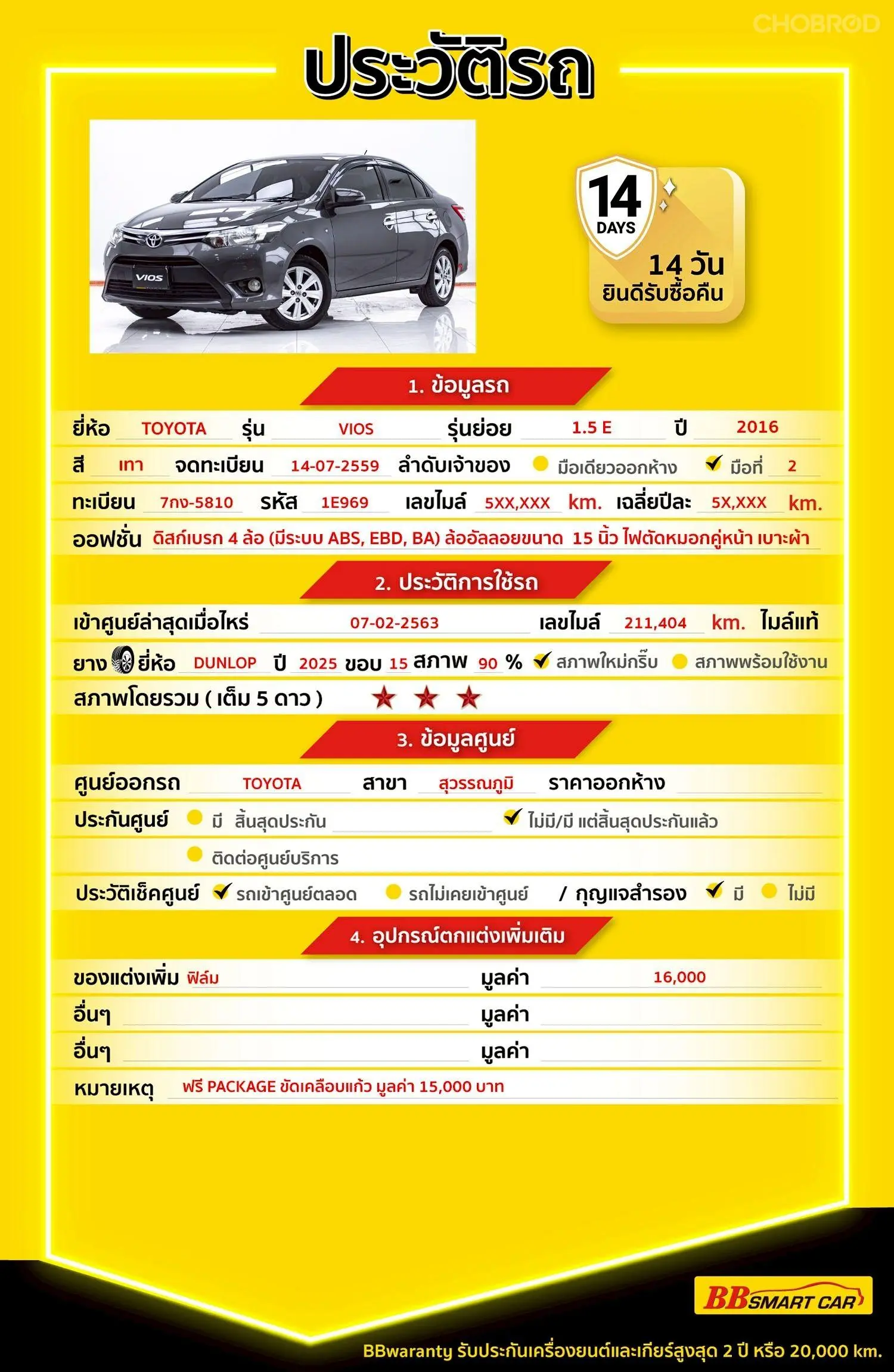 มีการรับประกันจากดีลเลอร์ (6 เดือน) มีบริการช่วยเหลือฉุกเฉินบนท้องถนน 24 ชม. จากดีลเลอร์