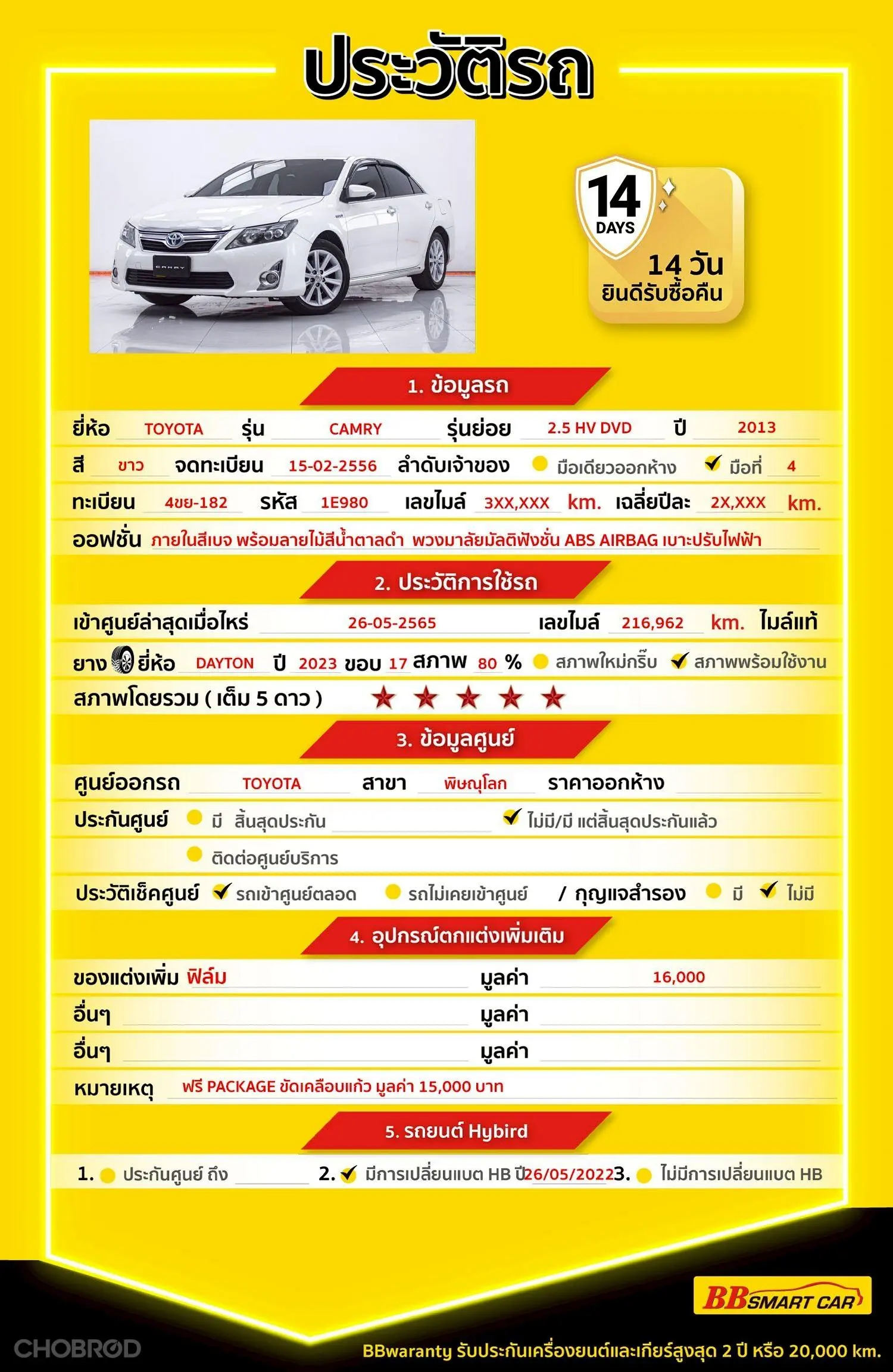 TOYOTA CAMRY, 2.5 HV DVD AT 2013 ออกรถ 0 บาท จัดได้ 359,000 บ Line:@bbsmartcar 🔥มีรถให้เลือกมากกว่า 1,800 คัน 🔥รถทุกคันผ่านตรวจสอบ Inspection เรียบร้อยแล้วค่ะ ผ่าน 5 ดาวทุกคันค่ะ 🔥ซื้อรถกับ BB พร้อมให้คำปรึกษา แก้ทุกปัญหา ให้ทุกเรื่อง บริการ call center 24 ชม. 🔥BB Care Plus รับประกันหลังการขาย สูงสุด 2 ปี หรือ 20,000 km. 🔥ฟรี!! แพคเก็จ ขัดเคลือบแก้ว มูลค่า 15,000 บาท ทุกคัน 🔥มี 6 สาขา ในกรุงเทพและปริมณฑลใกล้บ้านท่าน สาขา 1 สี่แยกมไหสวรรย์ ใกล้เดอะมอลล์ท่าพระ รหัสรถ 1E980 ราคา 339,000 บาท ผ่อนเพียง 6,780 บาท Brand. : TOYOTA Year. : 2013 Model. : CAMRY Grade. : 2.5 HV DVD Engine. : 2500 CC Type. : เบนซิน+ไฟฟ้า Gearbox : AT Color. : ขาว Mileage. : 304,XXX KM. (ซื้อสด ราคานี้ยังไม่รวมค่าดำเนินการ 10,000 บ.) 🚩 Price. 339,000 บาท ยอดจัด : 349,000 บาท เงินดาวน์ : 0 บาท ประกันภัย : ค่าดำเนินการ : 10,000 บาท รวมออกรถ : 0 บาท ผ่อน 36 งวด =12,006 บาท ผ่อน 48 งวด = 9,414 บาท ผ่อน 60 งวด = 8,091 บาท ผ่อน 72 งวด = 7,210 บาท ผ่อน 84 งวด = 6,780 บาท เงื่อนไขเป็นไปตามที่ไฟแนนซ์กำหนด โปรโมชั่นพิเศษ สำหรับลูกค้าเครดิตดีลือกรับเรทดอกเบี้ยพิเศษ 📍36 งวด = 1.29 % 📍48 งวด = 1.99 % 📍60 งวด = 2.39 % 📍72 งวด = 3.59 % 🔥 เงื่อนไข โปรโมชั่น ดอกเบี้ยเริ่มต้น 1.29% ตลอดอายุสัญญา - ยอดจัดไฟแนนซ์ 300,000-600,000 บาท - ผ่อนสูงสุด 72 เดือน - เป็นลูกค้าประวัติดี พนักงานประจำเงินเดือน 20,000 ขึ้นไป - ค่าดำเนินการแคมเปญ 20,000 บาท (รวมในยอดจัดได้) 🎗Car Hightlight รถสวยๆ วันนี้ขอแนะนำ TOYOTA CAMRY, 2.5 HV DVD AT 2013 จุดเด่นออฟชั่น 1 : พวงมาลัยMuiltifunction 2 : ไมล์สถานะรถDigital 3 : เบาะปรับไฟฟ้า 🎗ภายใน *เบาะหุ้มหนัง *ภายในสีเบจ พร้อมลายไม้สีน้ำตาลดำ *พวงมาลัยมัลติฟังก์ชั่น ดีไซน์ใหม่ *ควบคุมการทำงานของเครื่องเสียงจอแสดงข้อมูลรวม *กระจกมองข้างพับปรับไฟฟ้า Pushstart ABS AIRBAG 🎗ภายนอก *กระจกมองข้างสีเดียวกับตัวรถ *ไฟหน้า-ไฟท้ายส่องสว่างแบบ LED *ล้อDaYTON ปี 23 ขอบ 17 *ไม่มีน้ำท่วม ไม่เคยชนหนัก 🎗ความคุ้มค่า สำหรับคันนี้หากเปรียบเทียบราคากับคุณภาพ คันนี้ถือว่าคุ้มค่ามากค่ะ ผ่อนสบายๆก็มีรถขับได้ รถดีมีคุณภาพแบบนี้รีบตัดสินใจซื้อได้เลราคานี้มาไวไปไวนะคะ